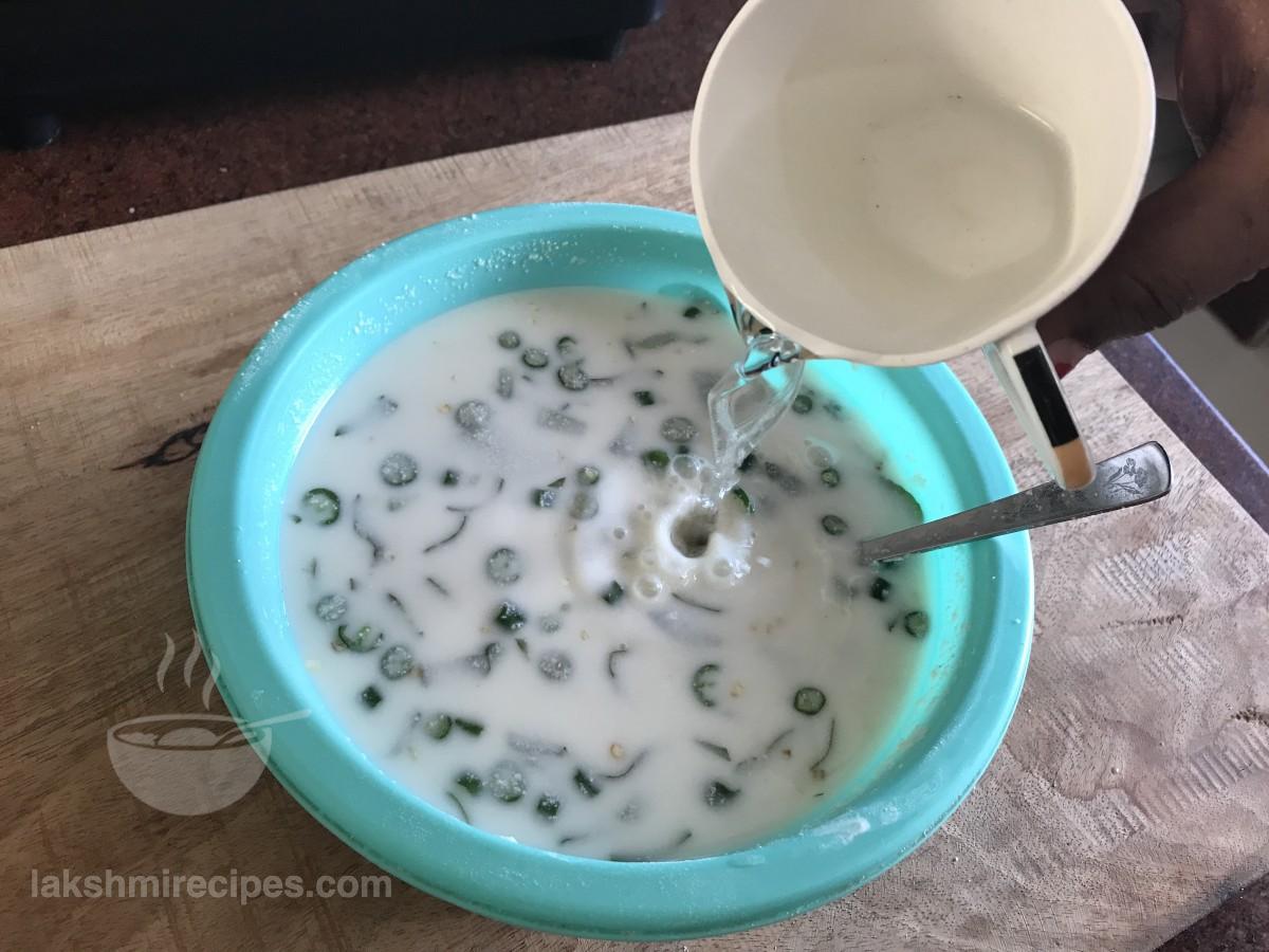 - अब और पानी डालकर इस घोल को एकदम पतला कर लें ताकि ये आसनी से गिरकर तावा पर फैल सके।