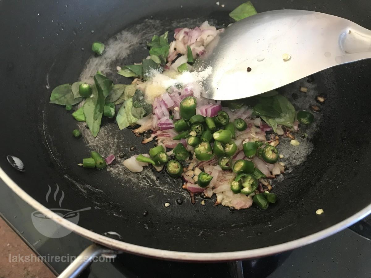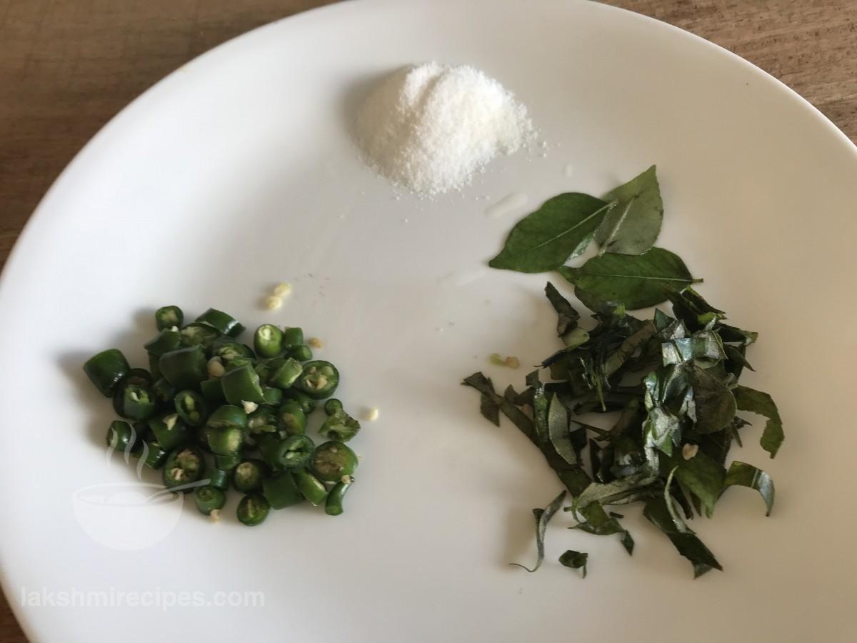 - अब इसमें नमक, करी पत्ता और हरी मिर्च डालें और फिर मिला दें।