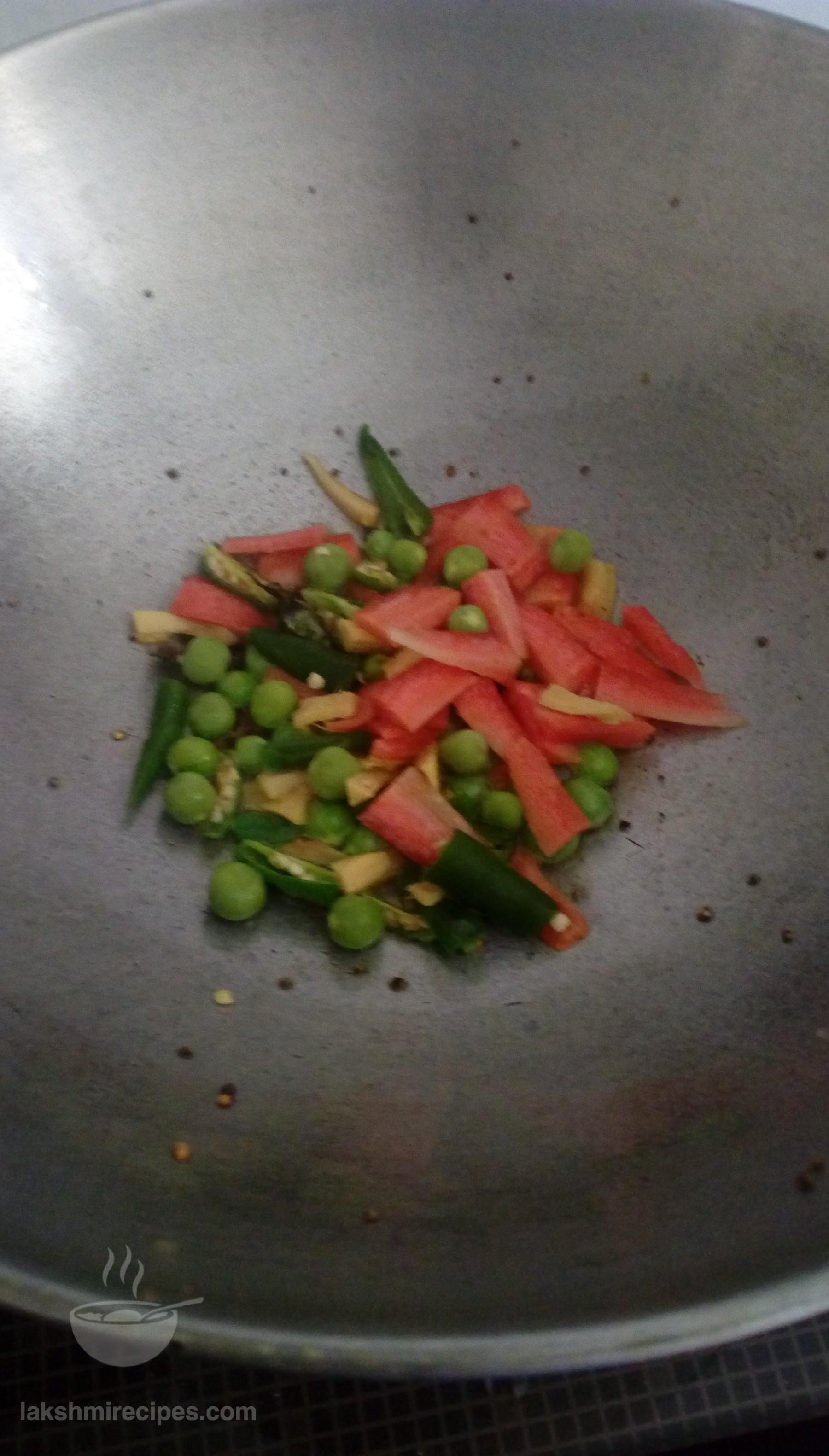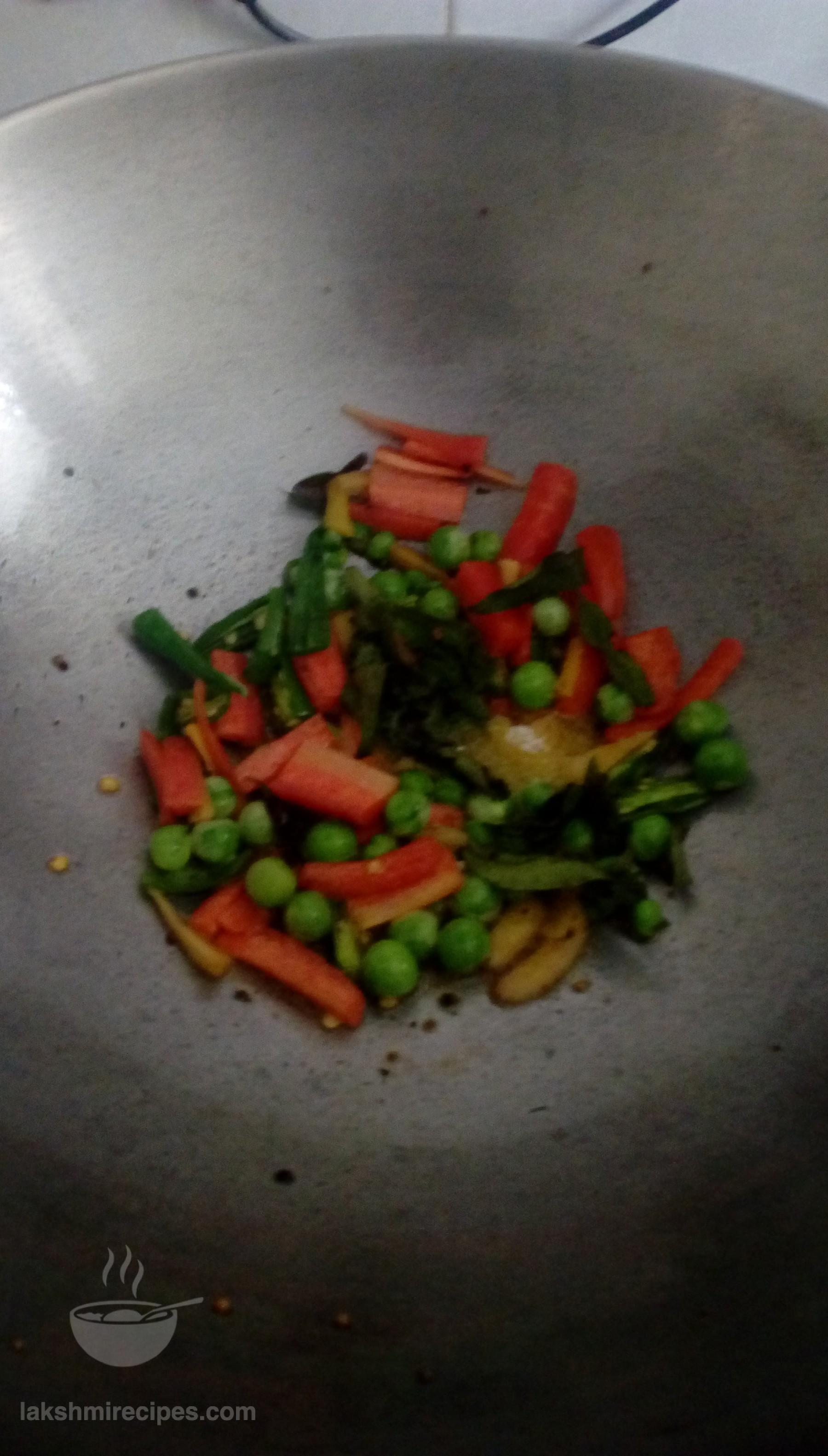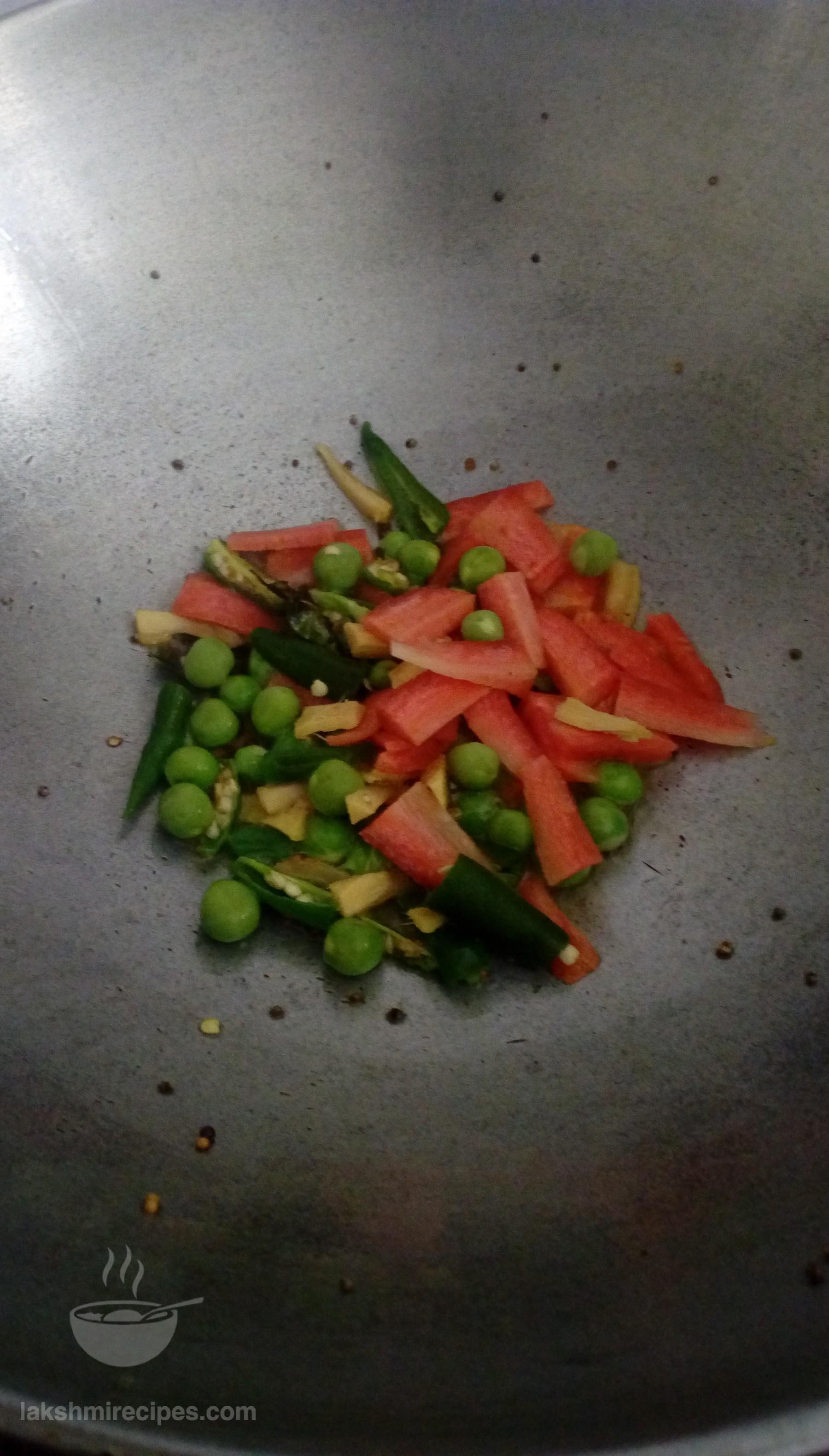 - Then add chopped ginger (adrak), green chillis (hari mirch), carrot (gajar) and green peas (hari matar) to the kadhai. Add a little salt and stir allowing the vegetables to cook till they become tender.