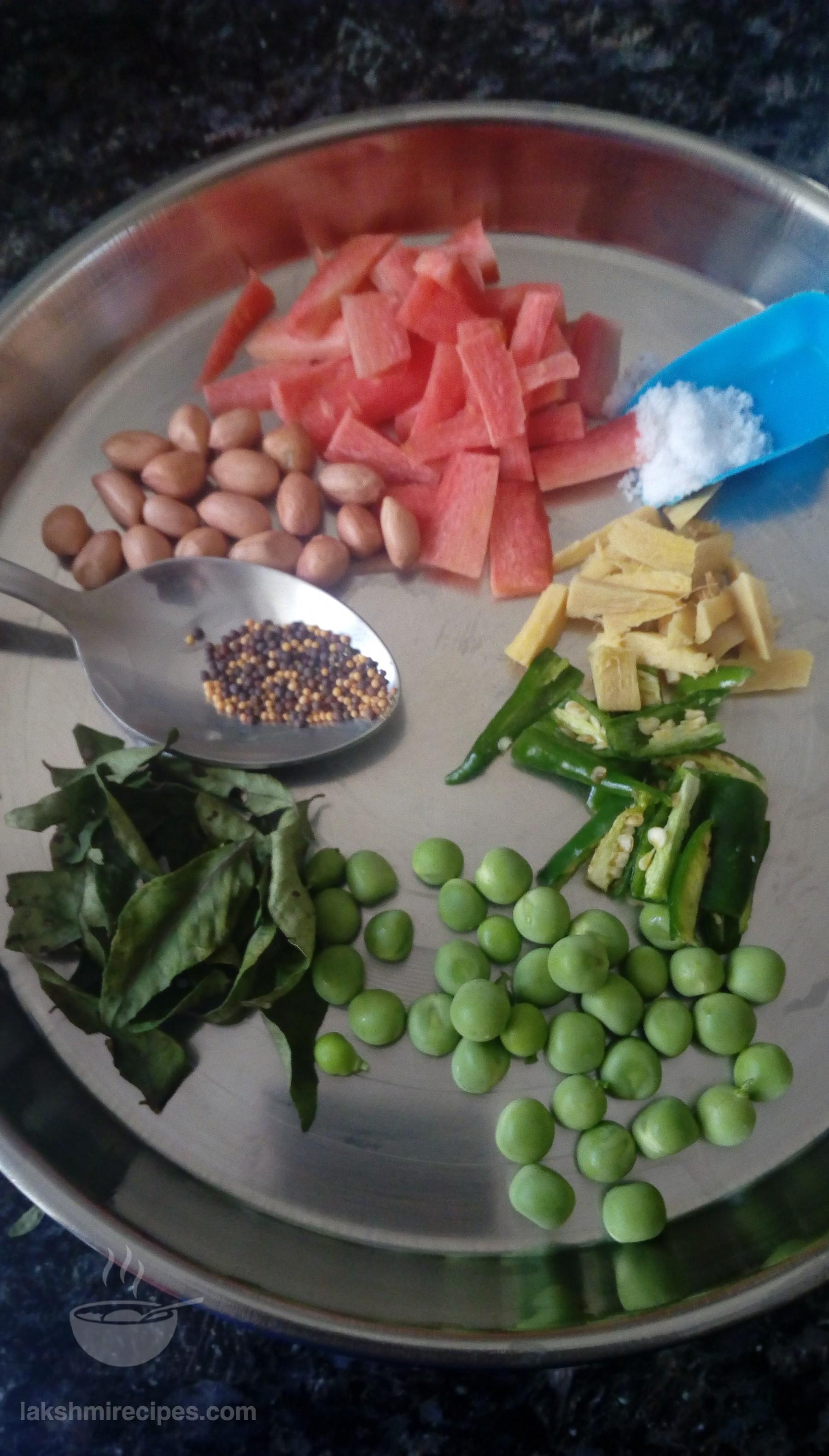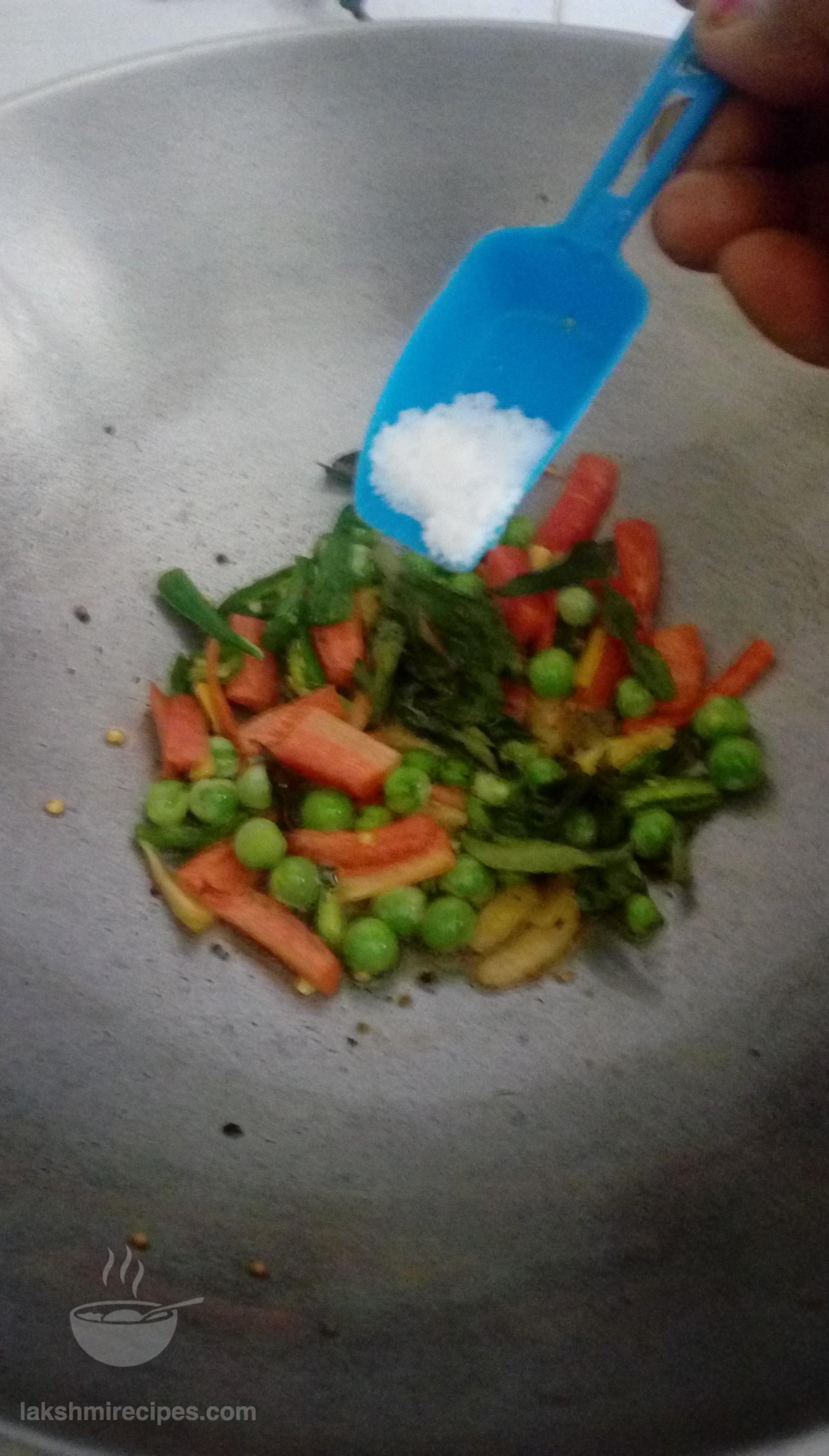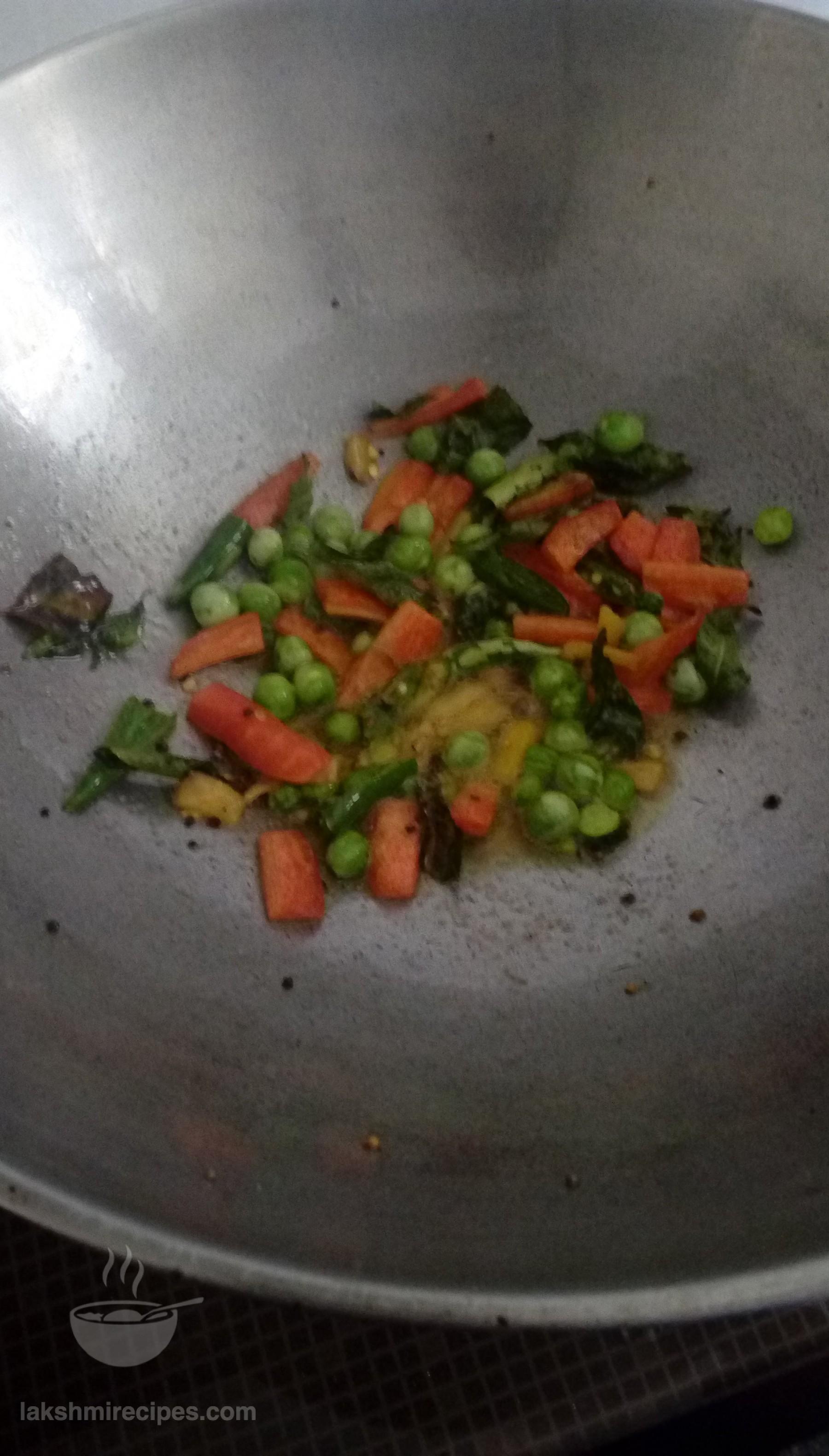 - Then add chopped ginger (adrak), green chillis (hari mirch), carrot (gajar) and green peas (hari matar) to the kadhai. Add a little salt and stir allowing the vegetables to cook till they become tender.