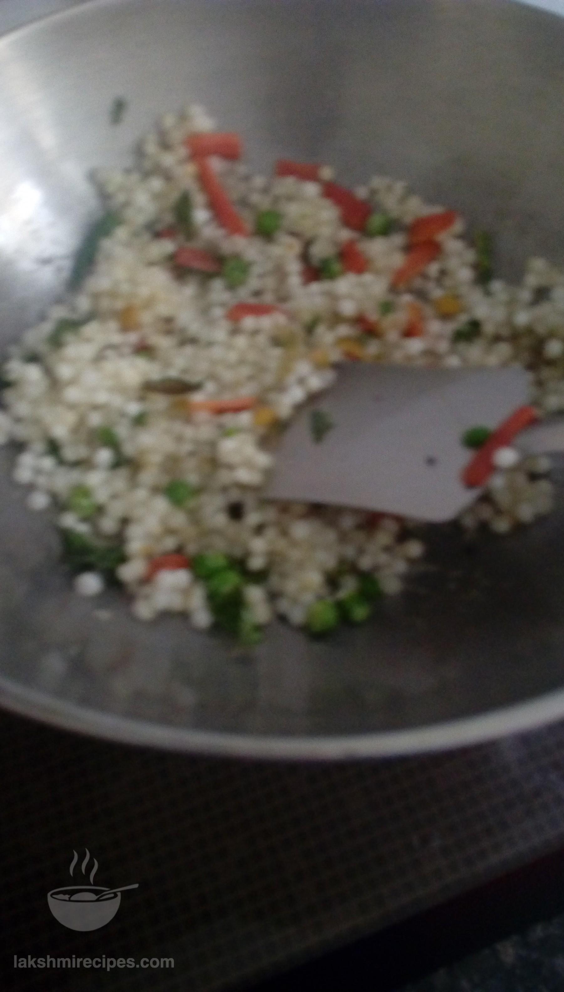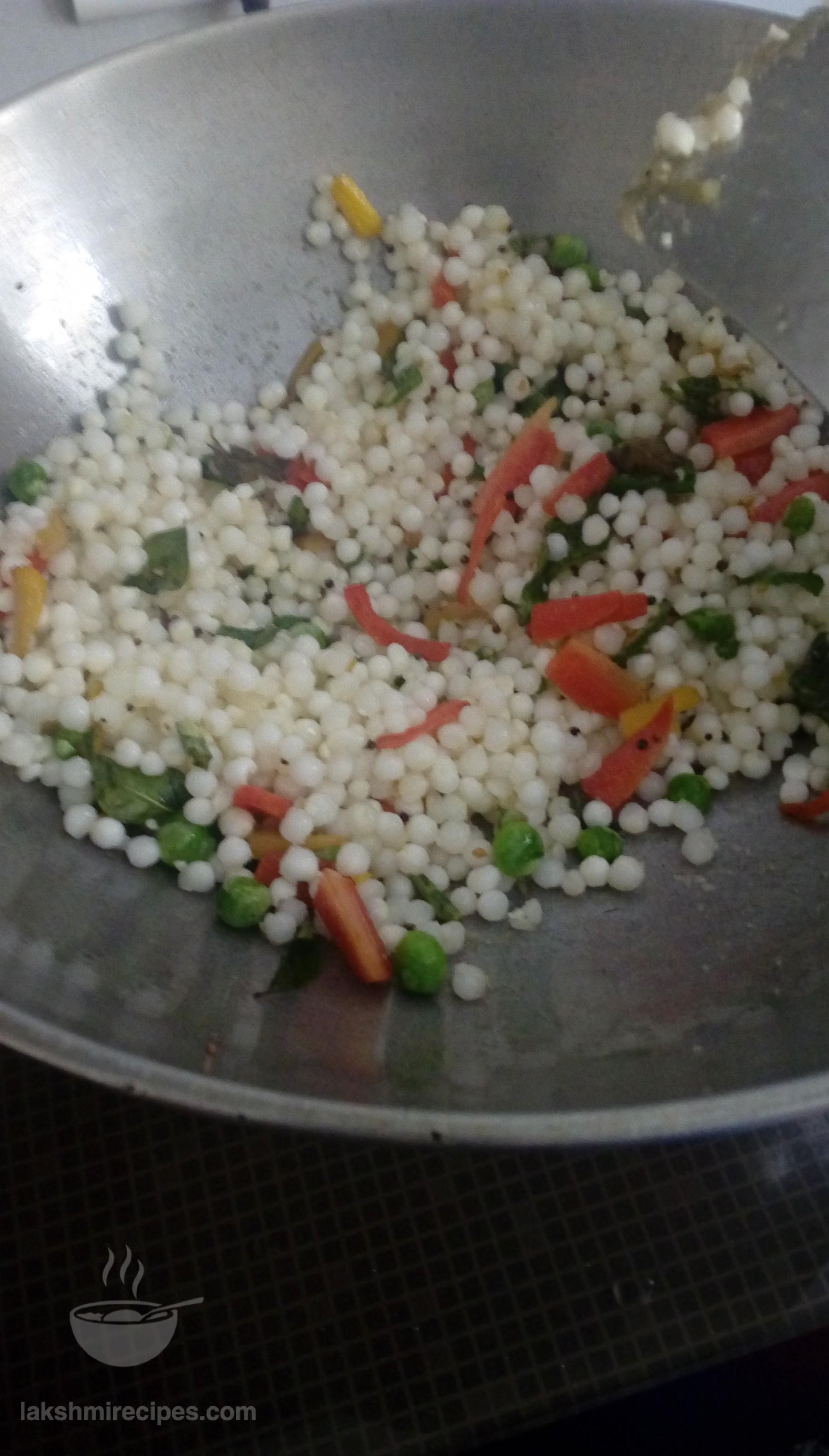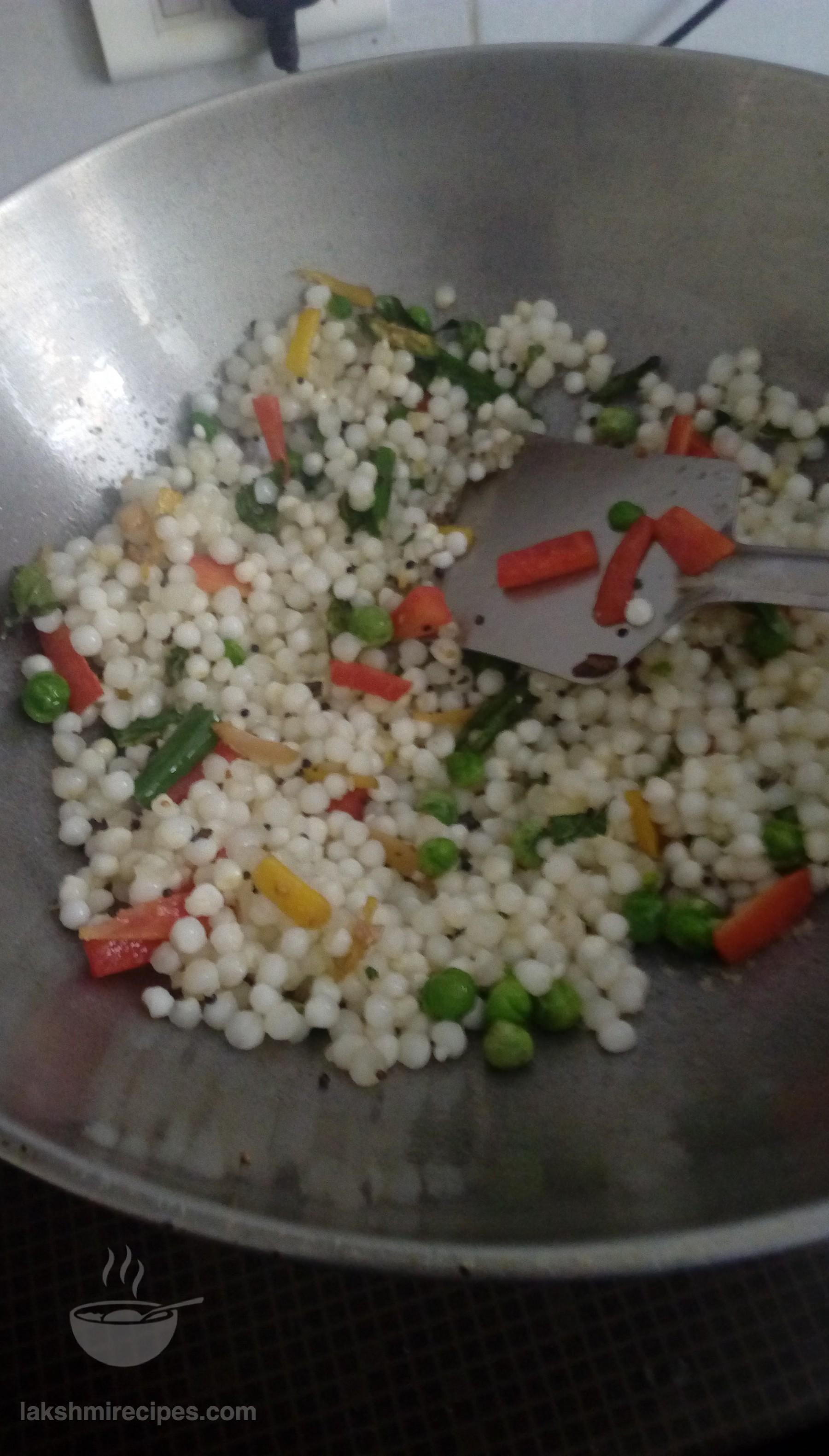 - When the vegetables become soft then add the soaked and strained sago (sabudana) to it and mix all the ingredients. Stir and cook for 3-4 minutes and the sabudana upma is ready to be served.