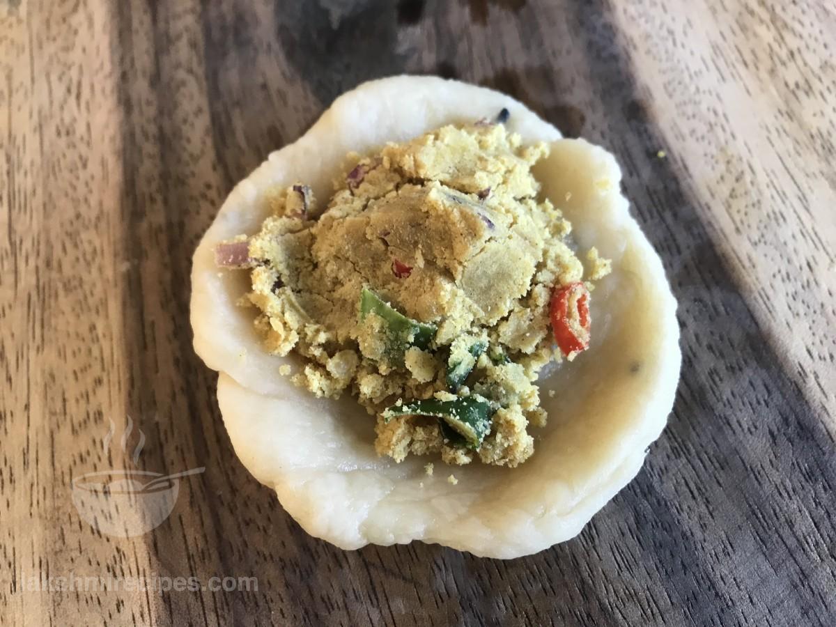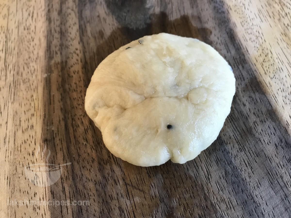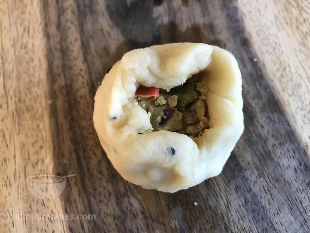 - अब इसमें थोड़ा हरे मटर भरावन डालें और फिर किनारों को चिपका कर पोटली जैसा आकार दें। फिर हल्के हाथ से रोल करके चिकना कर लें।