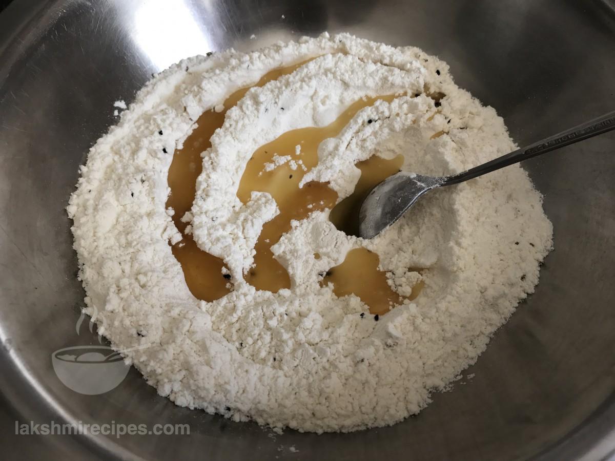 - अब इस सूखे मिश्रण में 3 बड़ा चम्मच रिफाइंड तेल डालें। इस मैदे के मिश्रण में तेल को अच्छे से मिलाएं और देखें कि मिश्रण बंध रहा है या नहीं।