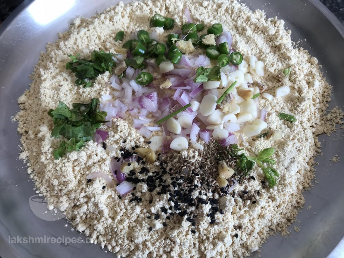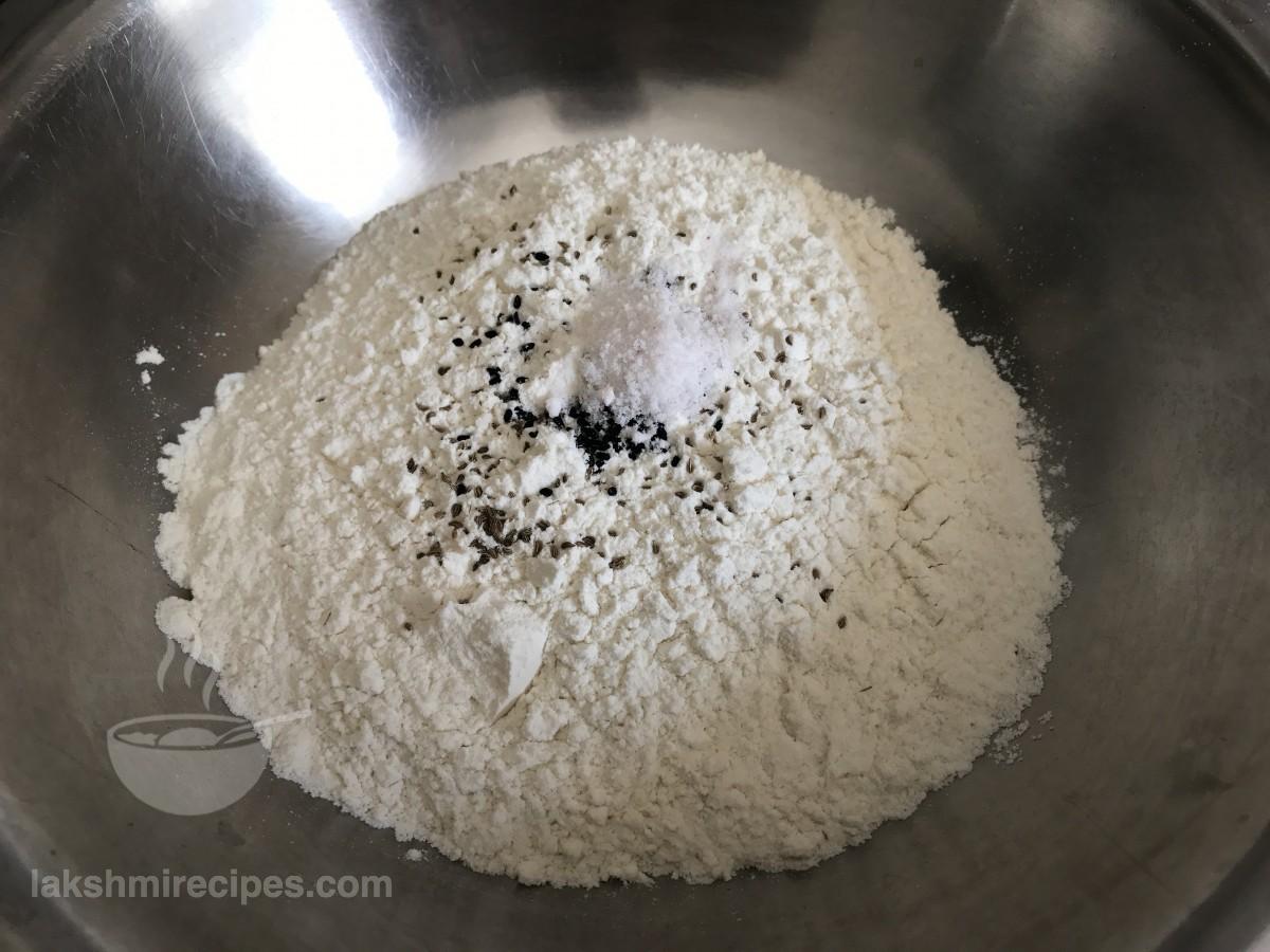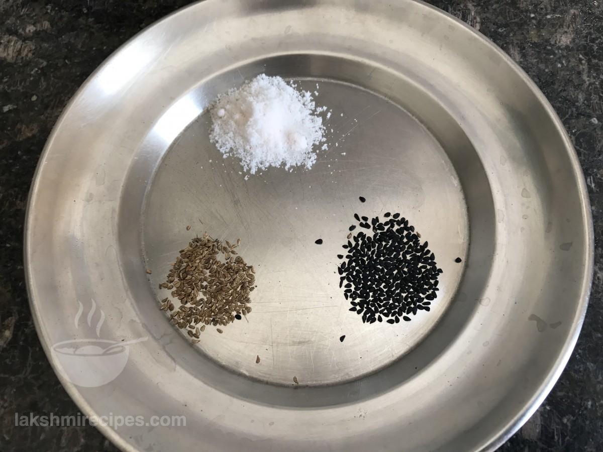 - Add salt or namak, carrom seeds or ajwain and onion seeds or mungrel to it. Mix the dry ingredients well.