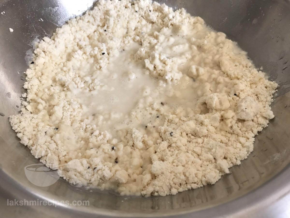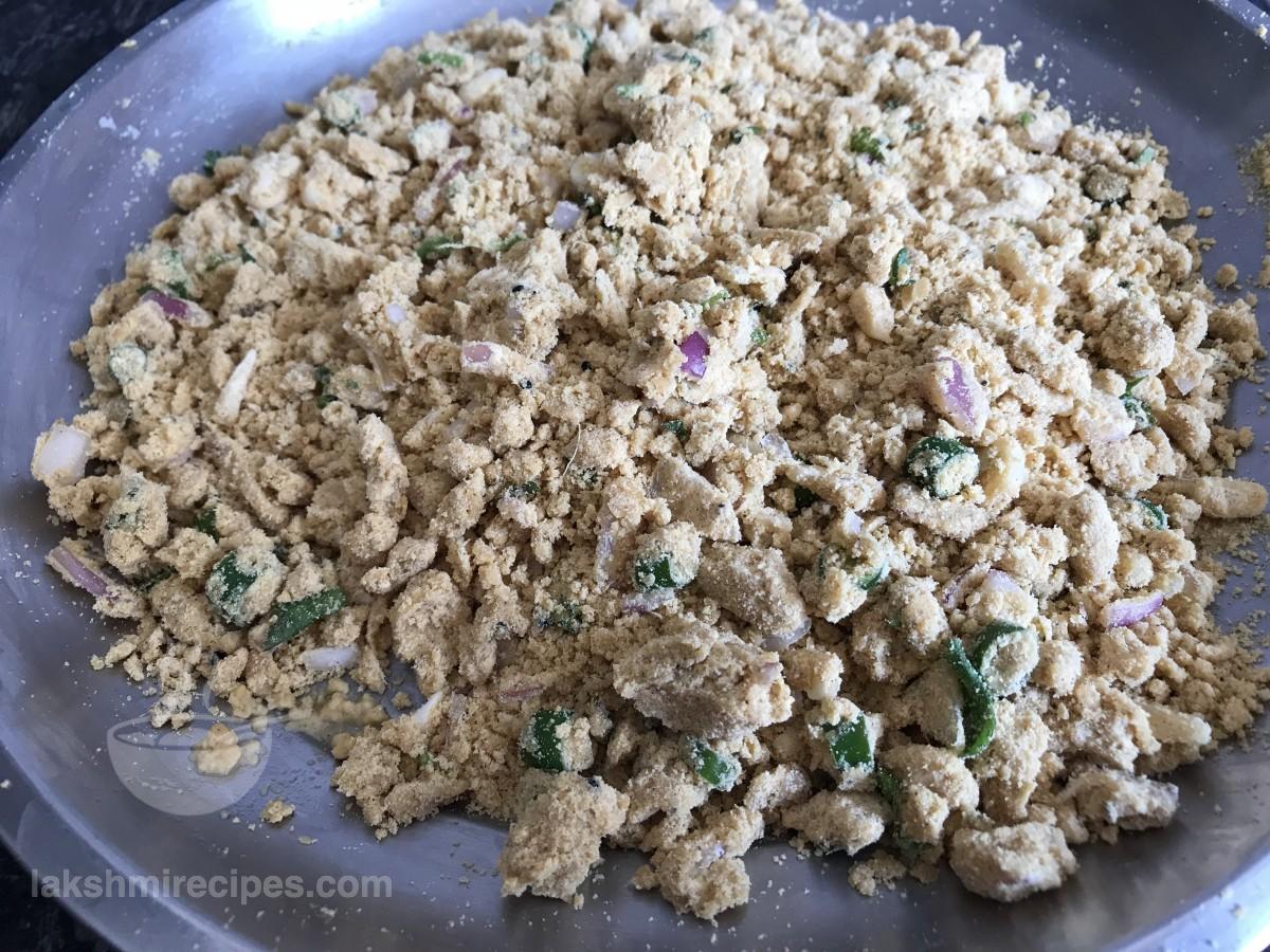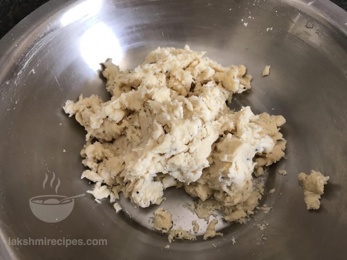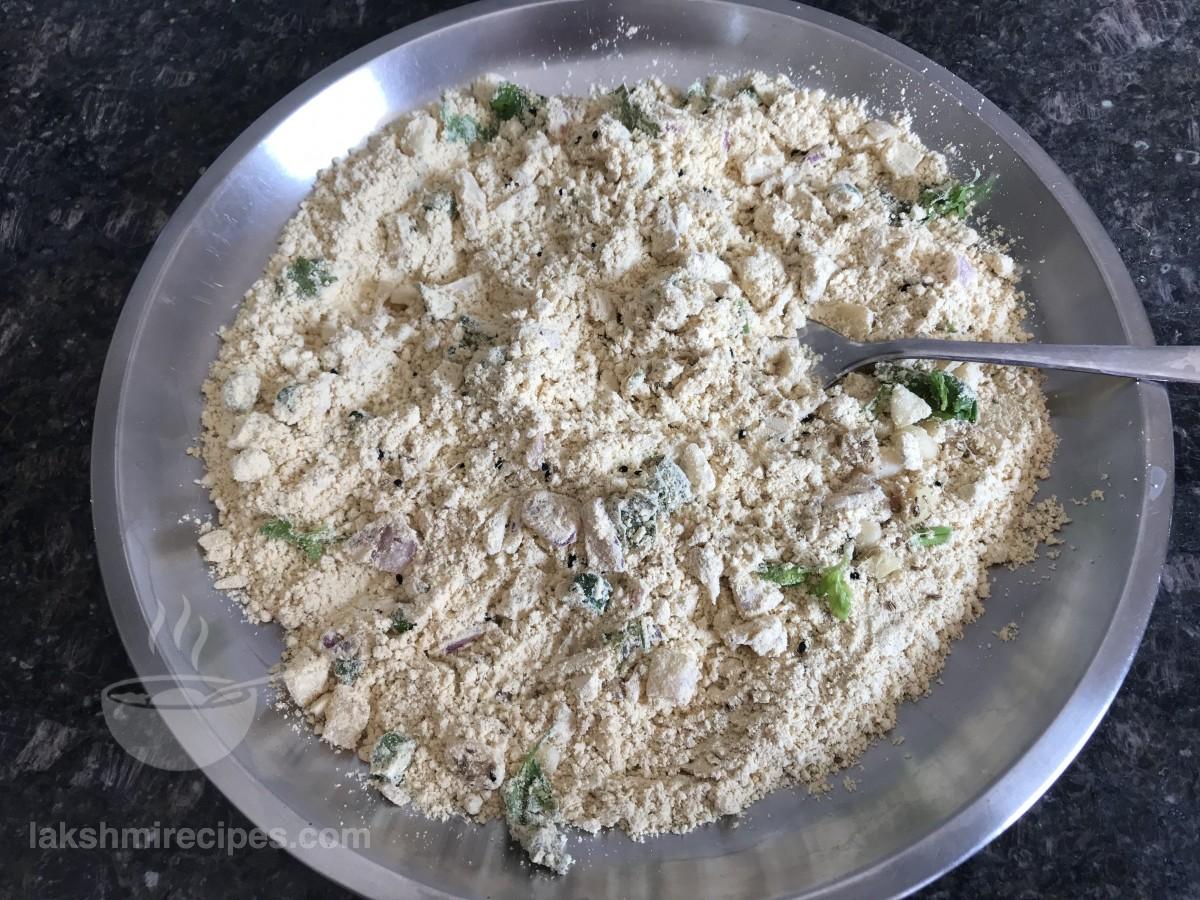 - Crumble the sattu stuffing mixture nicely and check if it begins to bind. If the mixture appears dry then add 2 table spoon water to this sattu stuffing mixture and crumble again. Remember that this sattu stuffing mixture for making Sattu Ki Khasta Kachori should neither be very dry nor very moist in texture.