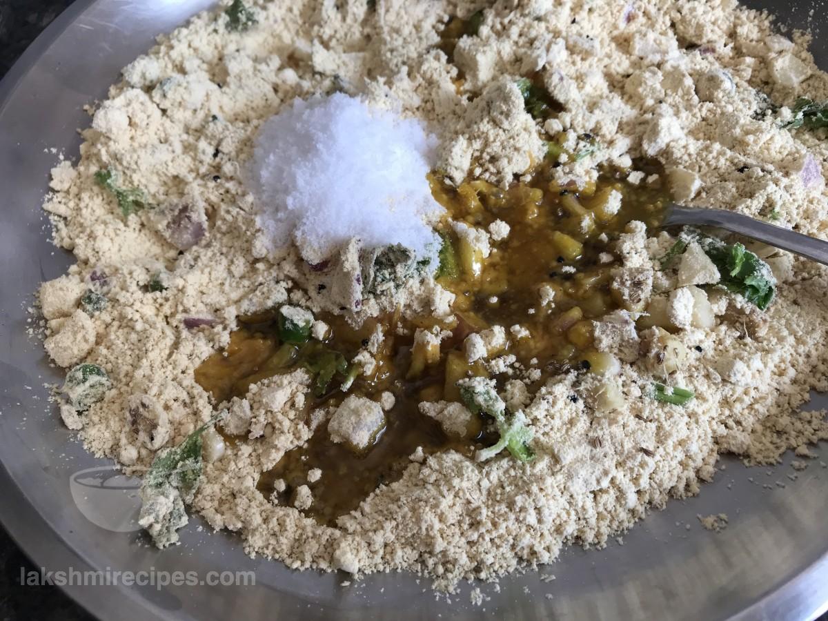 - अब इसमें नमक, अजवैन और मंग्रैल डालें। सूखी सामग्री को अच्छी तरह मिलाएं।