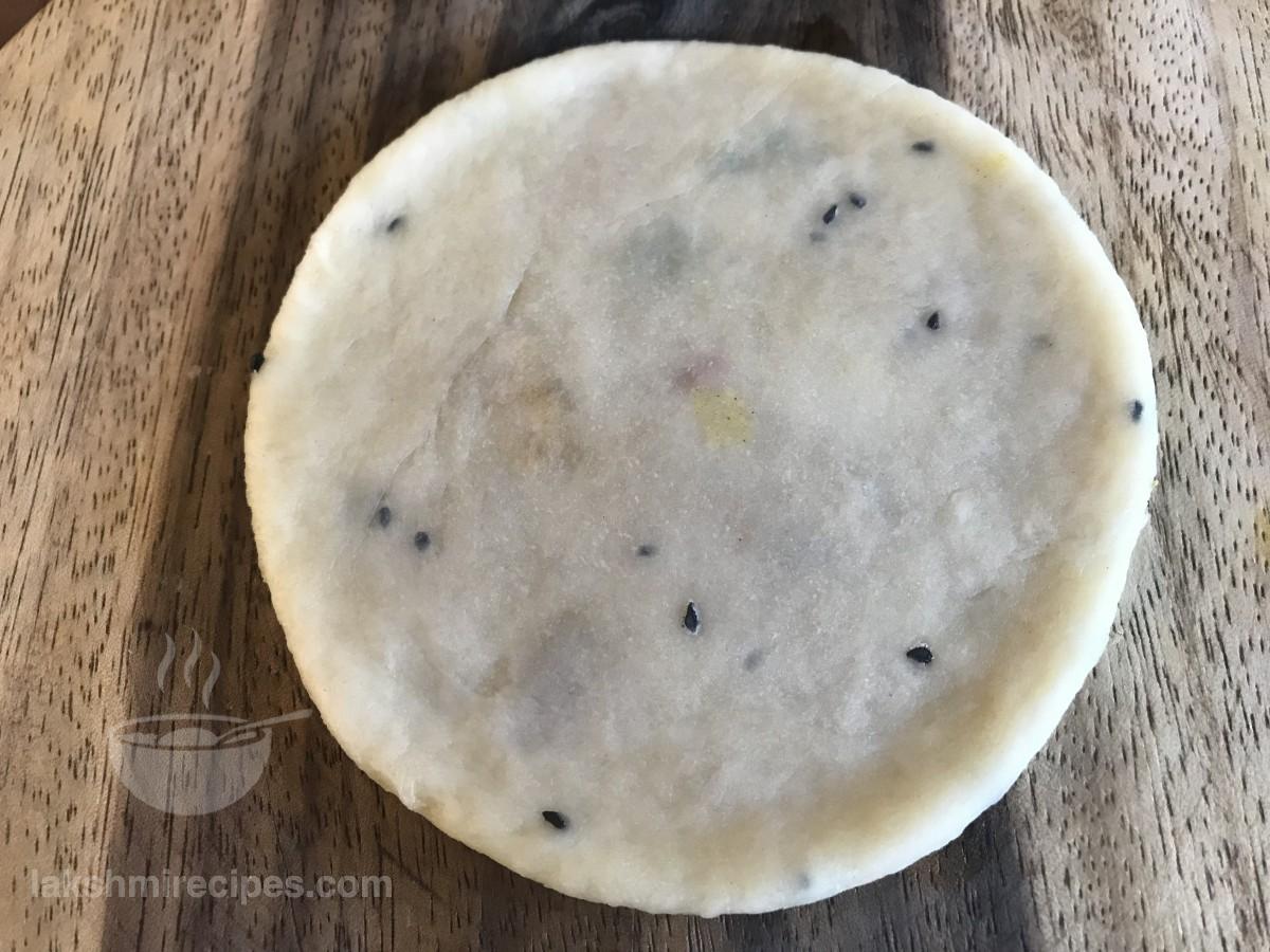 - Then take a rolling pin and plate and grease it with some refined oil. Place one stuffed ball over it and press it slightly with your hand. Then roll it flat and round like poori without applying excess pressure. But remember that the Sattu Ki Khasta Kachori should be thicker than a poori.