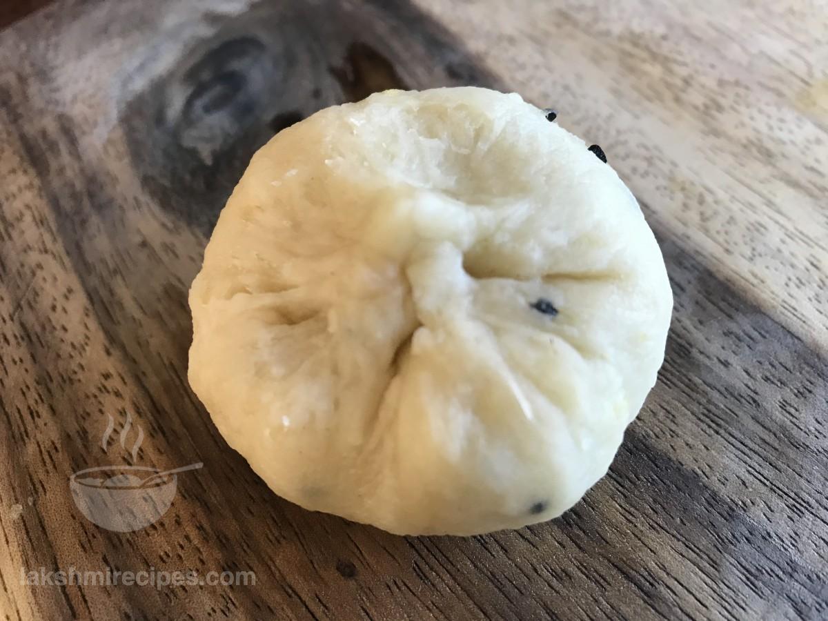 - Now place some Sattu Ki Stuffing in this depression and then bring the sides together to form a pouch. Then roll and smoothen it like a stuffed ball.
