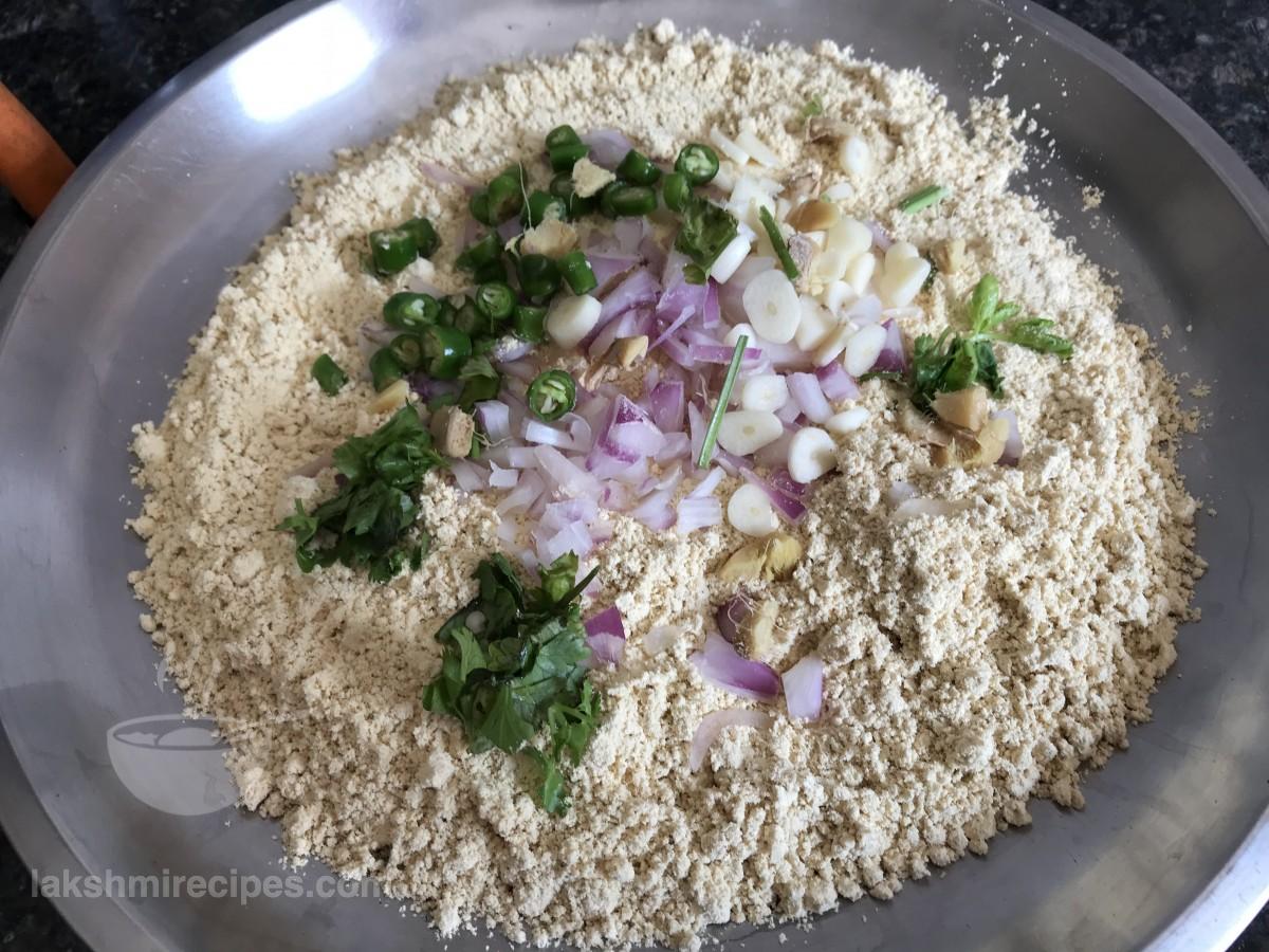 - Add finely chopped onion, ginger, garlic, green chilli and coriander leaves to it.