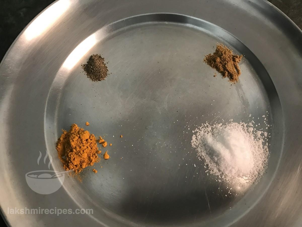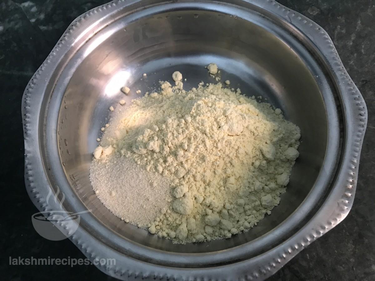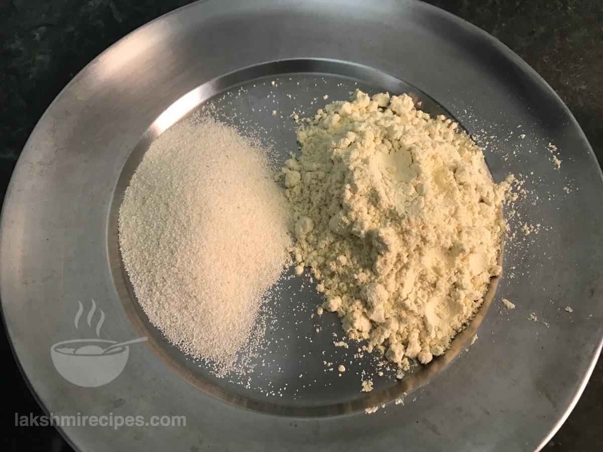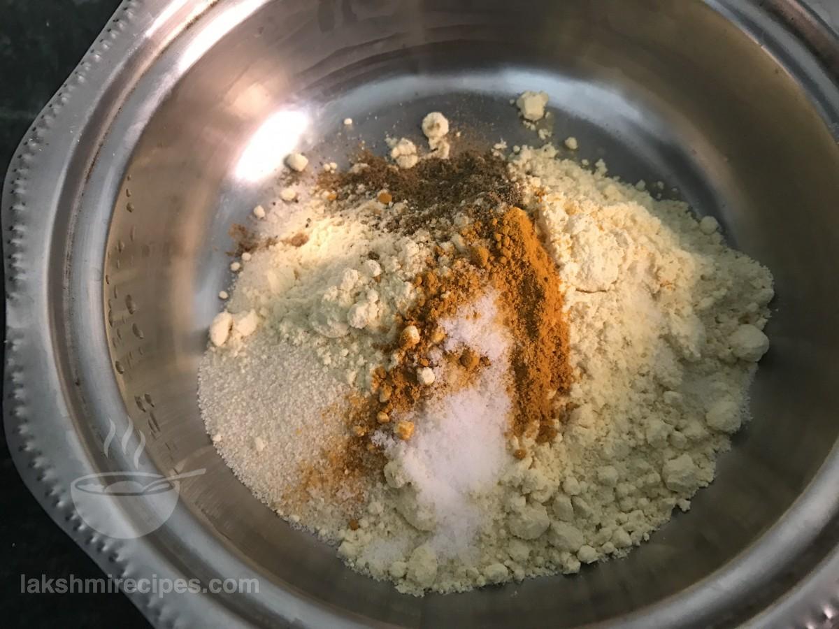 - Take semolina, gram flour, salt, turmeric powder, cumin seeds powder and black pepper powder in a deep mixing bowl and mix all the dry ingredients together.