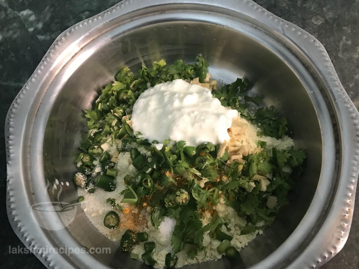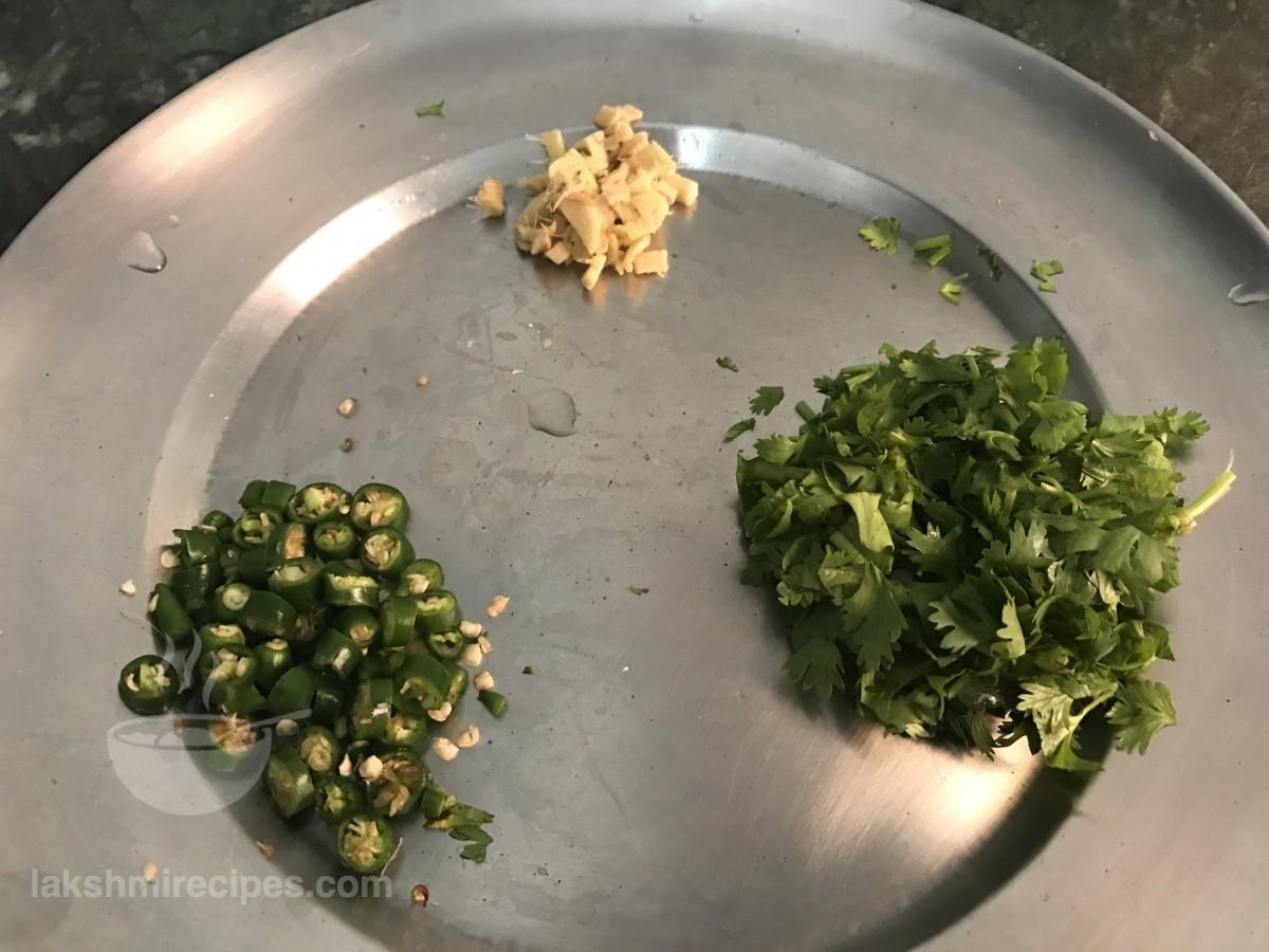 - Now add chopped ginger, green chilli and coriander leaves to it.