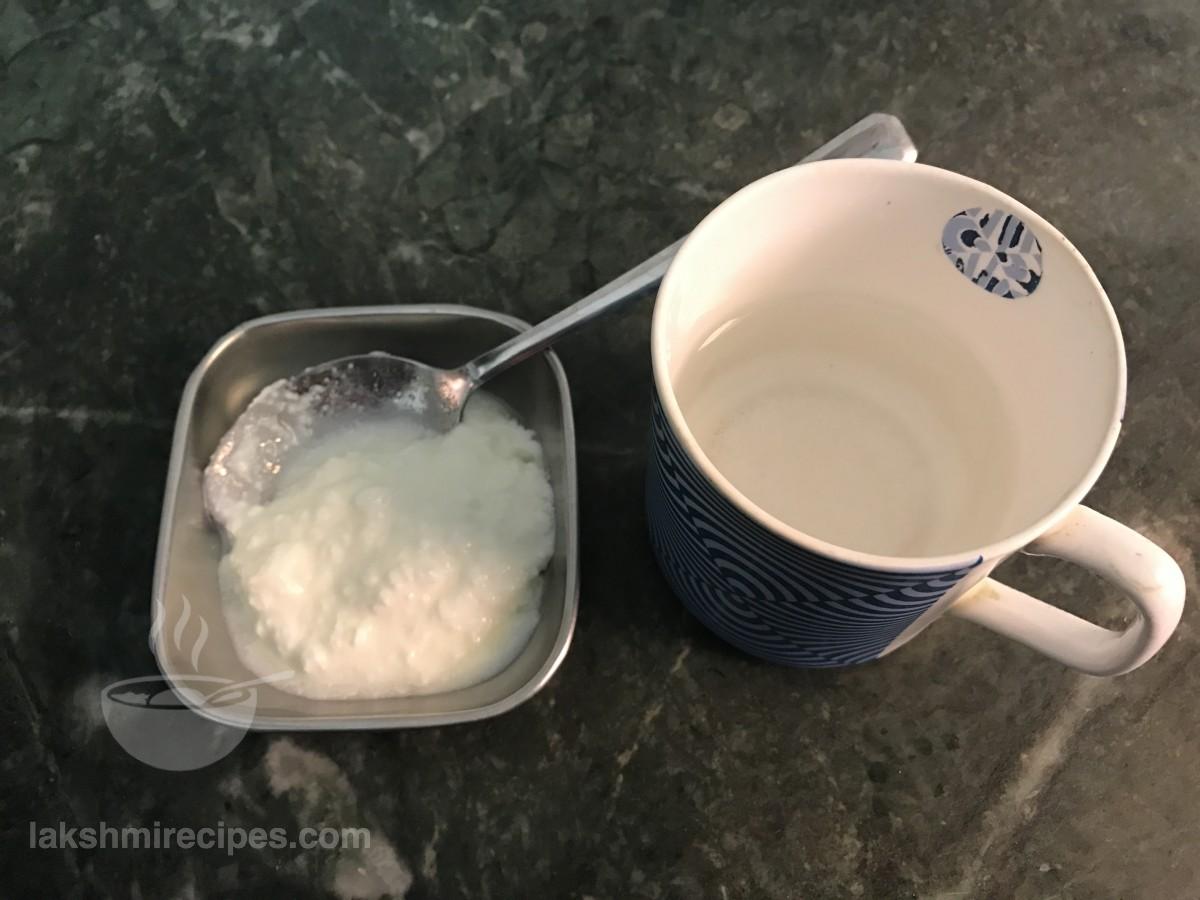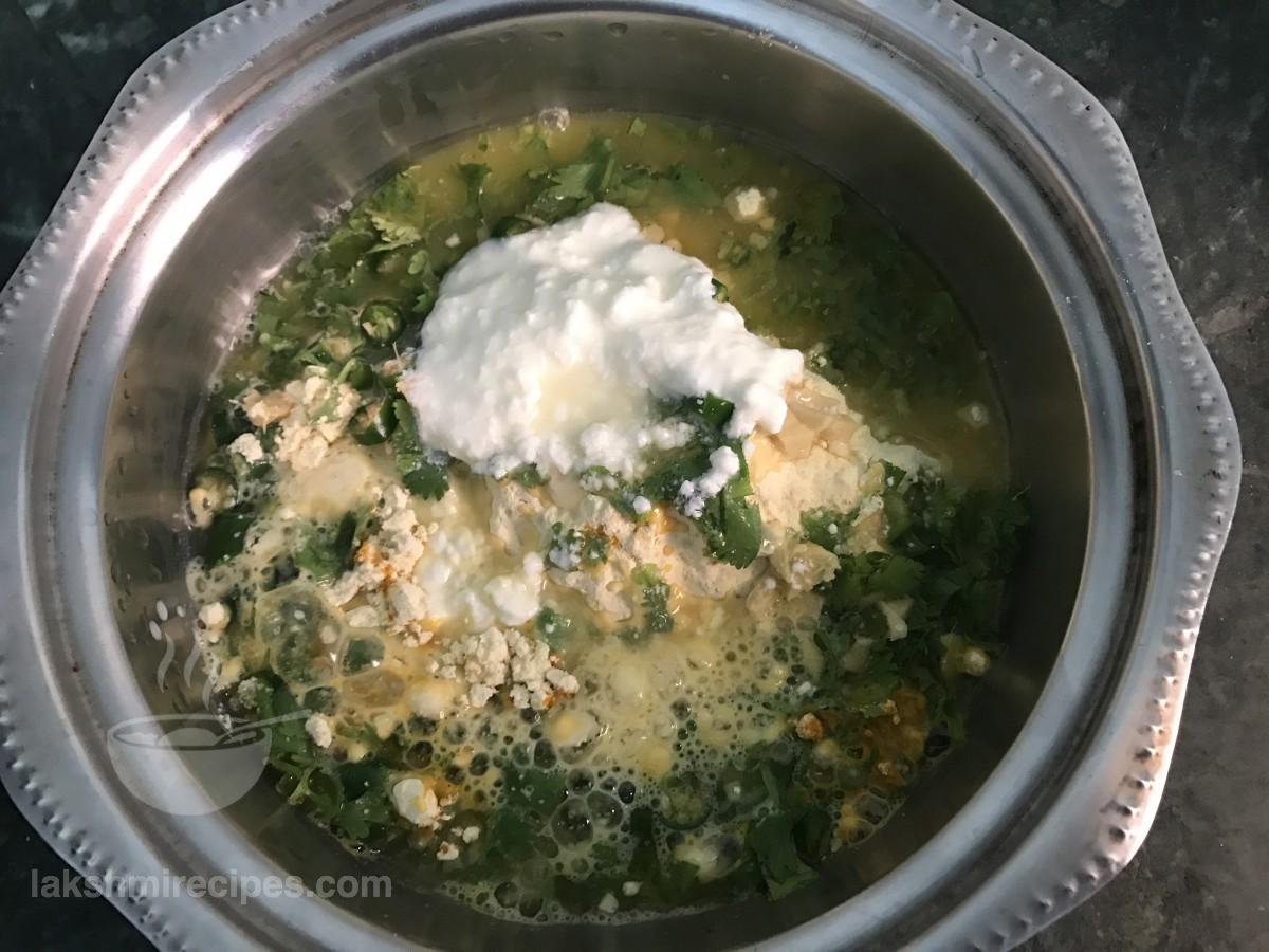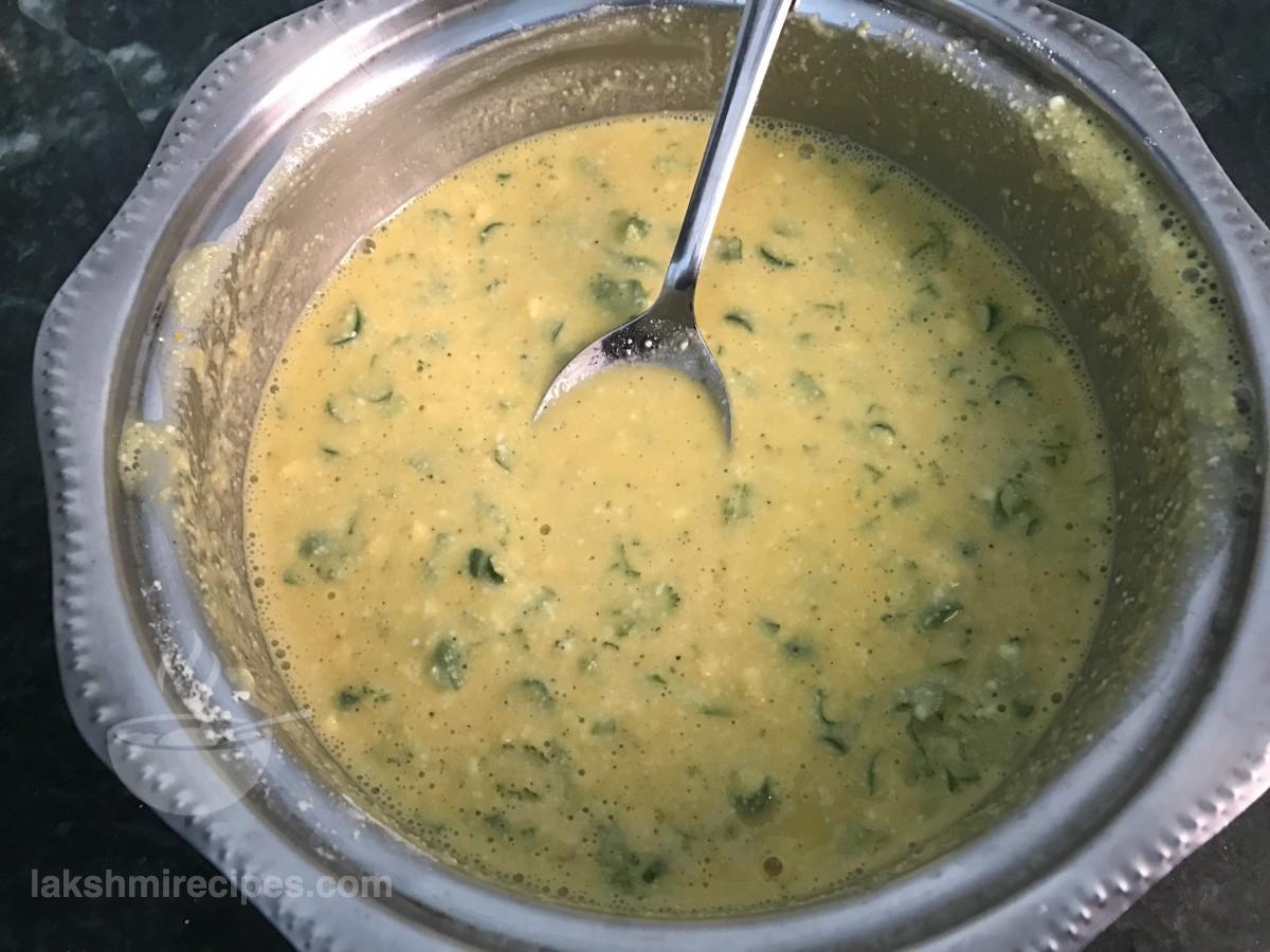 - Then add curd, water to the the dry mixture and mix to form a batter of medium thin consistency. Mix well such that no lumps are formed. (Remember that the batter should neither be of very thick consistency nor very thin.)