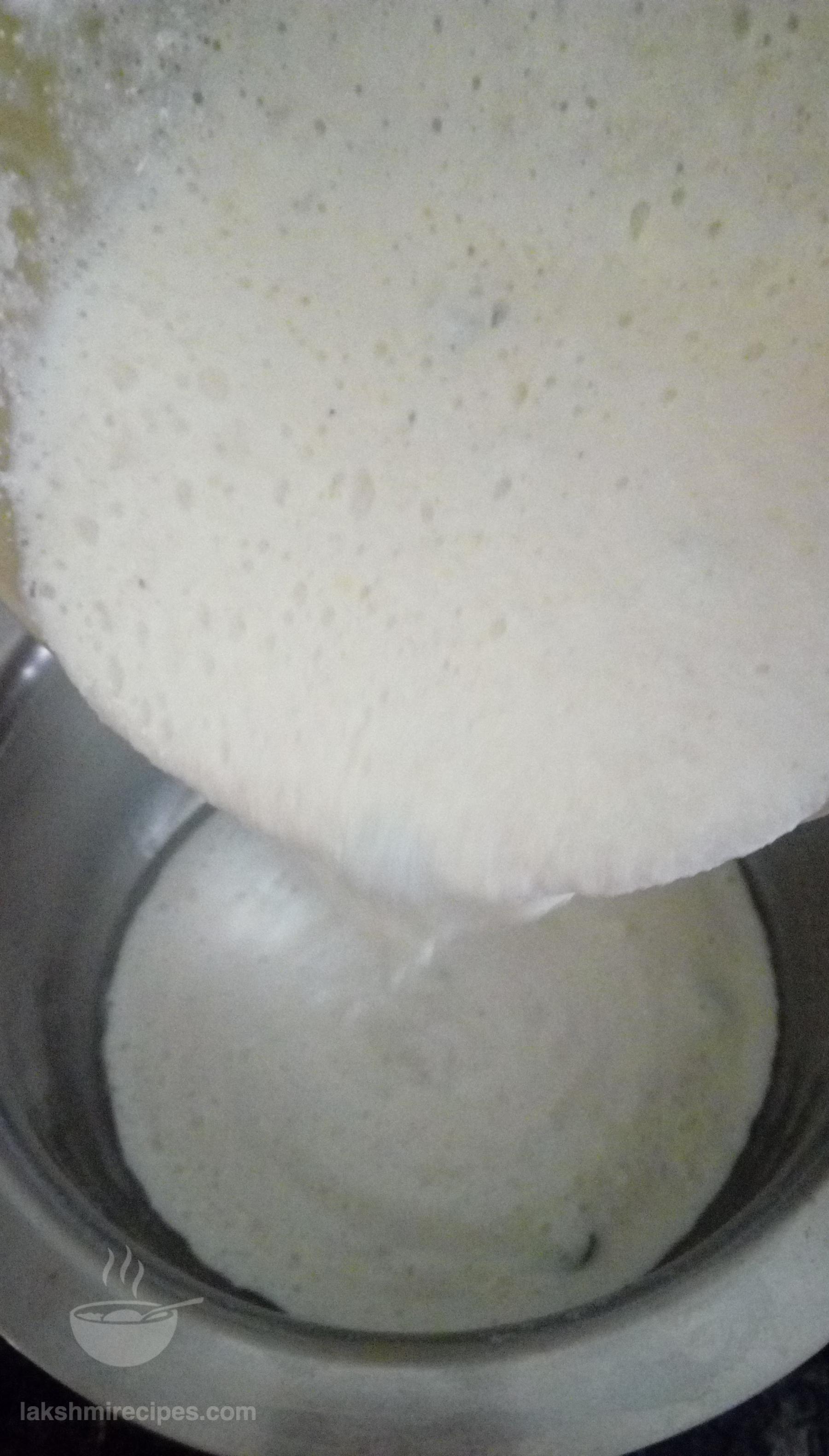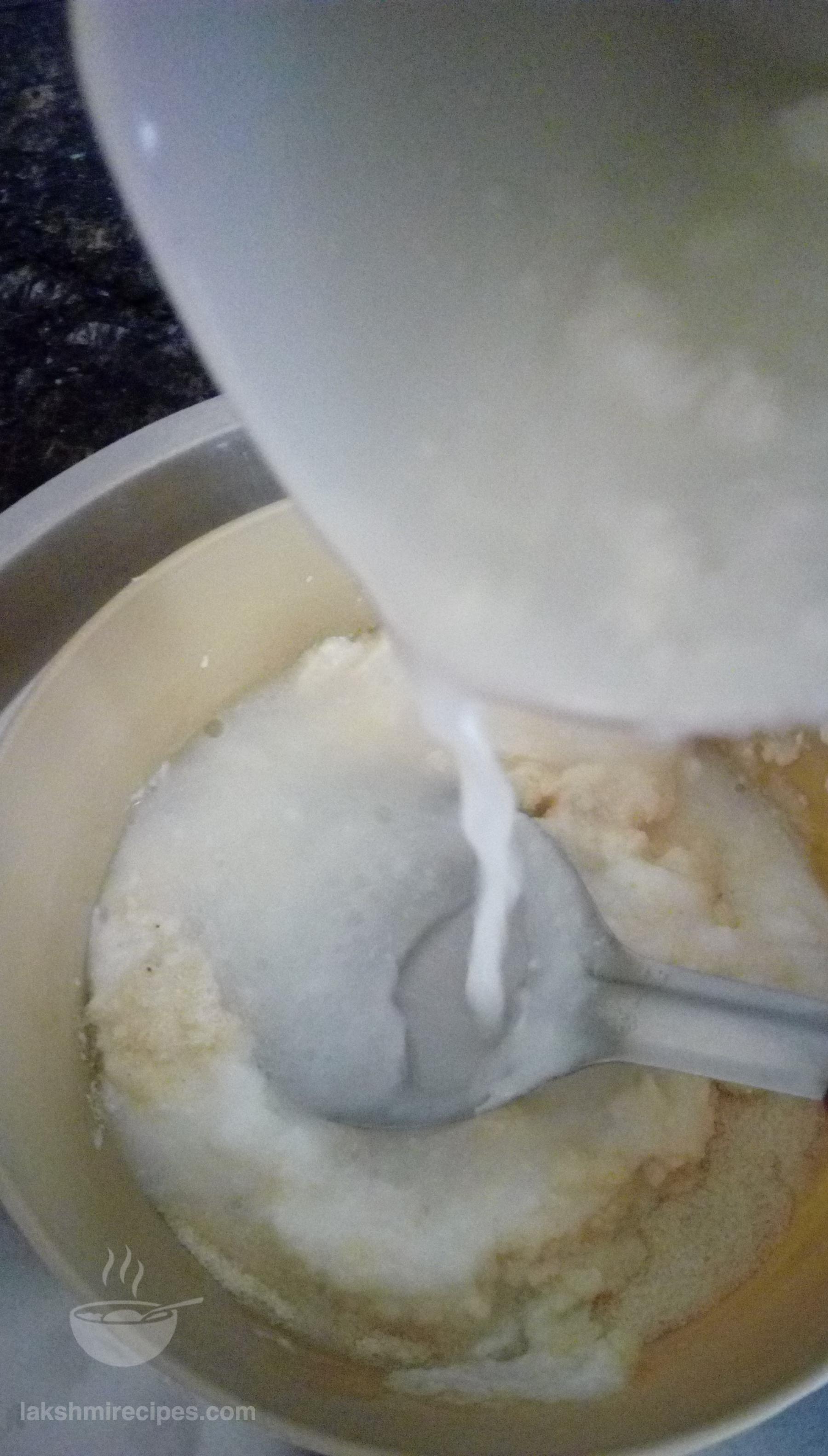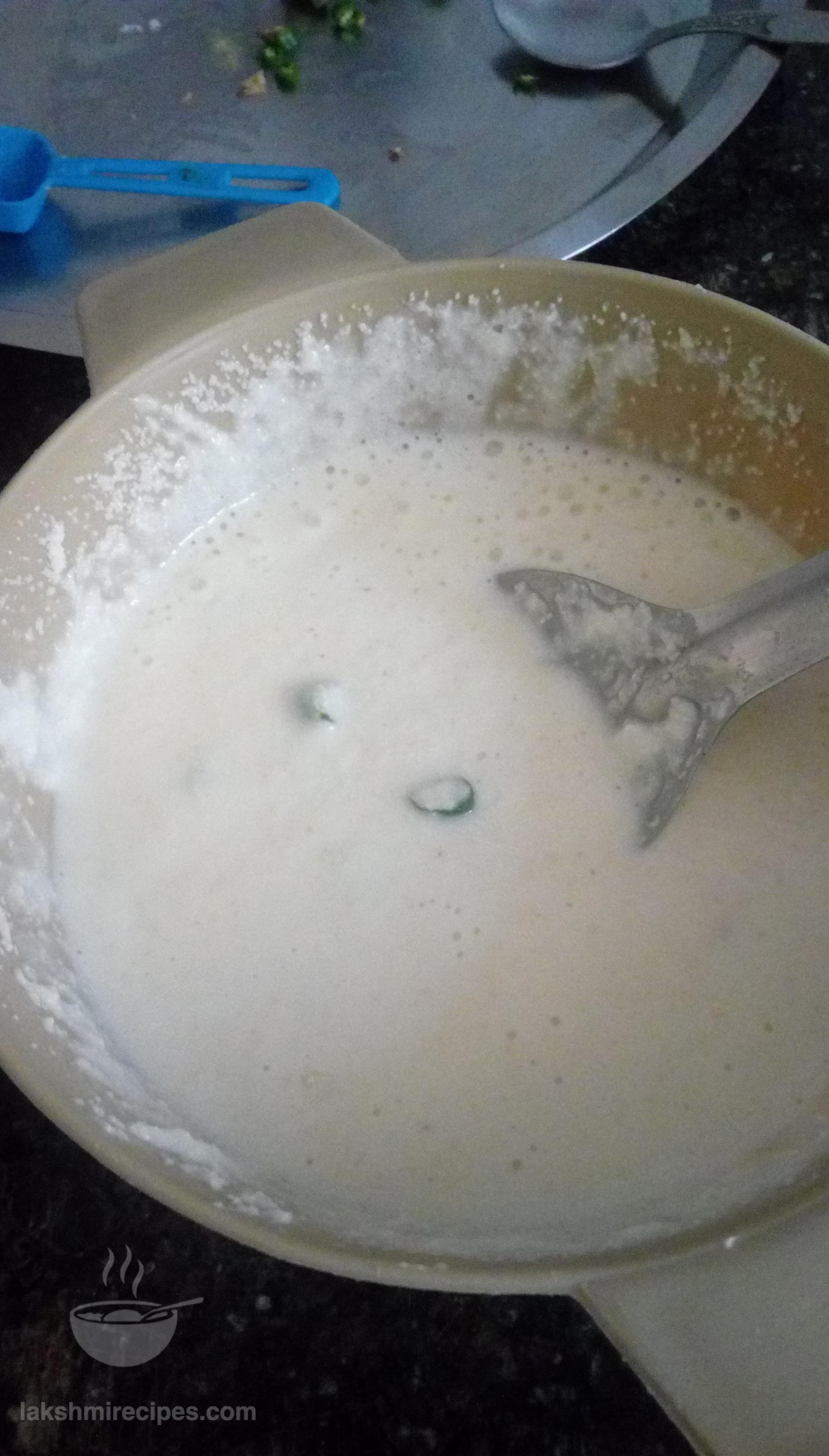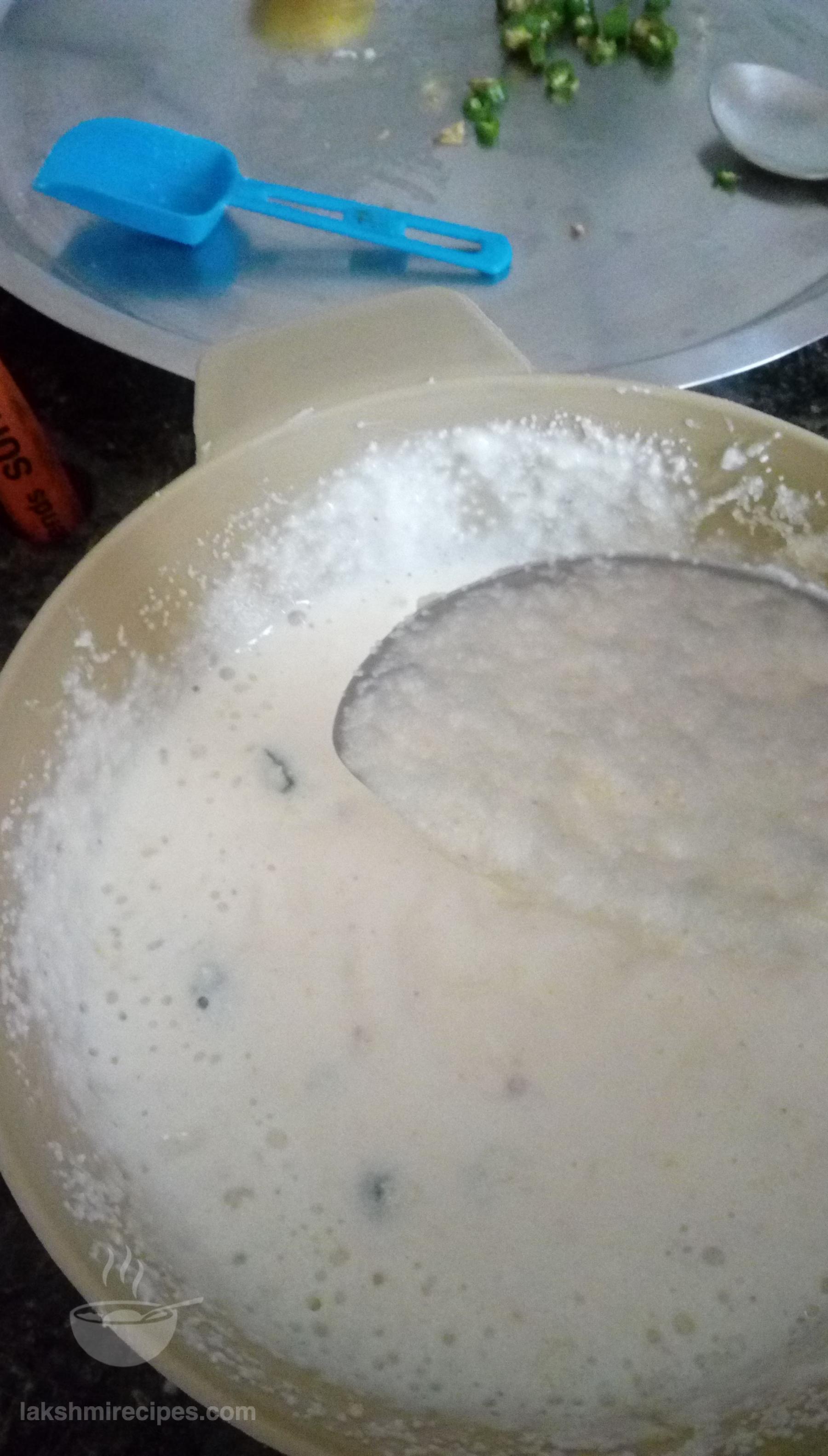 - After 1/2 hour the semolina (sooji) shall swell and rise a little. Again add 1/2 cup water and mix with the batter. The batter being prepared for the dhokla should be of medium thick consistency (not flowy and not very thick; as shown in the images below).