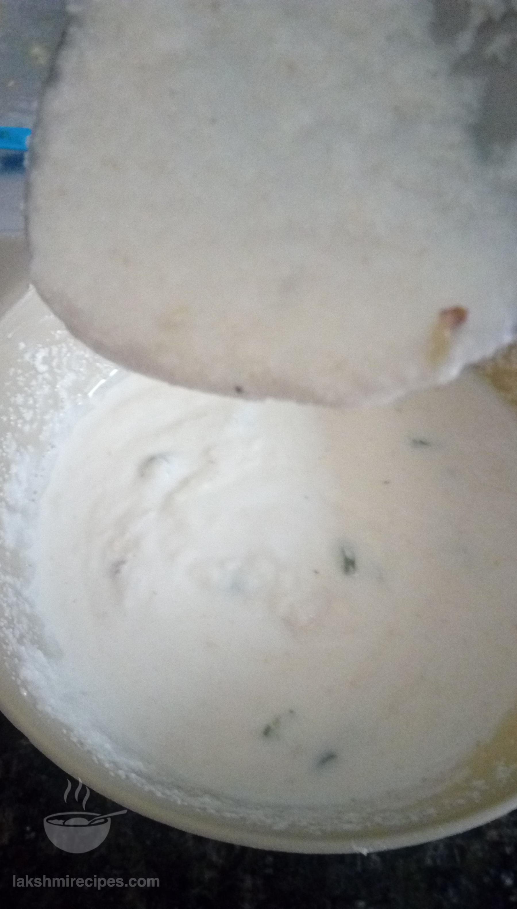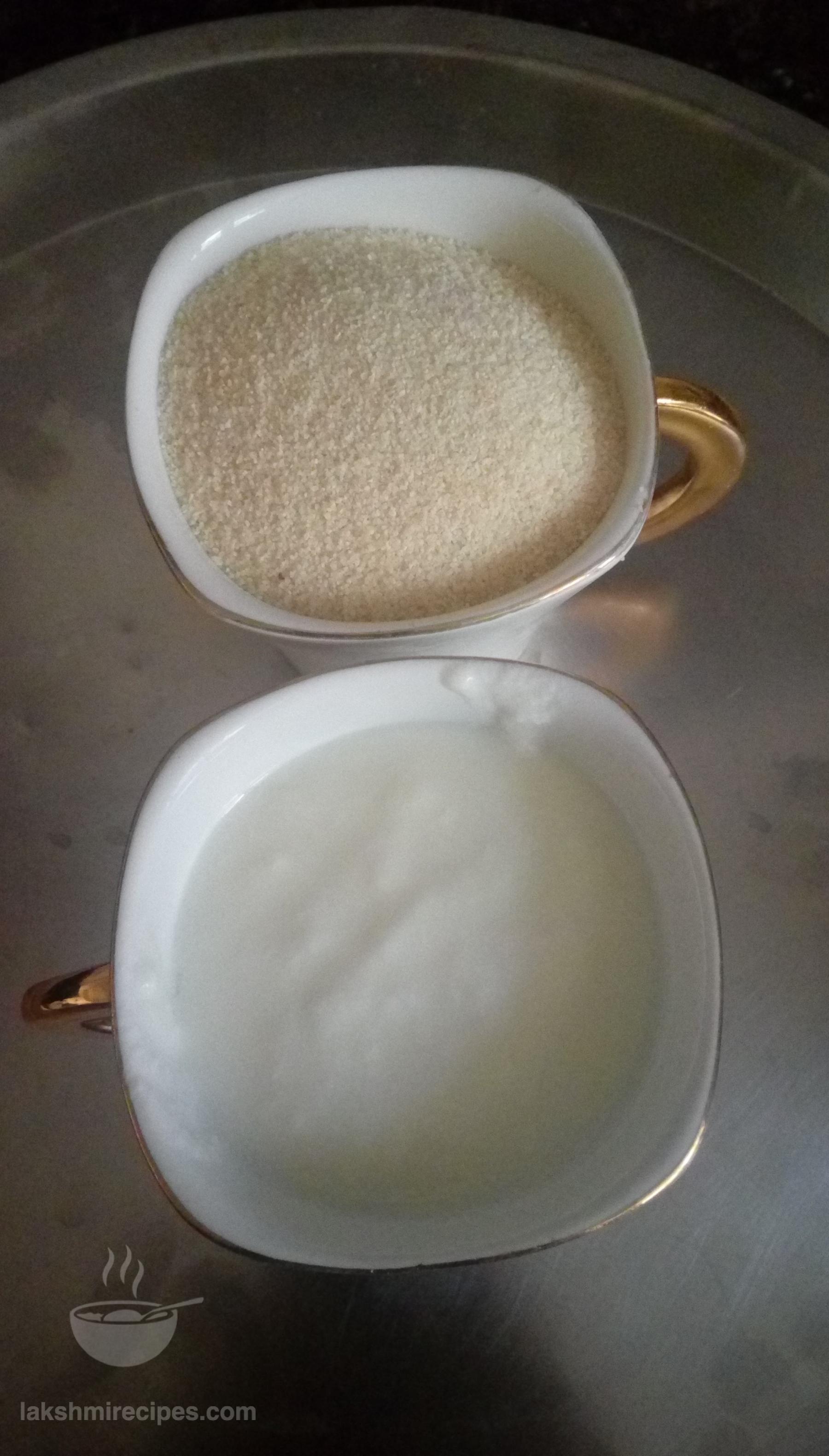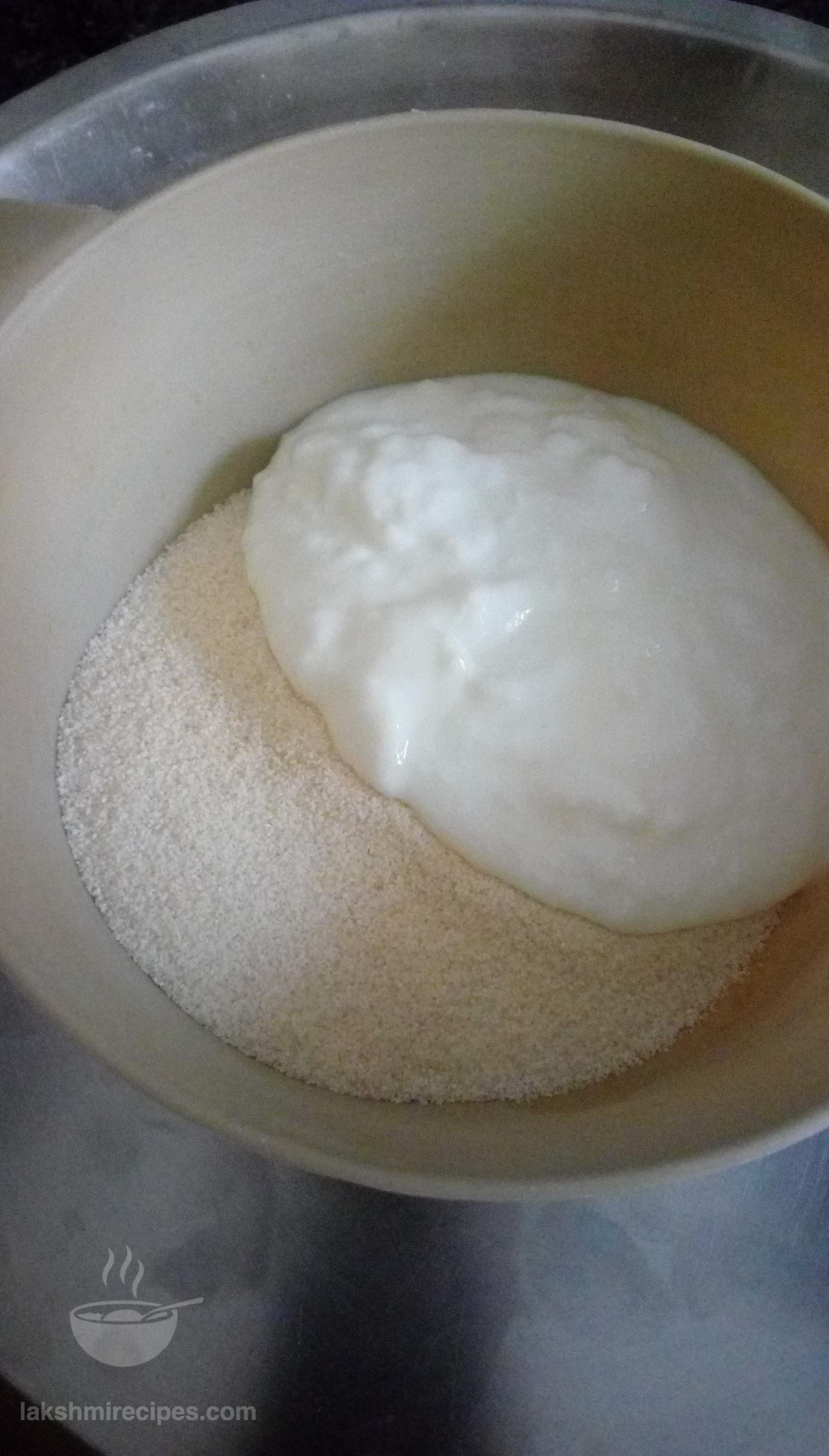 - In a deep mixing bowl take 1 cup semolina (sooji), 1 cup card (dahi) and 1/2 cup water together.