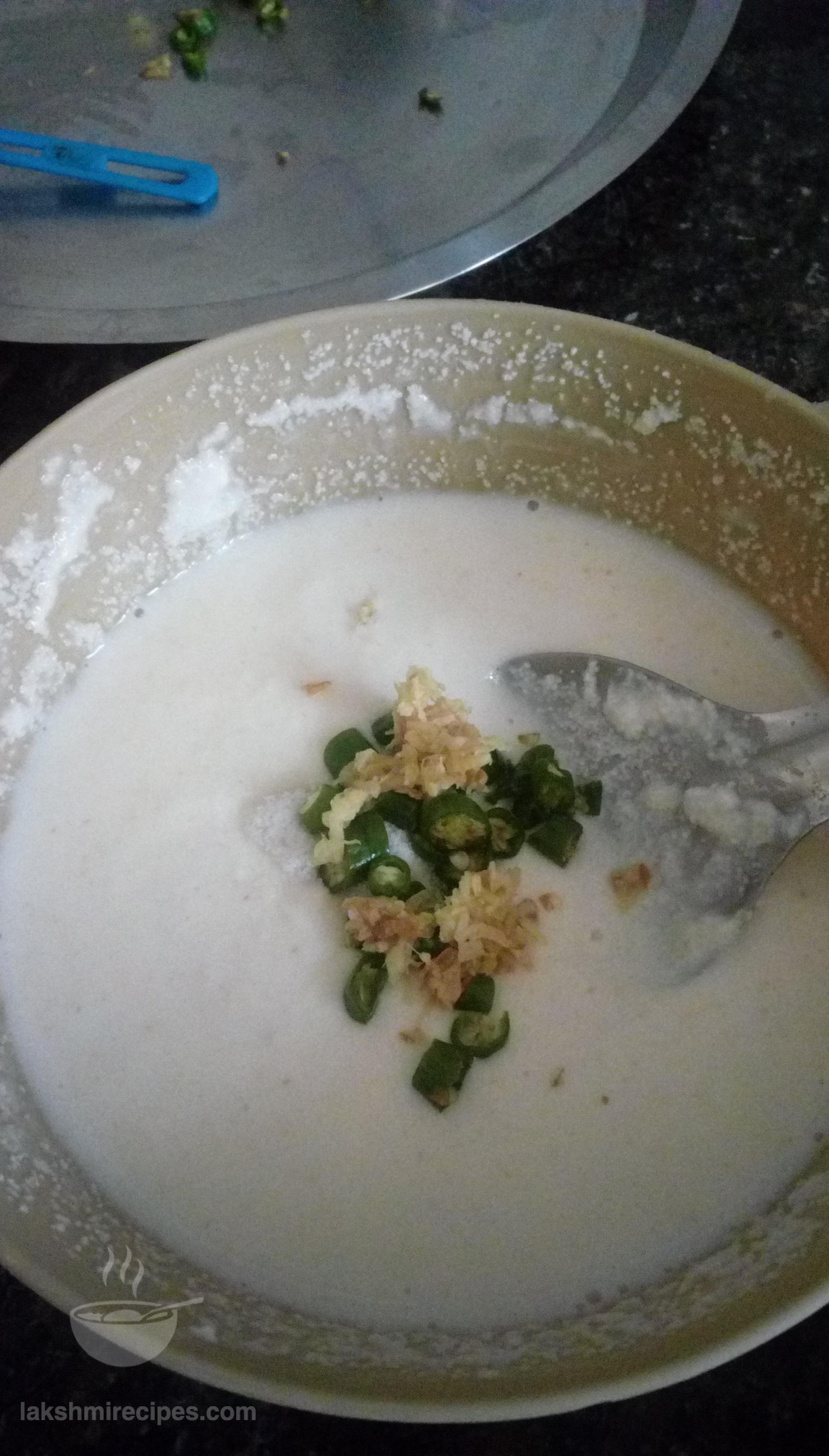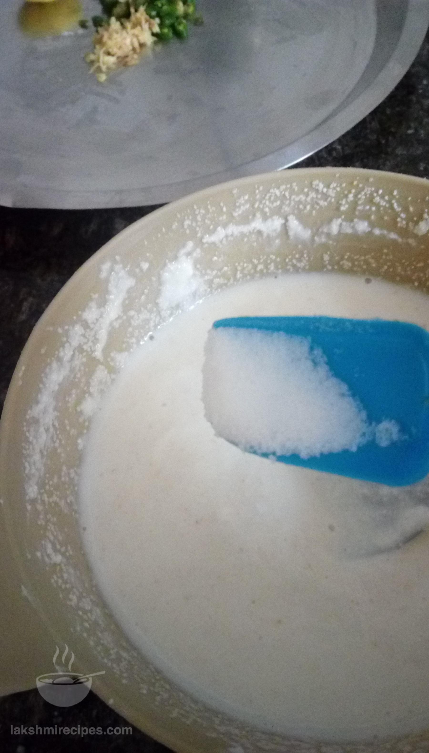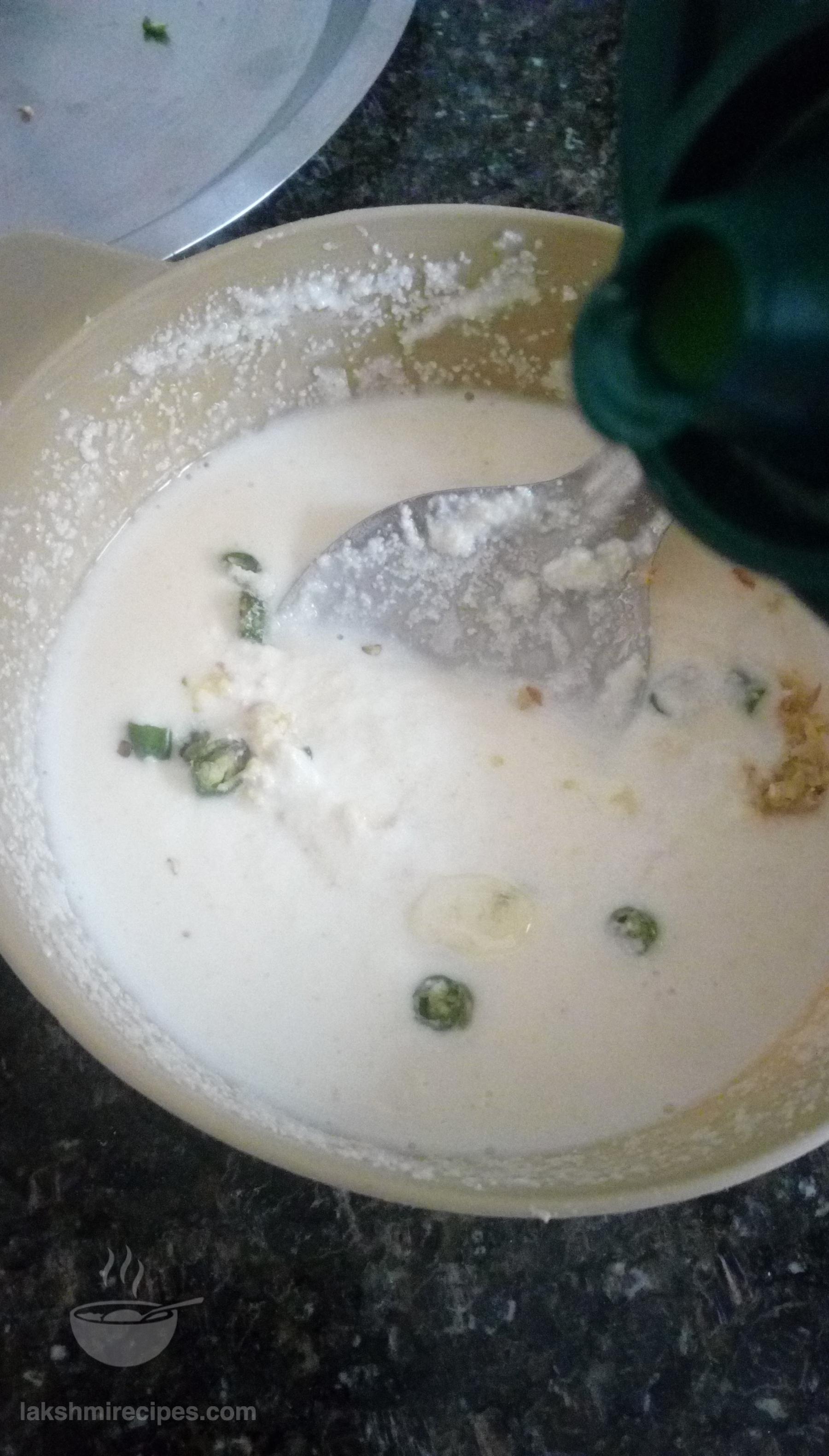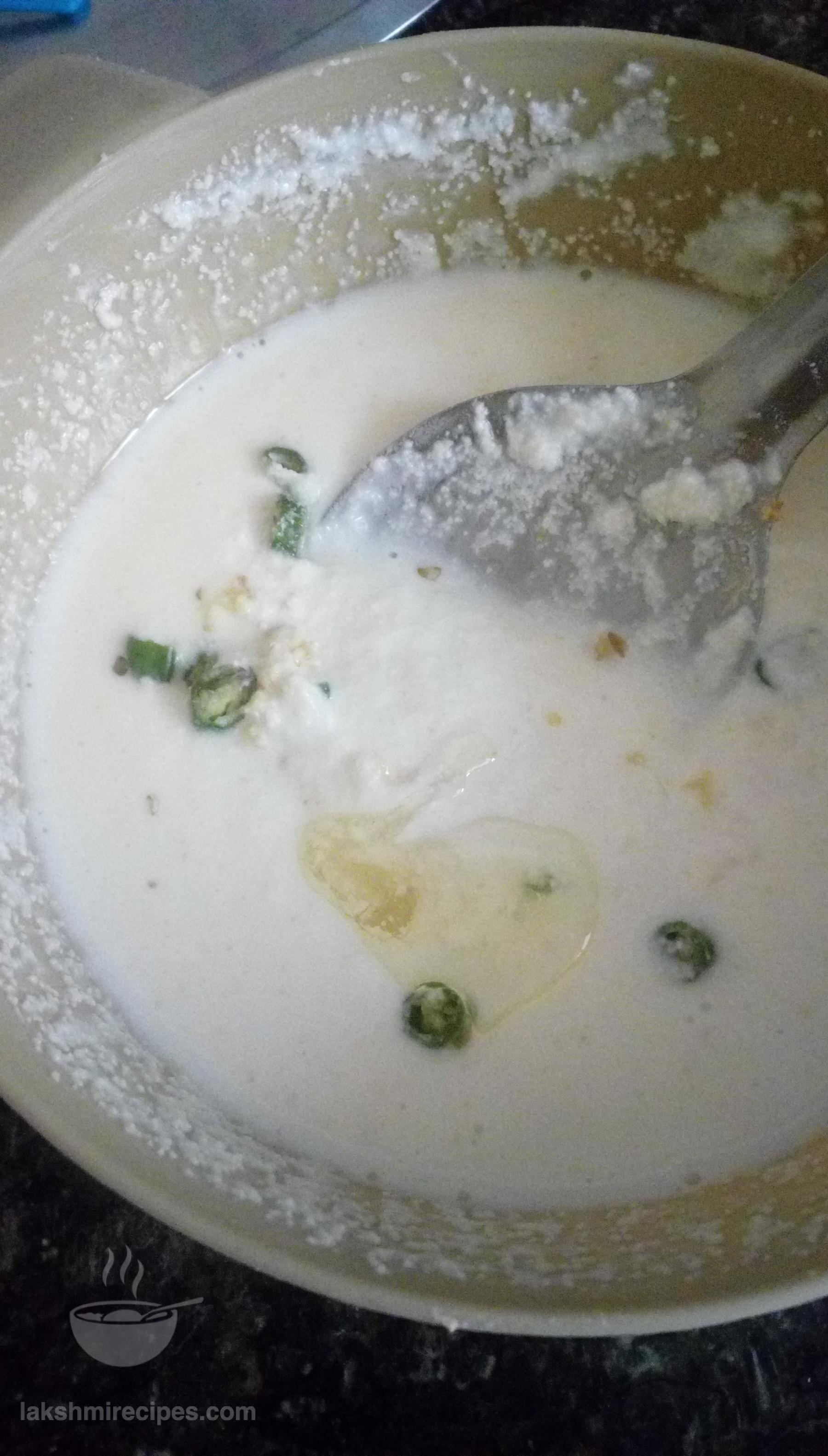 - Thn add salt as per taste (namak swaad anusar), finely chopped green chillis (hari mirch), ginger (adrak) and refined oil to it. Whisk all the ingredients well to form a uniform batter.