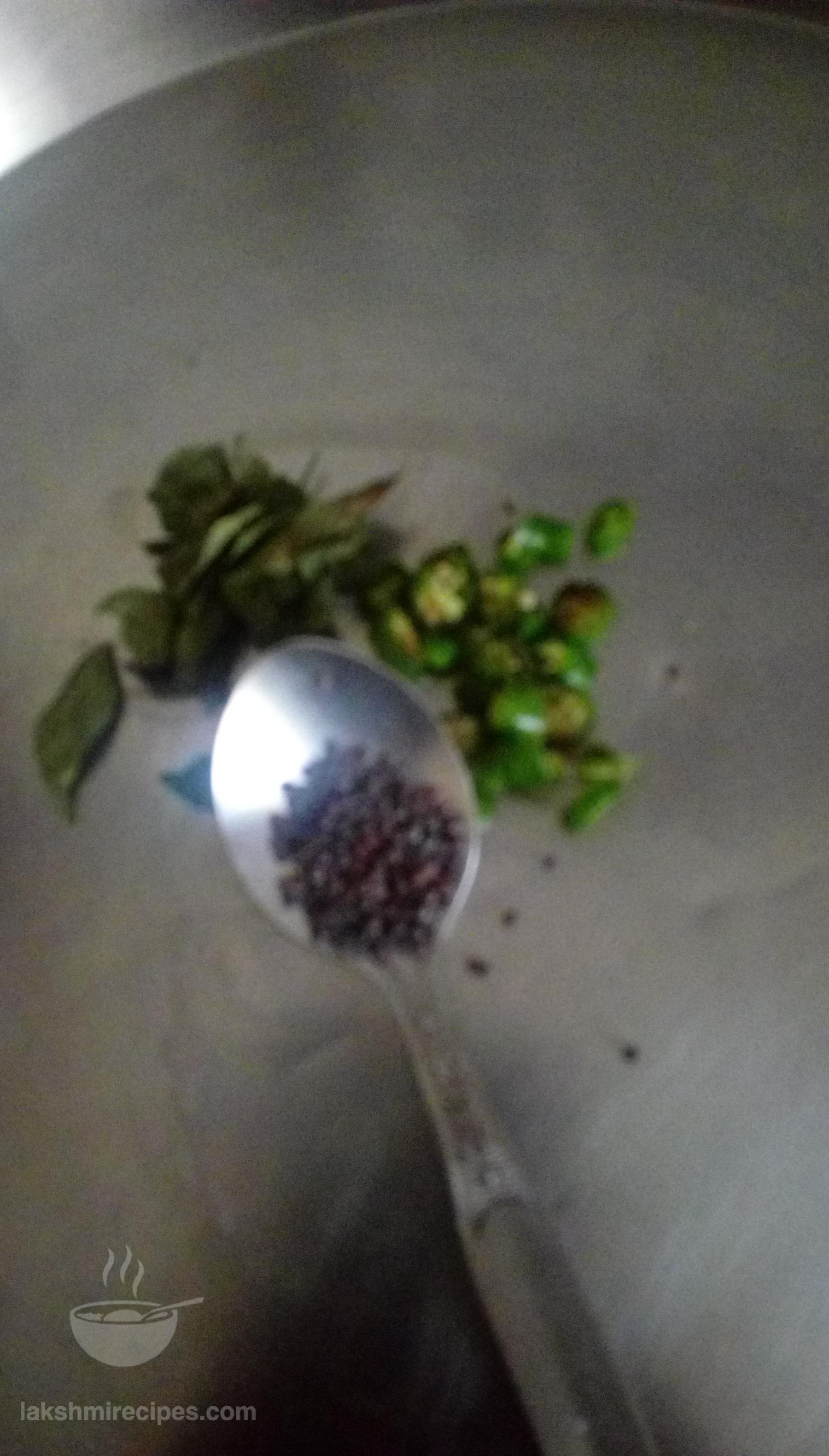 - Allow the mustard seeds (rai) to crackle and then add the curry leaves (kari patta) and chopped green chillis (hari mirch) to the kadhai and prepare the tadka.