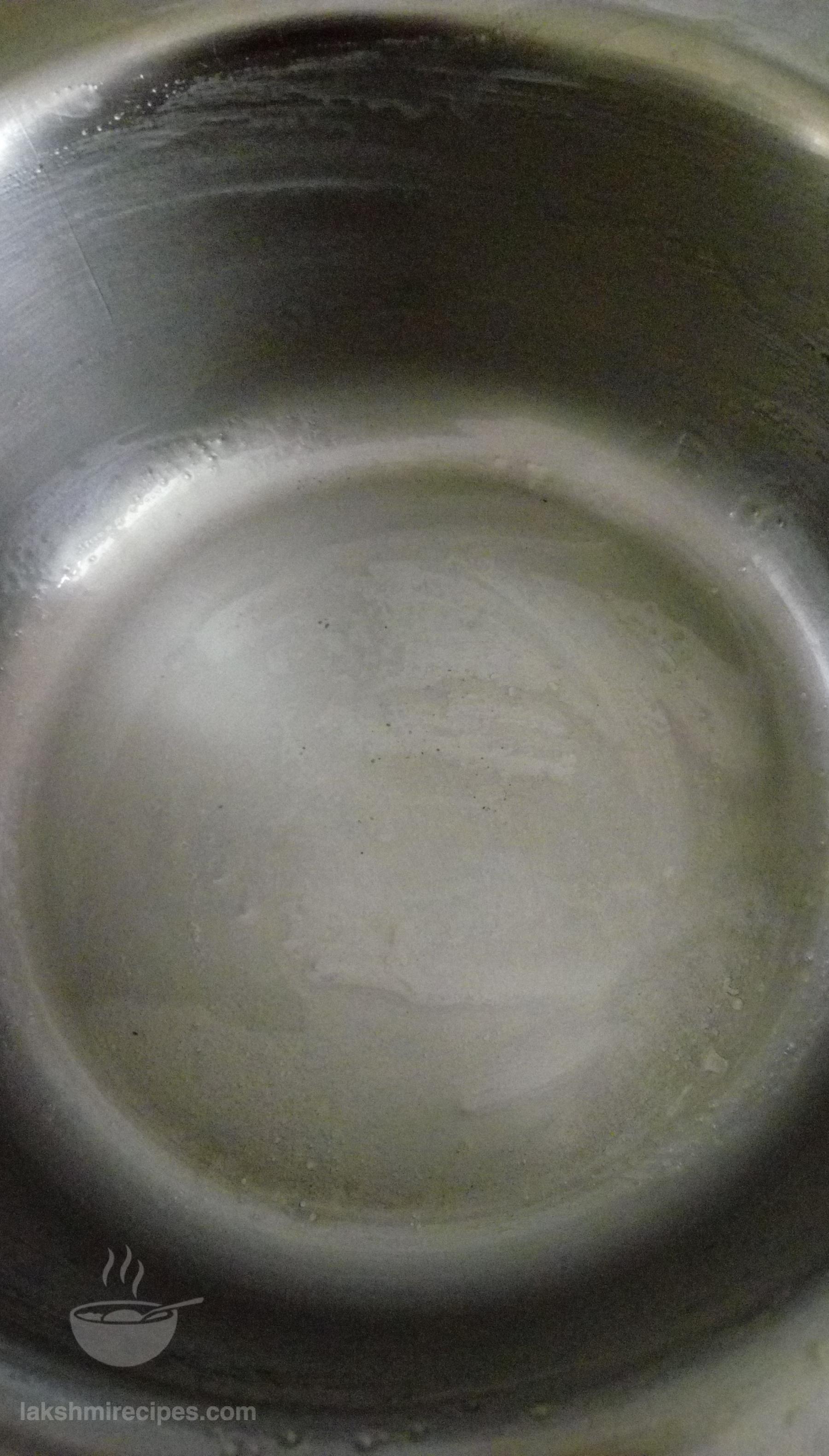 - Take a deep cooking vessel (bhagona or pateela) that can fit into the steamer. Add 1-2 drops of refined oil to it and grease it on the inner side nicely.