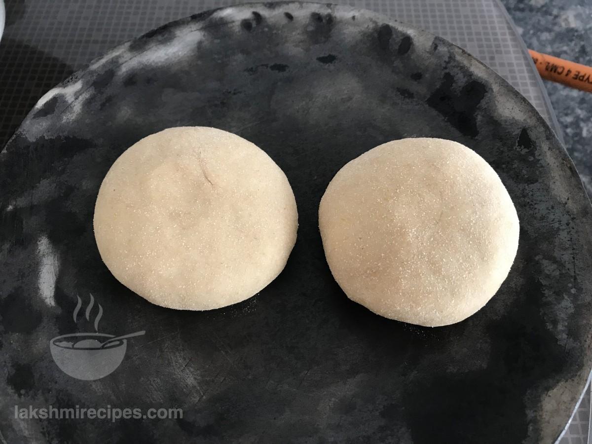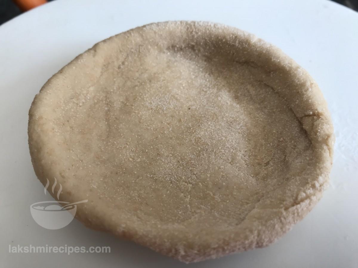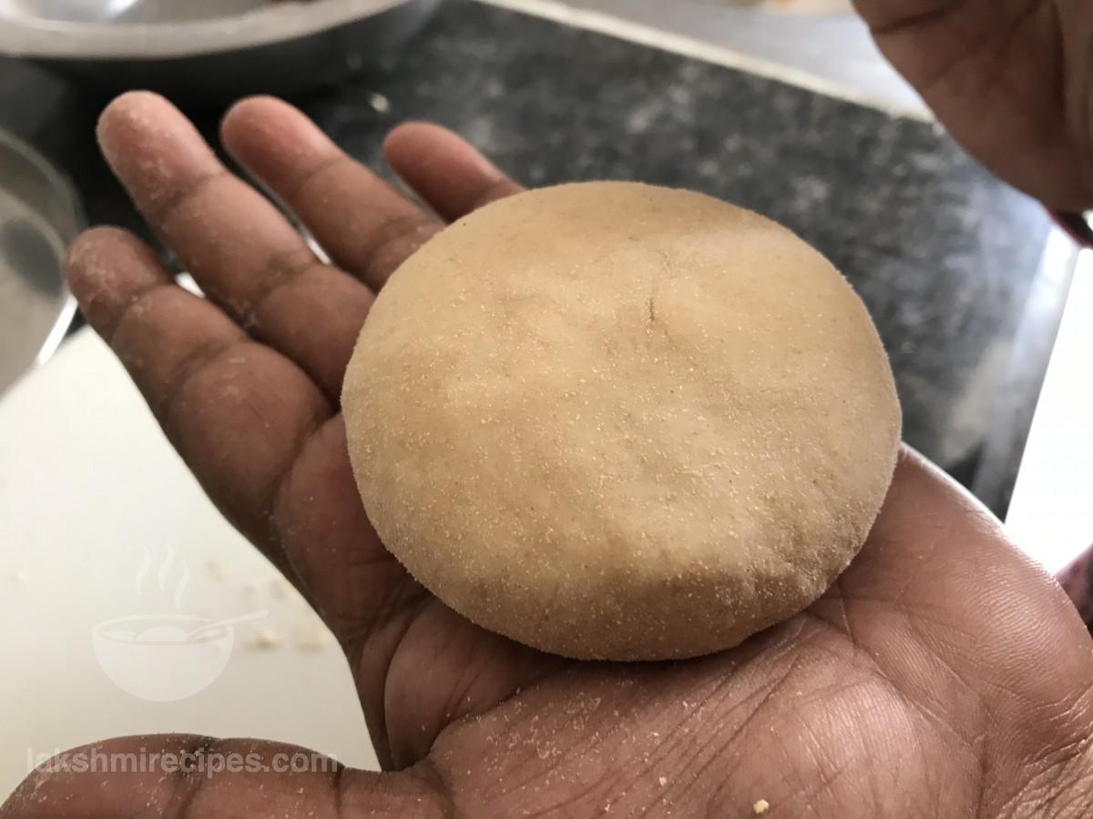 - Now take one ball, smoothen it and then make a depression at its centre and give a shape of a bowl to this wheat ball.