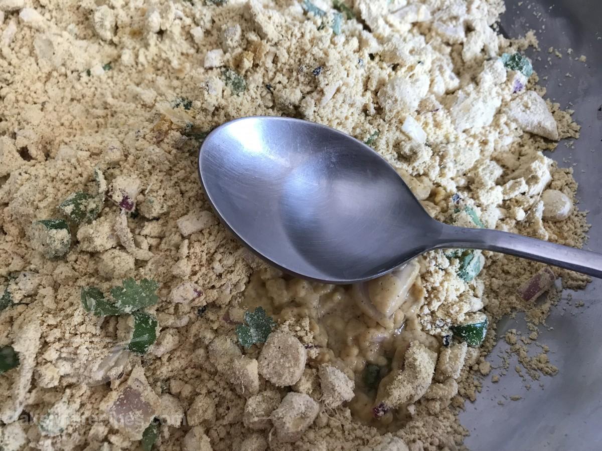 - Crumble the sattu stuffing mixture nicely and check if it begins to bind. If the mixture appears dry then add 2 table spoon water to this sattu stuffing mixture and crumble again. Remember that this sattu stuffing mixture for making Traditional Sattu-Litti should neither be very dry nor very moist in texture.