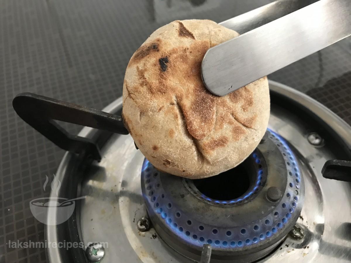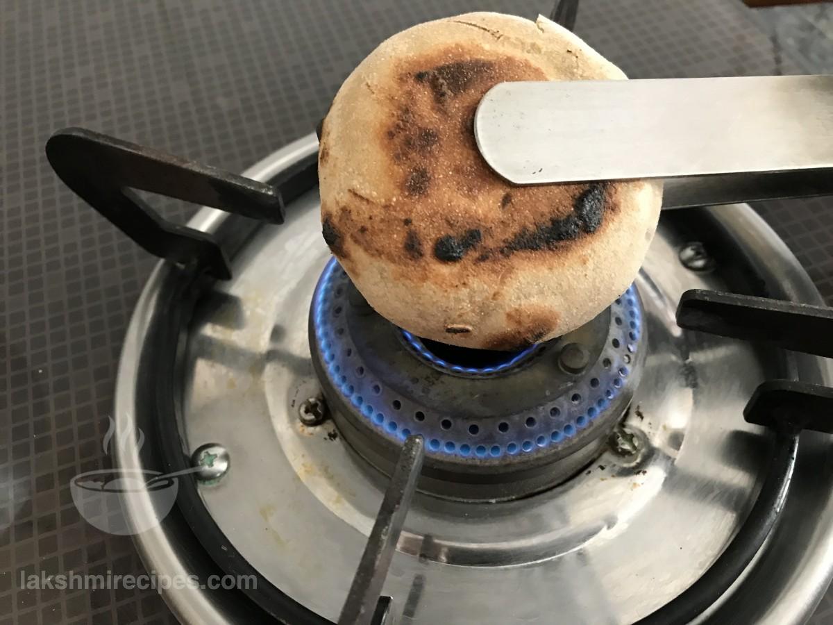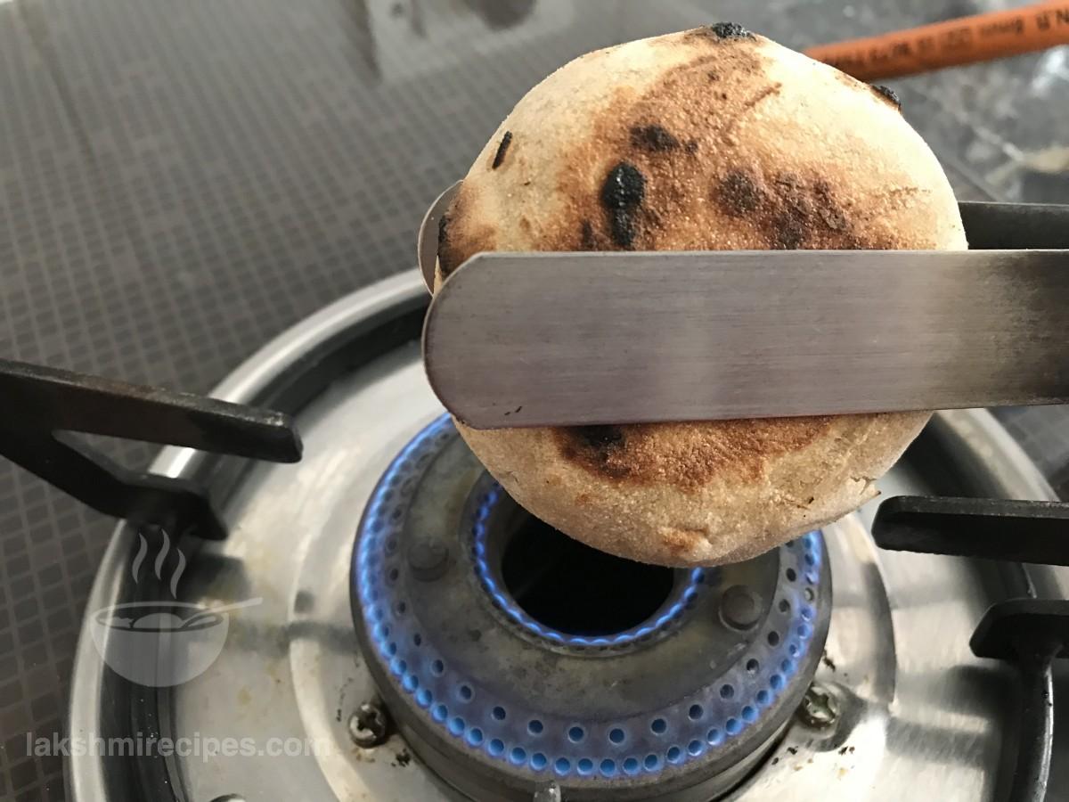 - फिर एक आधी पकी हुई लिट्टी लें और इसे गैस पर चिमटे की सहायता से घुमा-घुमाकर पकाएं। शेष आधी पकी हुई या आंशिक रूप से पकी हुई लिट्टी को इसी तरह से अच्छे से सेक लें। (जैसा कि नीचे दी गई छवियों में दिखाया गया है) (याद रखें कि लिट्टी को पकाते समय आंच एकदम कम हो।)