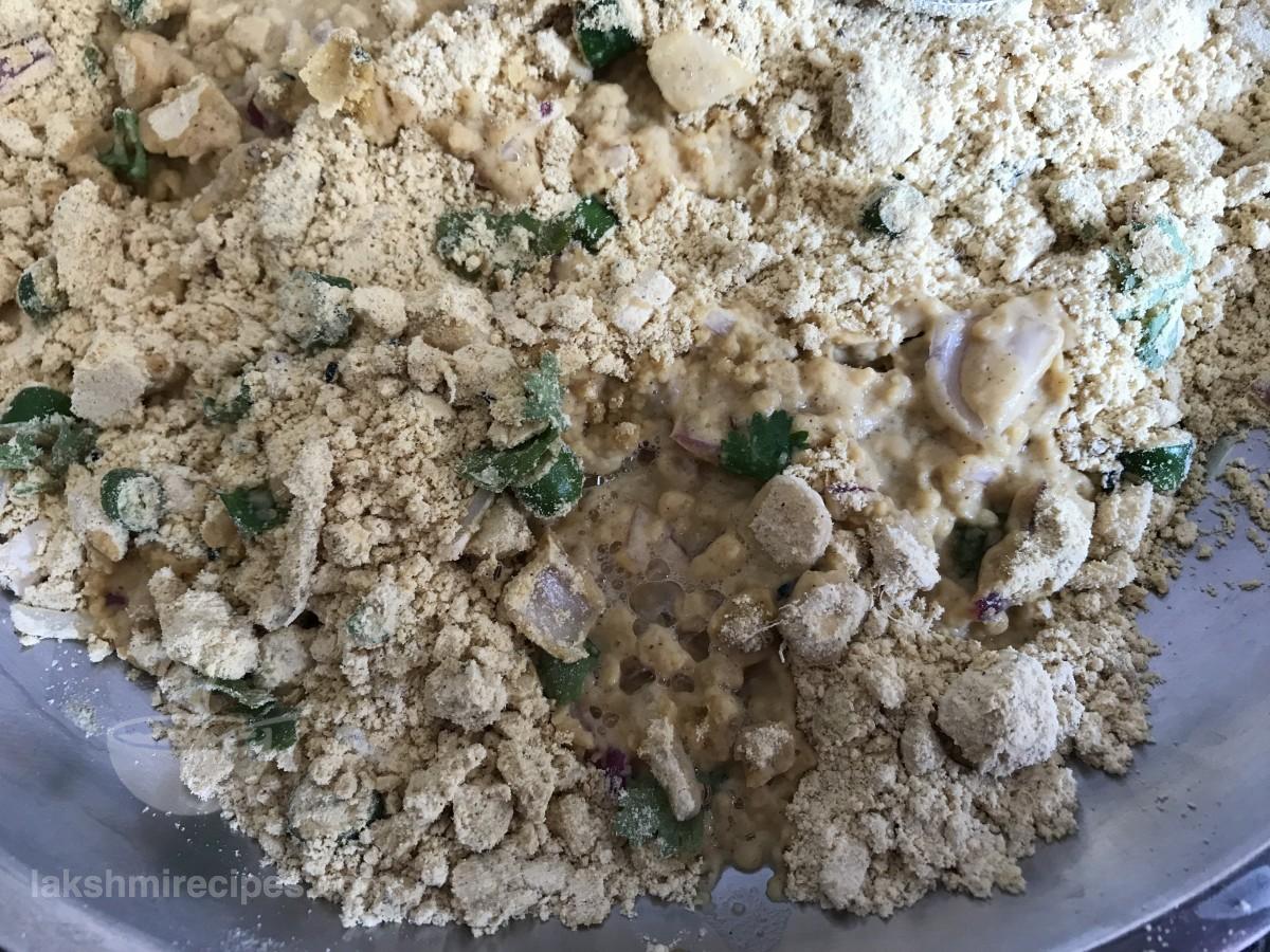 - Add finely chopped onion, ginger, garlic, green chilli and coriander leaves to it.