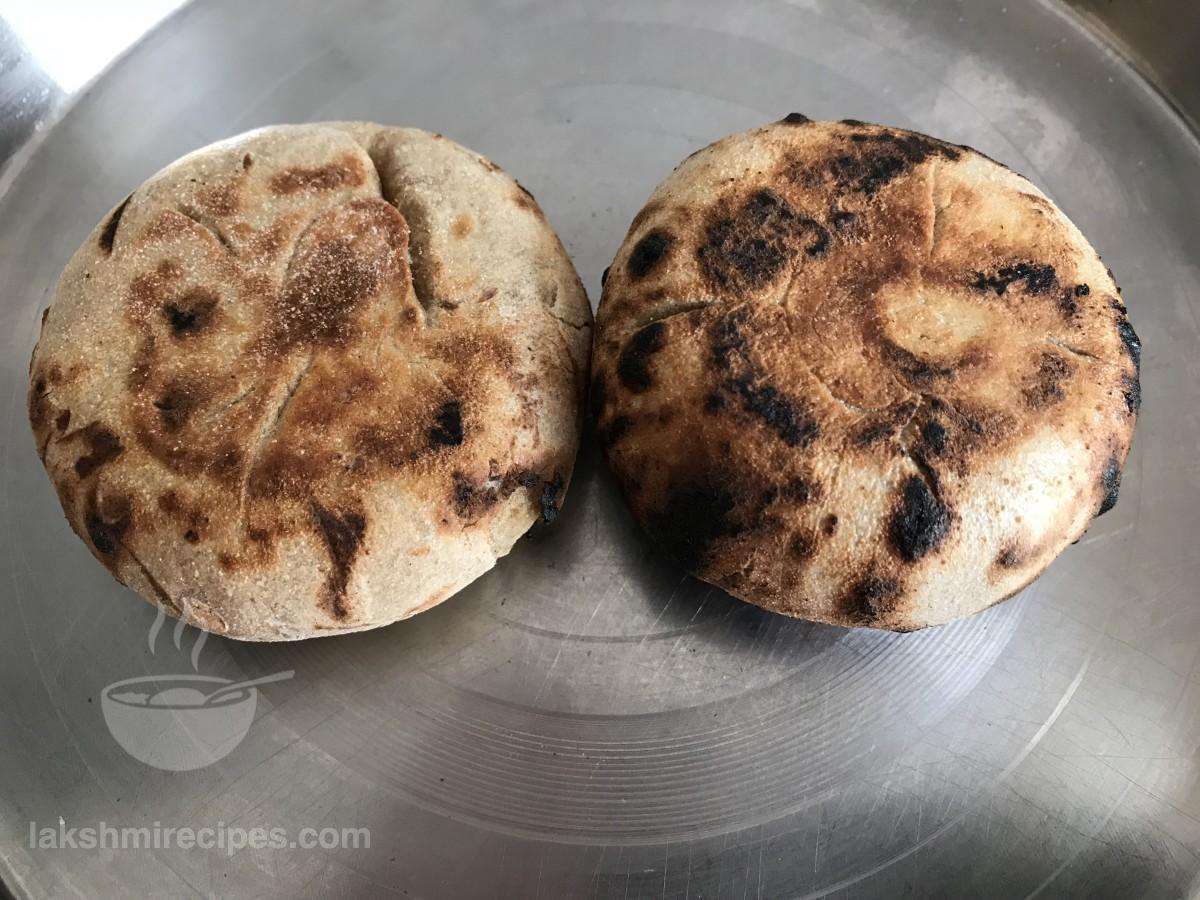 - When all littis are cooked nicely and have golden red spots on both the sides, then remove all of them to a plate. Remove the tawa from the stove.