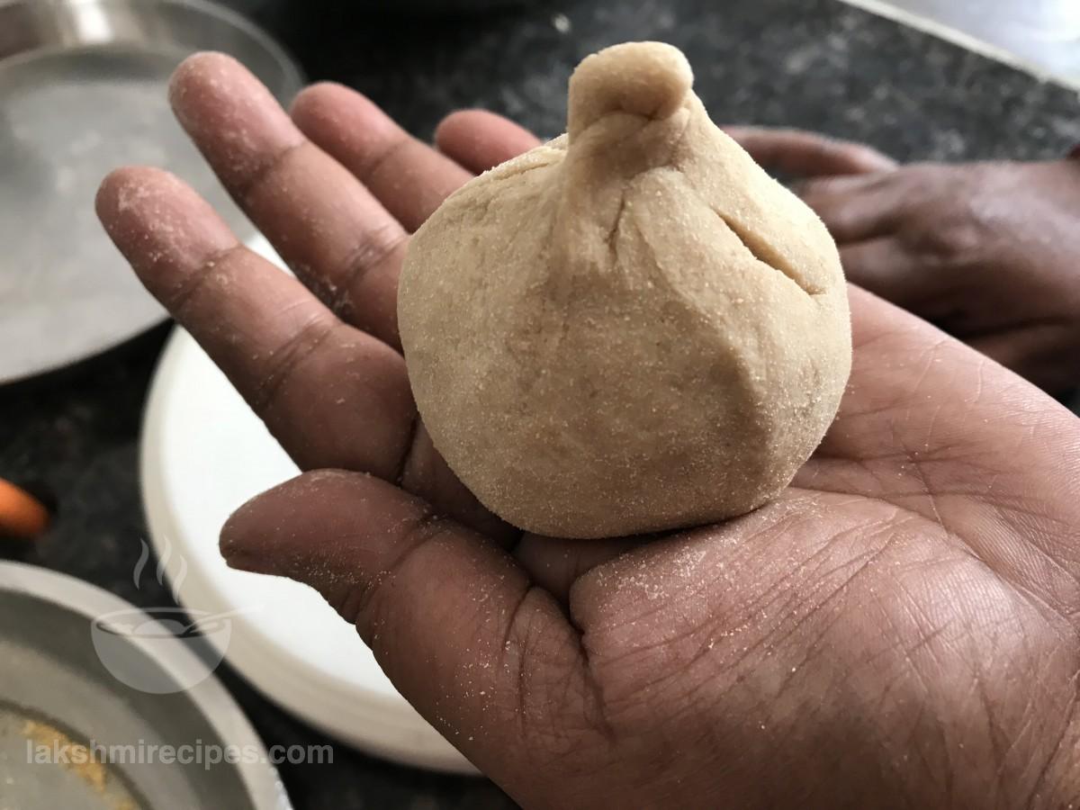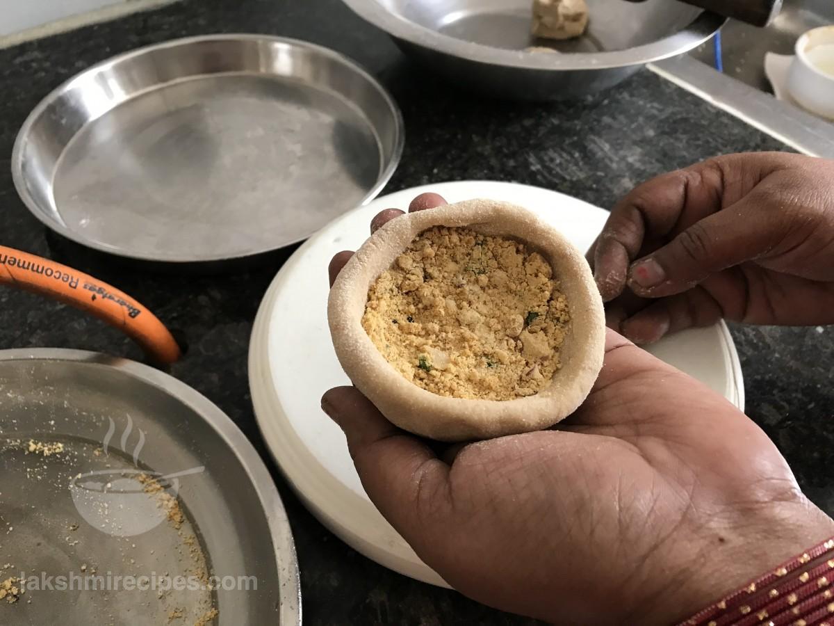 - Then place some sattu stuffing mixture into the whole wheat bowl and then bring the sides together and bind them together. Roll lightly and smoothen again to form a sattu stuffed whole wheat ball.
