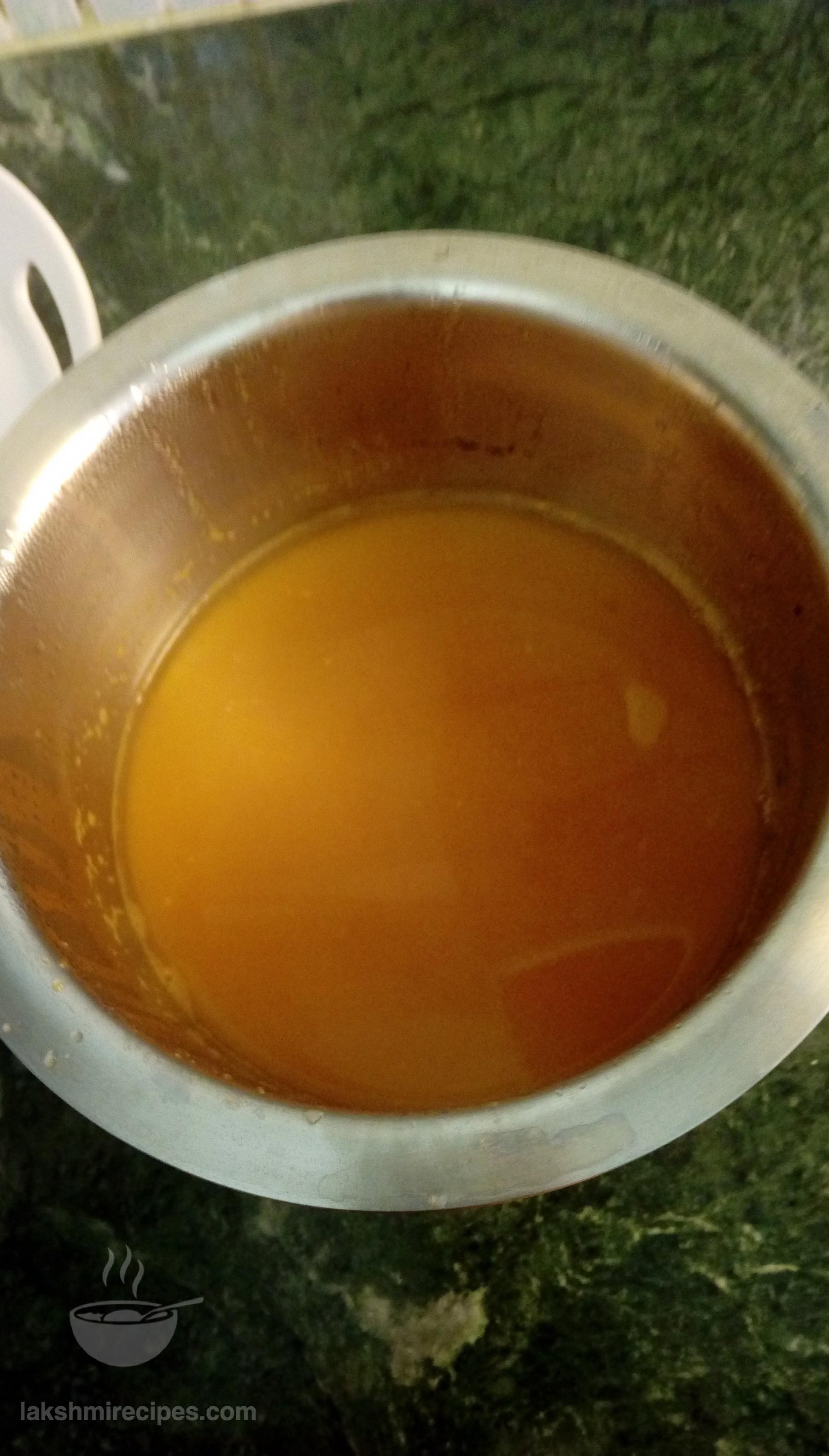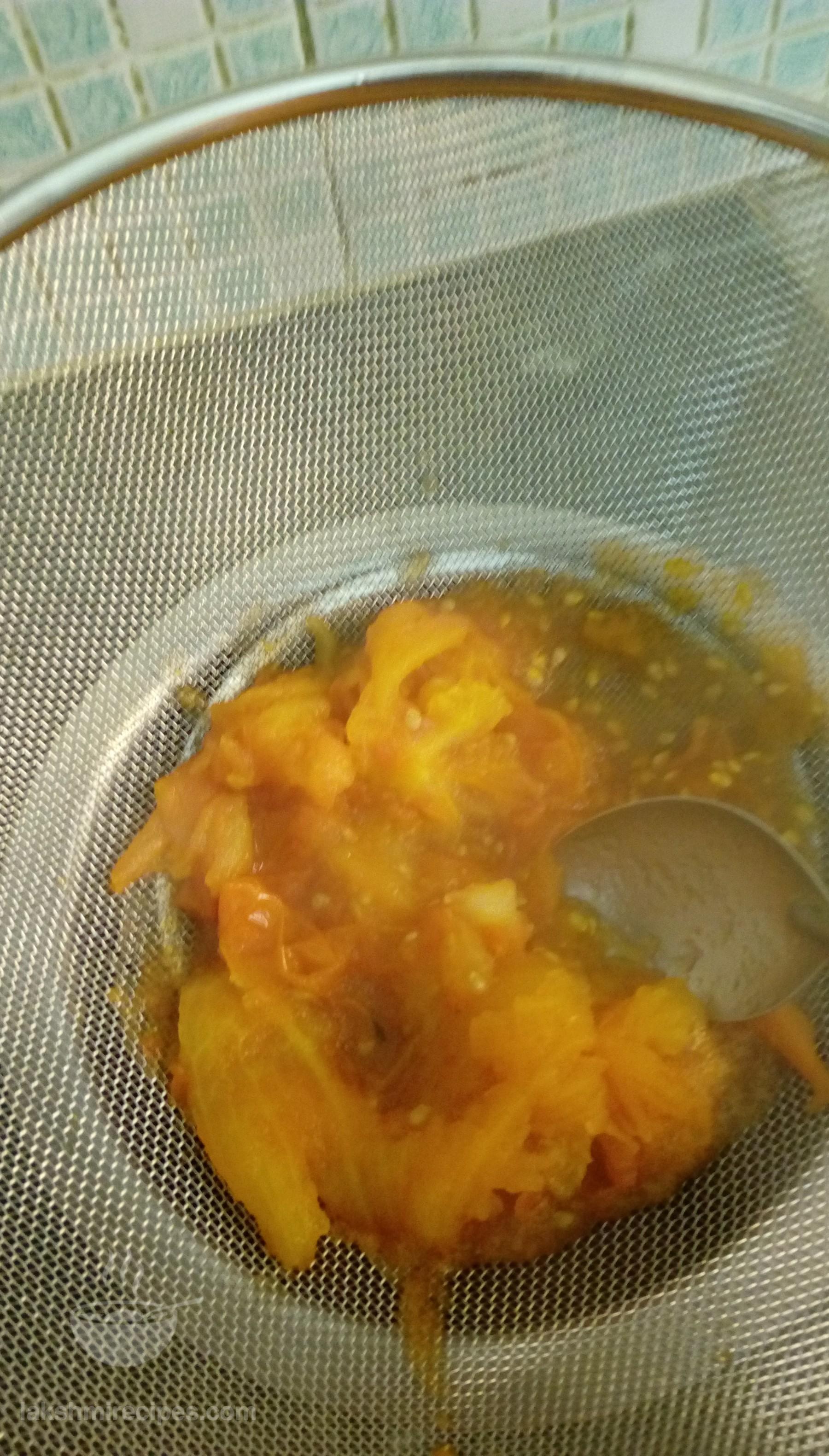 - Now strain the stock prepared from the seeds and flesh, in a seperate vessel and keep it to boil on the gas.