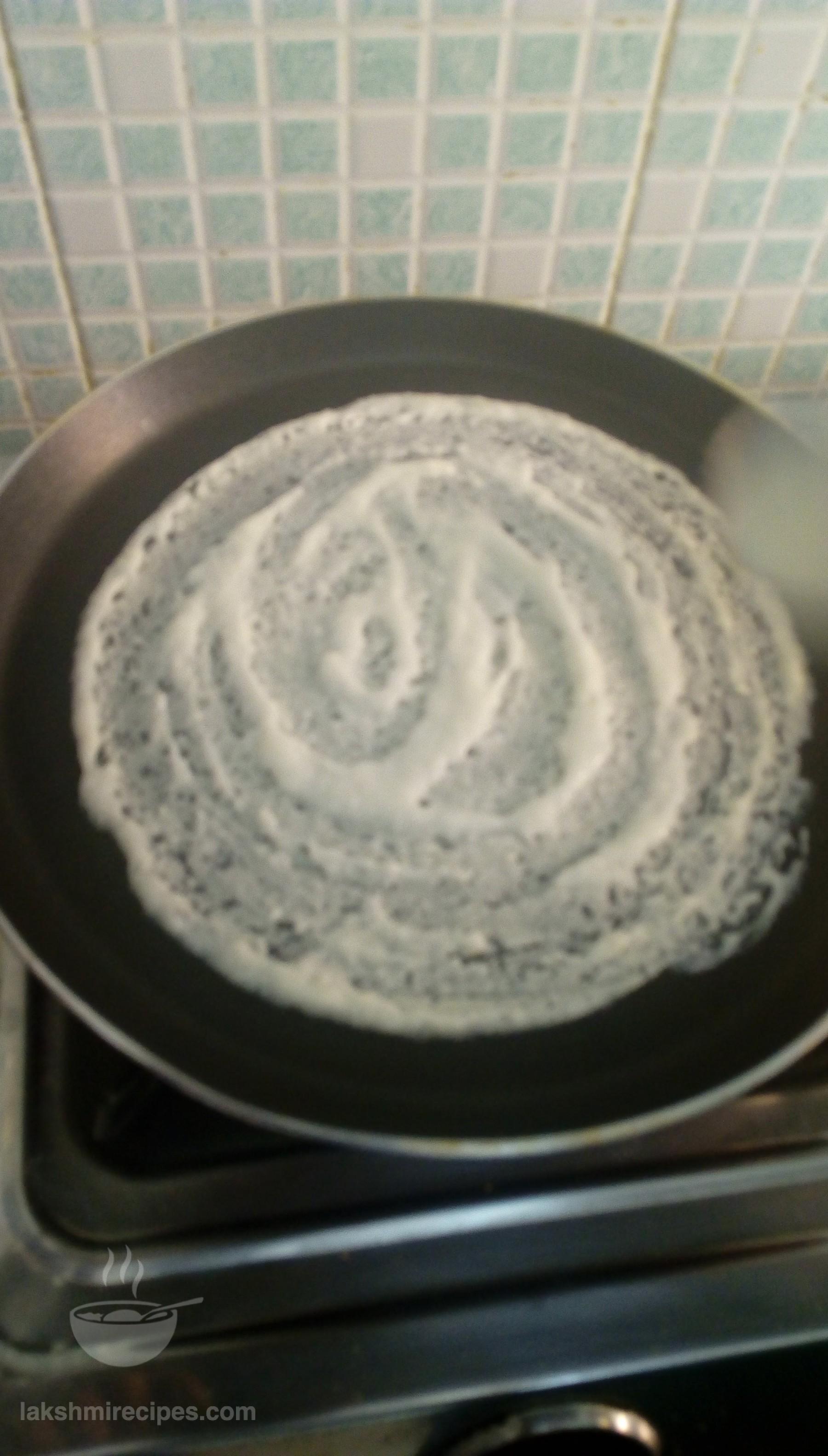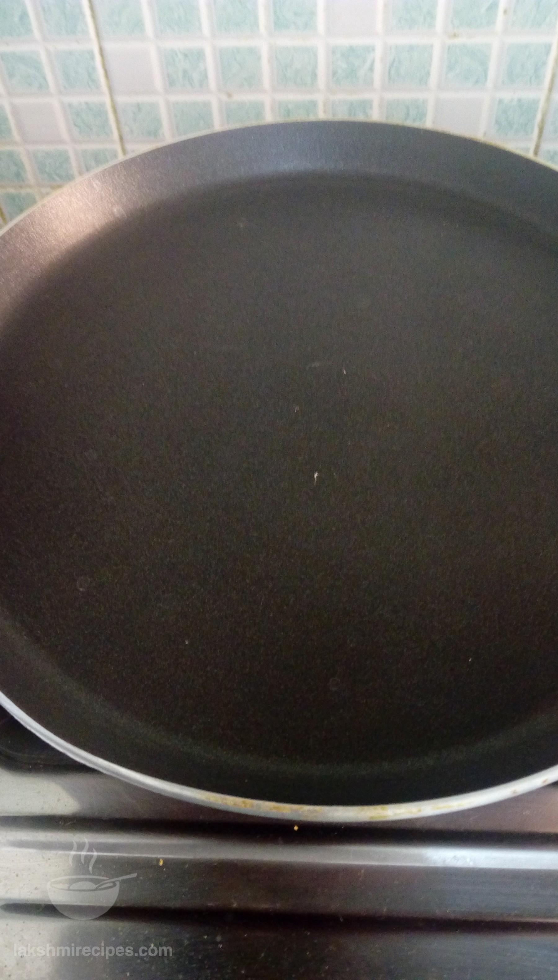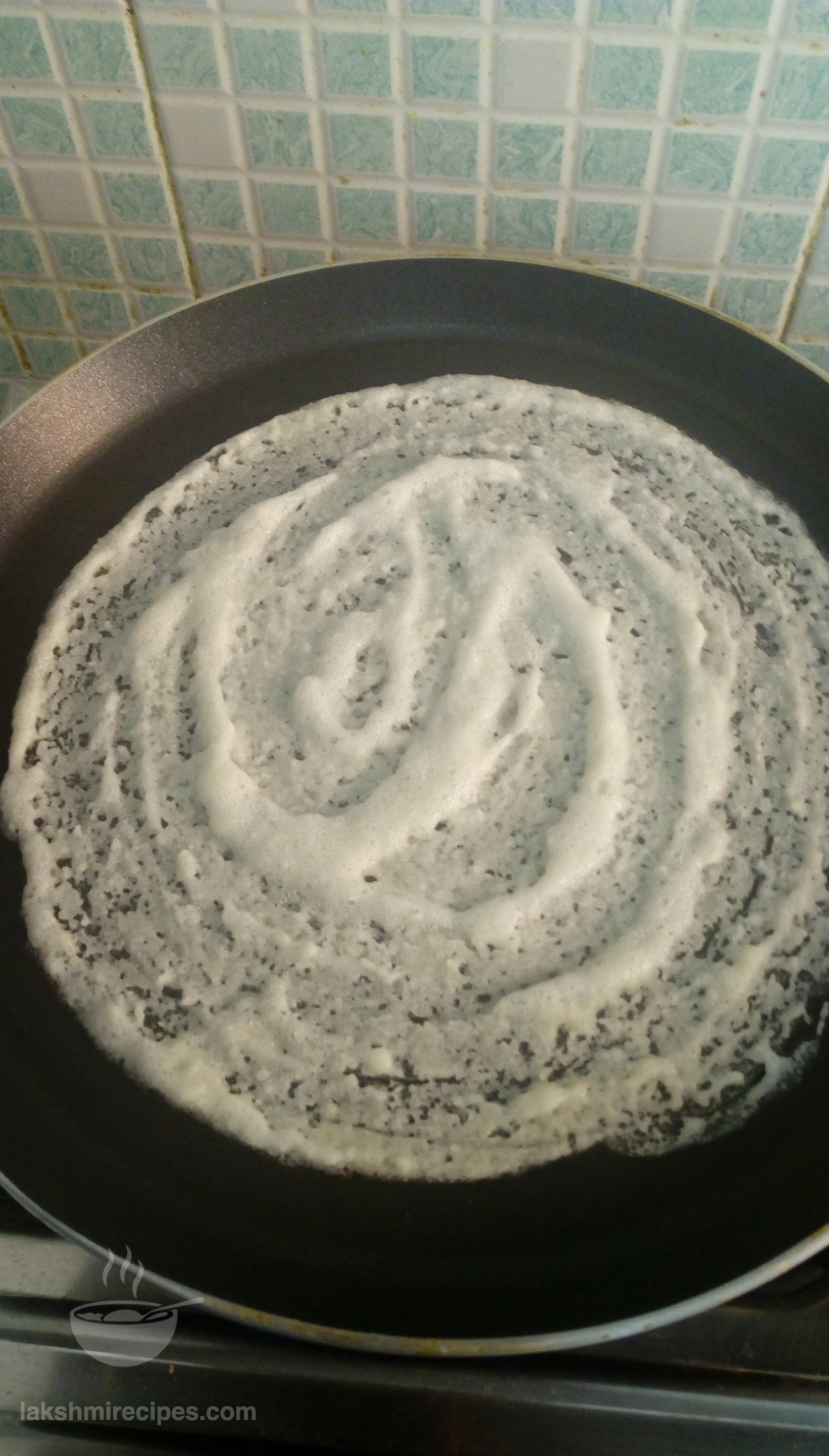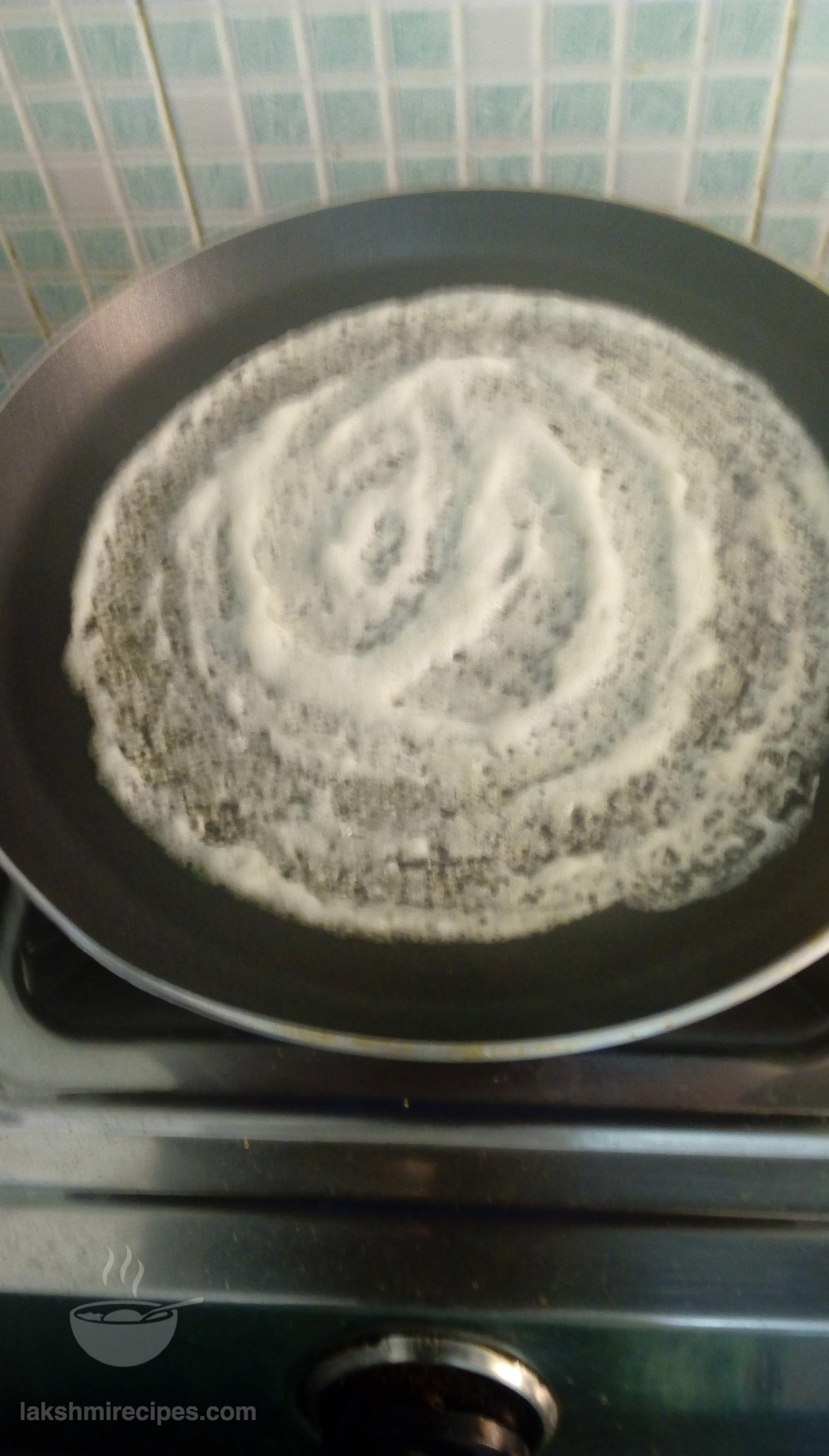 - Now heat 1 tea spoon refine oil on a non-stick tawa and then spread it with a cloth or tissue paper. After this sprinkle some water droplets on the tawa. If they clutter with a loud sound then lower the flame, and pour some batter with a serving spoon in the center of the tawa and spread it uniformly in round shape with the back side of the round ladle, leaving 1/2 inch space along the tawa edge.