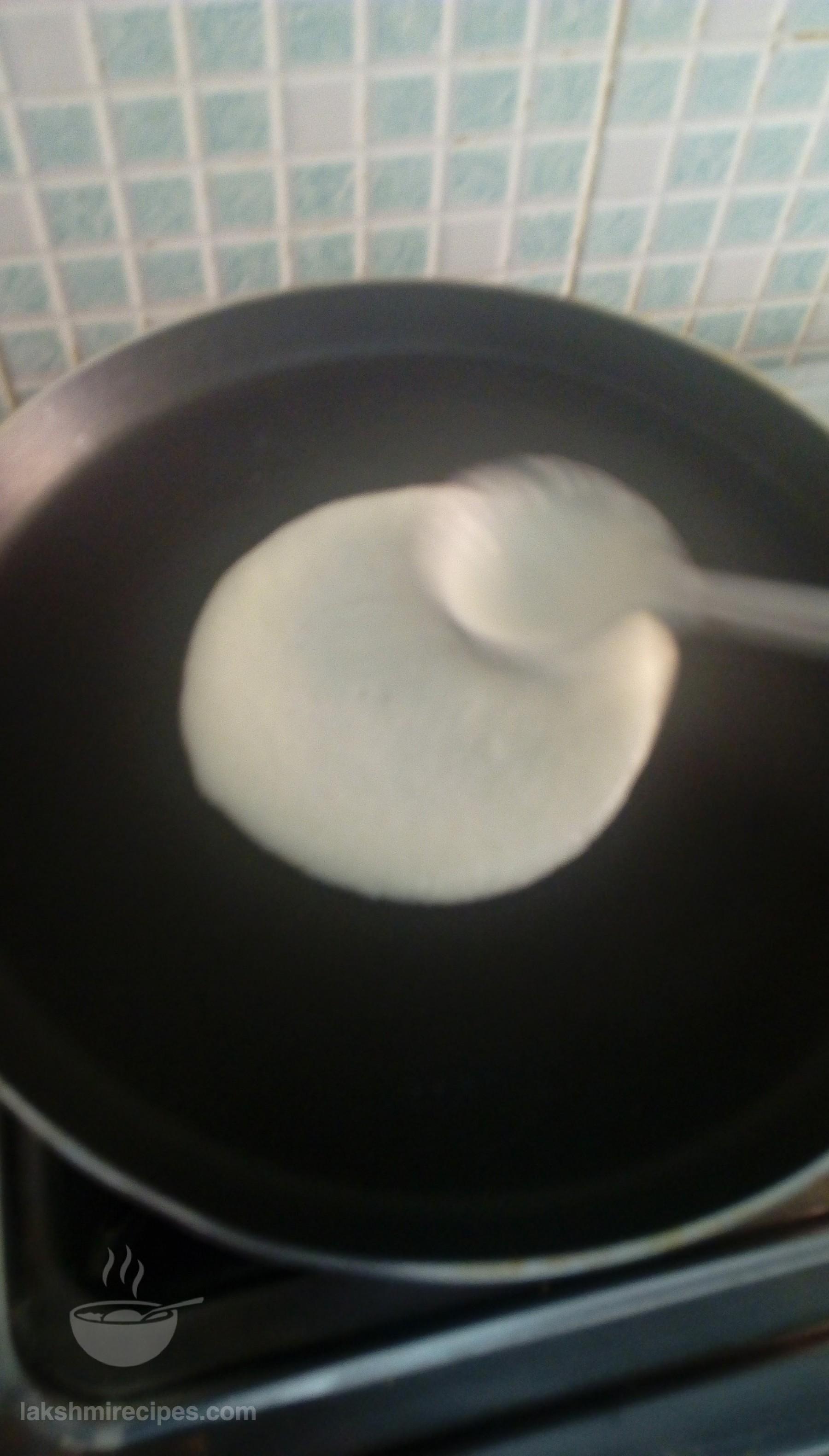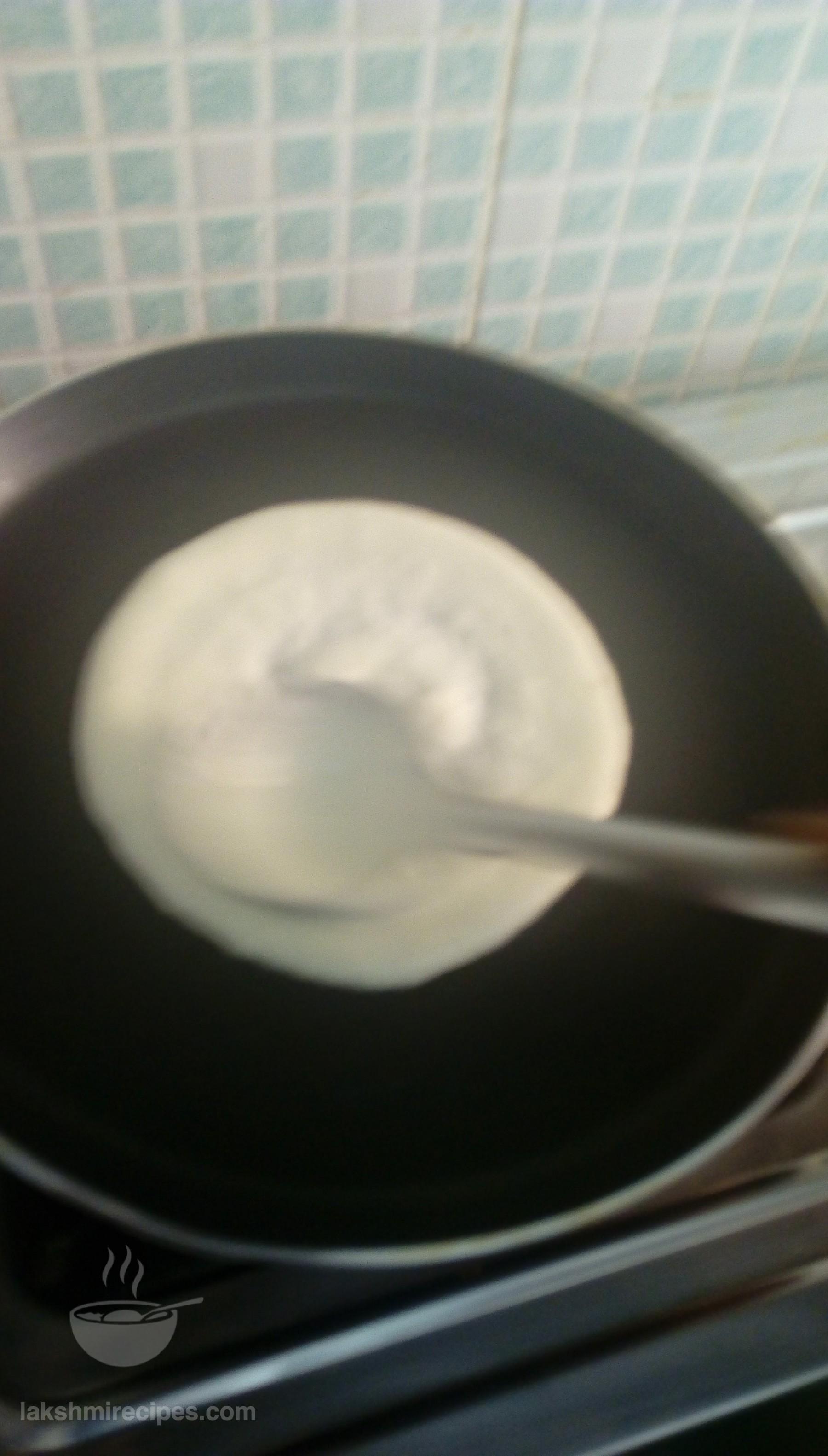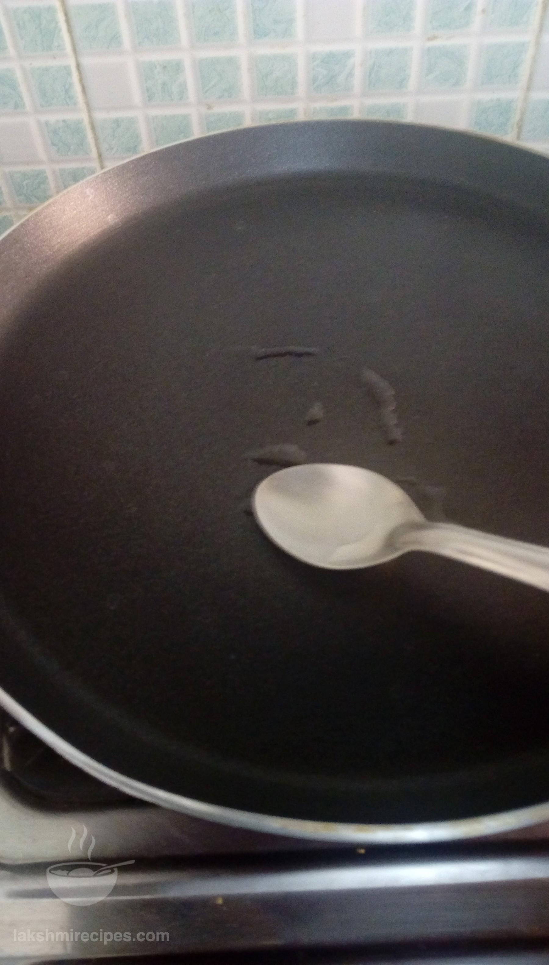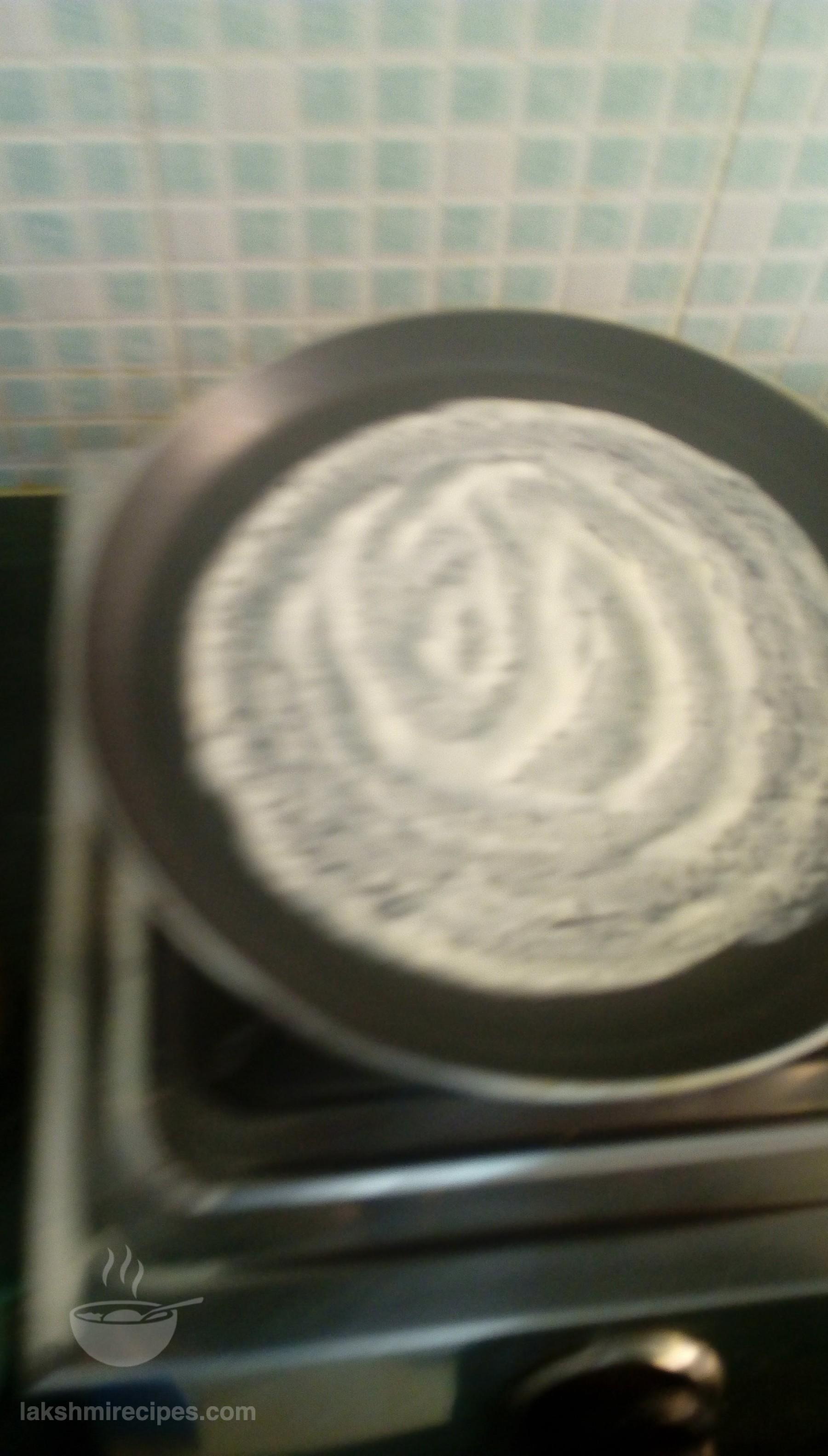 - Now heat 1 tea spoon refine oil on a non-stick tawa and then spread it with a cloth or tissue paper. After this sprinkle some water droplets on the tawa. If they clutter with a loud sound then lower the flame, and pour some batter with a serving spoon in the center of the tawa and spread it uniformly in round shape with the back side of the round ladle, leaving 1/2 inch space along the tawa edge.