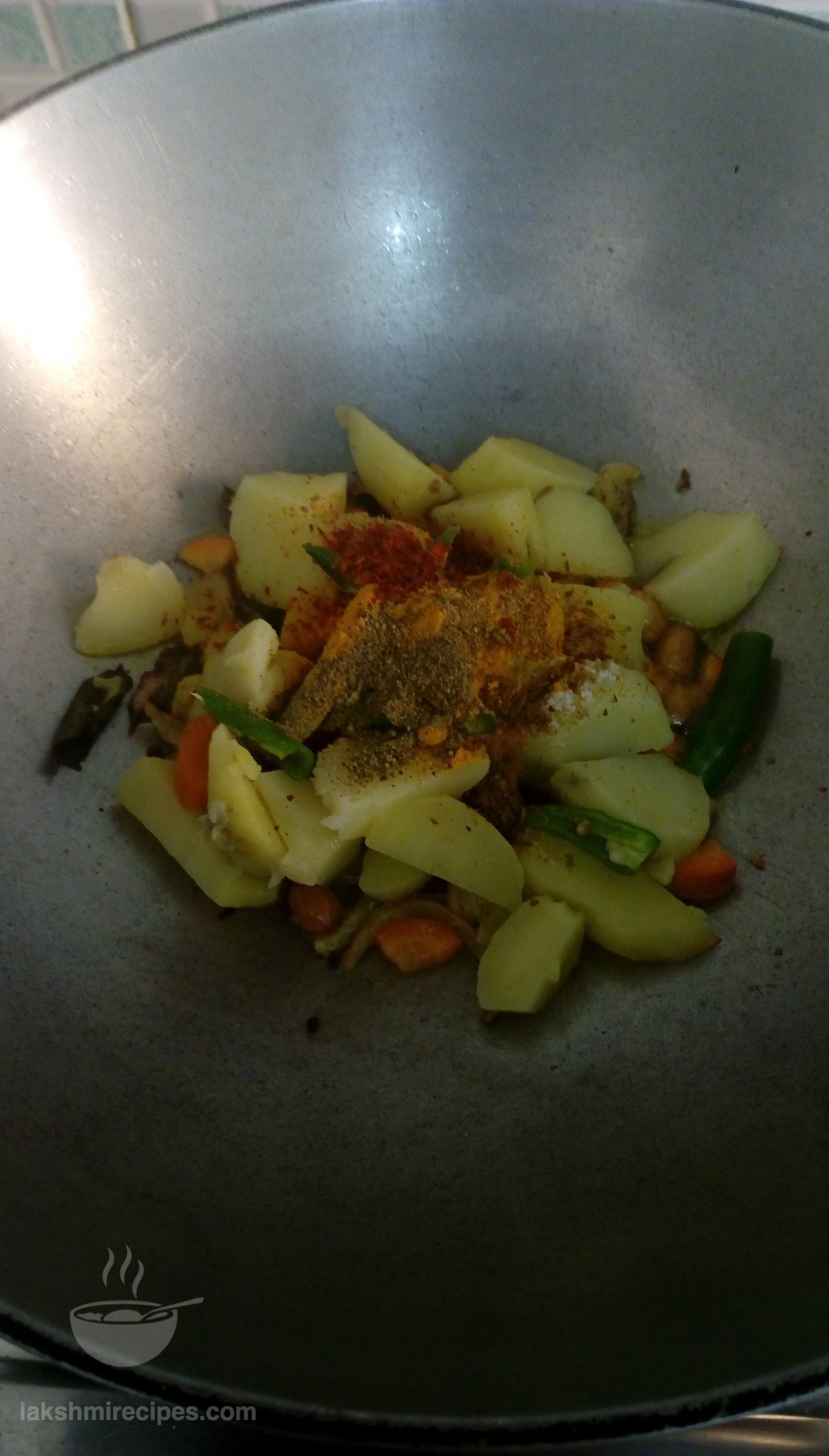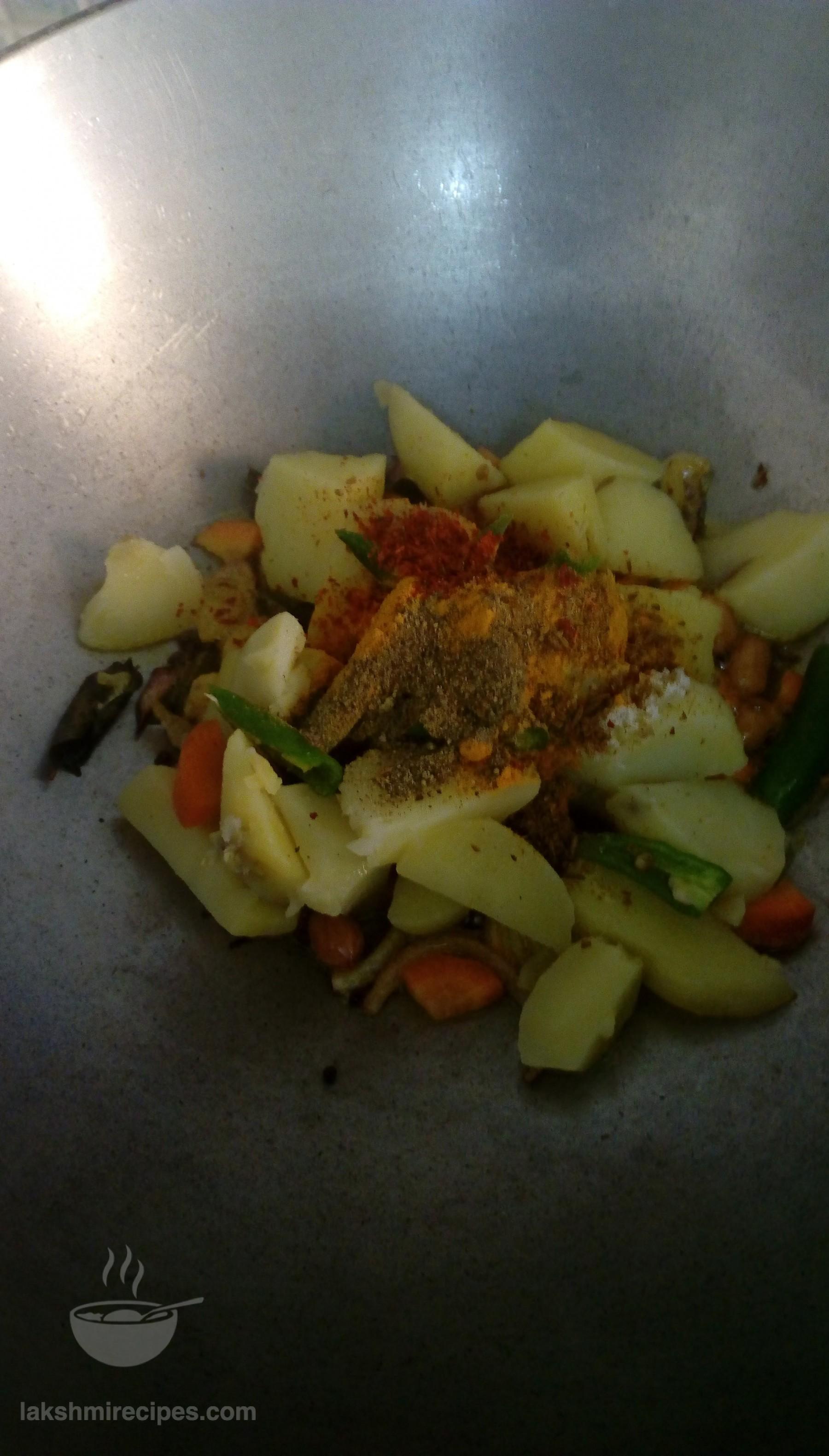 - As the onion turn little red in color add salt as per taste and the spices (haldi powder, jeera powder, kali mirch powder, lal mirch powder). Then add the finely chopped carrot (gajar), green chilli (hari mirch) and boiled potato cut into small pieces to the kadhai. Stir and mix all the ingredients. Add 1/2 cup water and cover the kadhai with a lid, to allow the stuffing to cook.