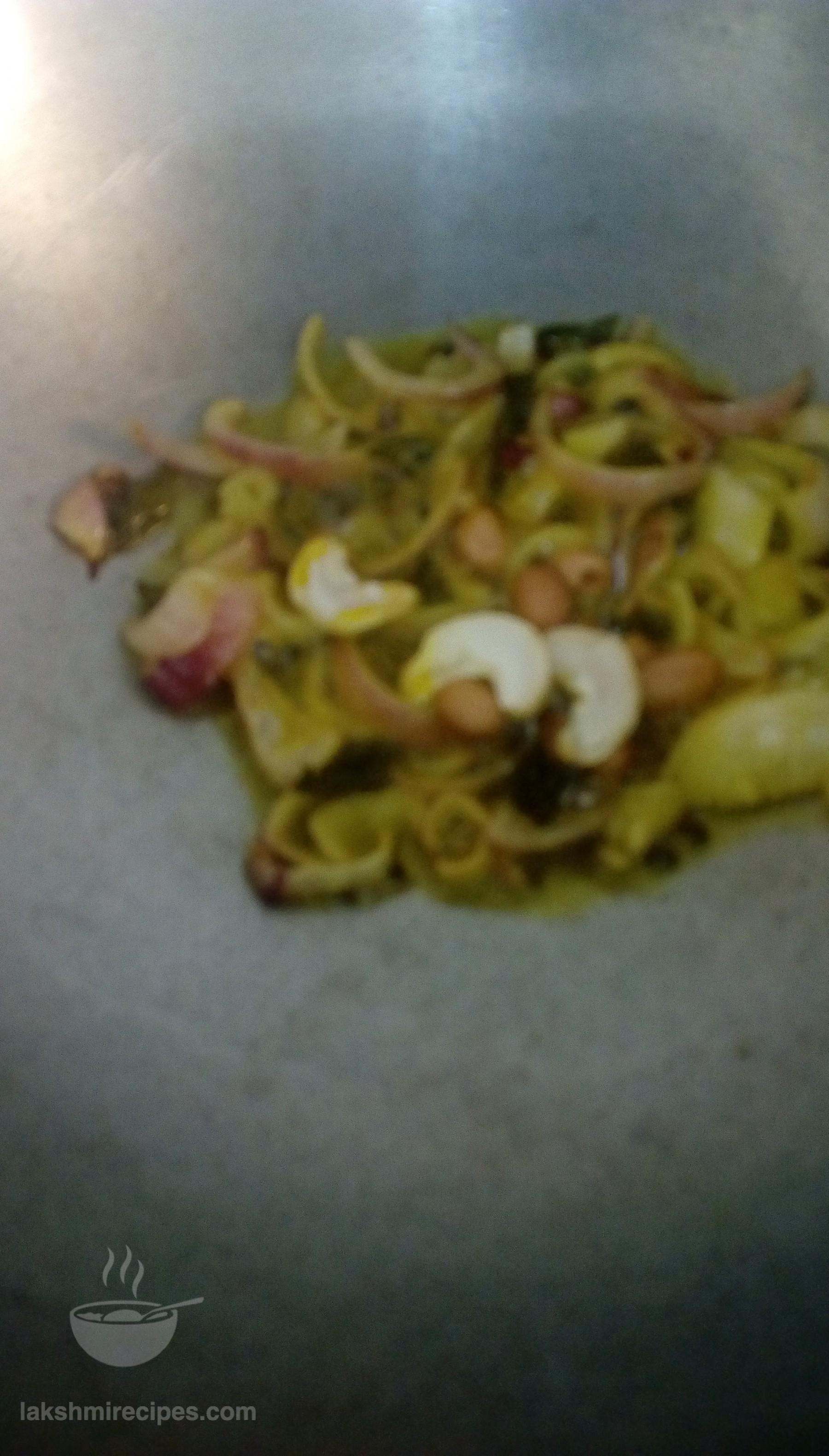 - Now to prepare the dosa stuffing heat some refined oil in a kadhai and cadd mustard seeds (rai) and curry leaves (kari patta) to it. Allow the mustard seeds (rai) to crackle, then add the chopped onions, peanuts (mungfali) and cashews (kaju) to it. Stir and allow them to turn red.