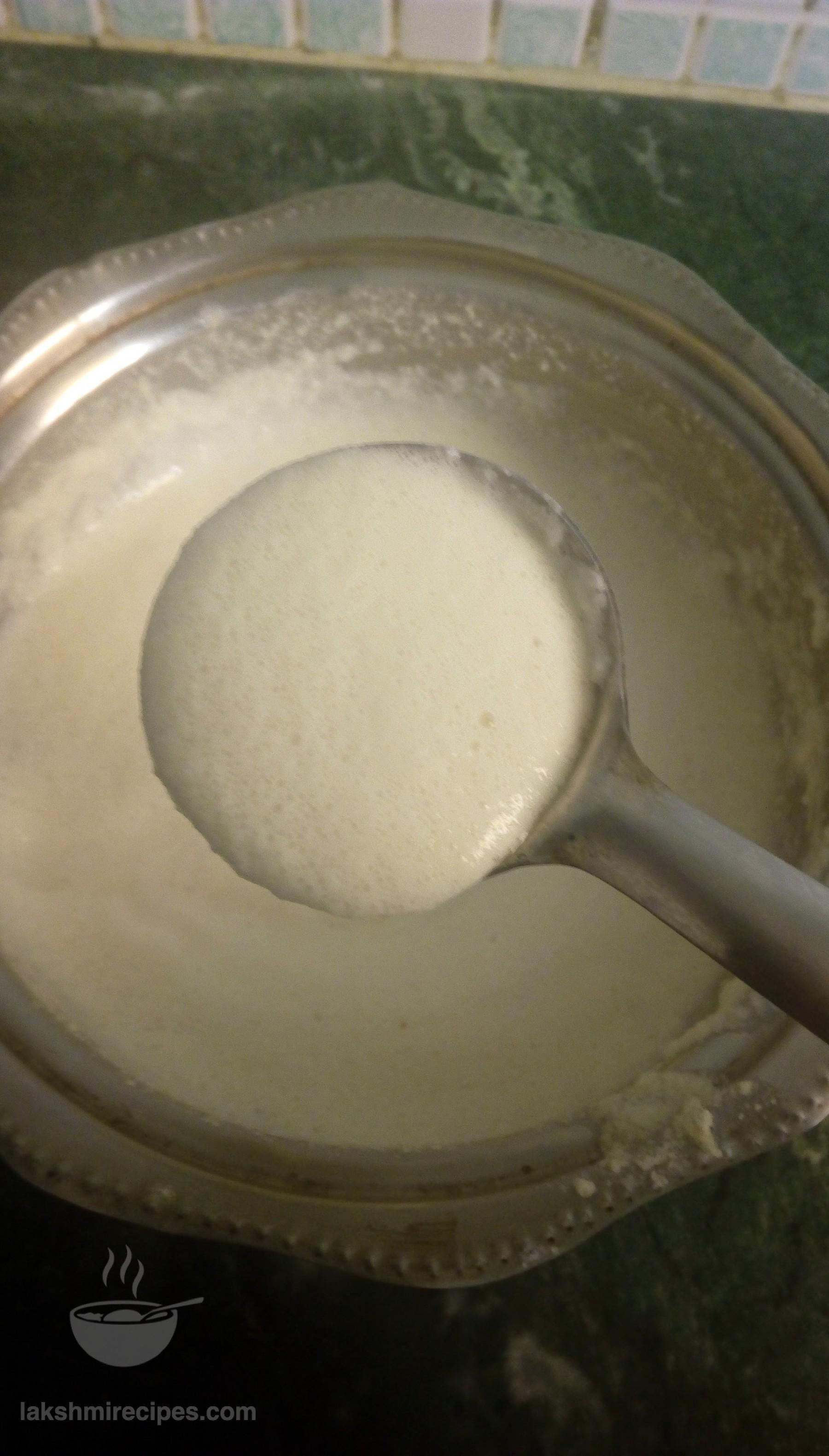 - After 10-12 hours of time you will see that the batter has risen to double its level. Then whisk it with a spoon. The dosa batter should be of medium thick consistency. If its very thick then it will not spread on the tawa easily and if it is of very thin consistency then dosa will stick to the tawa.