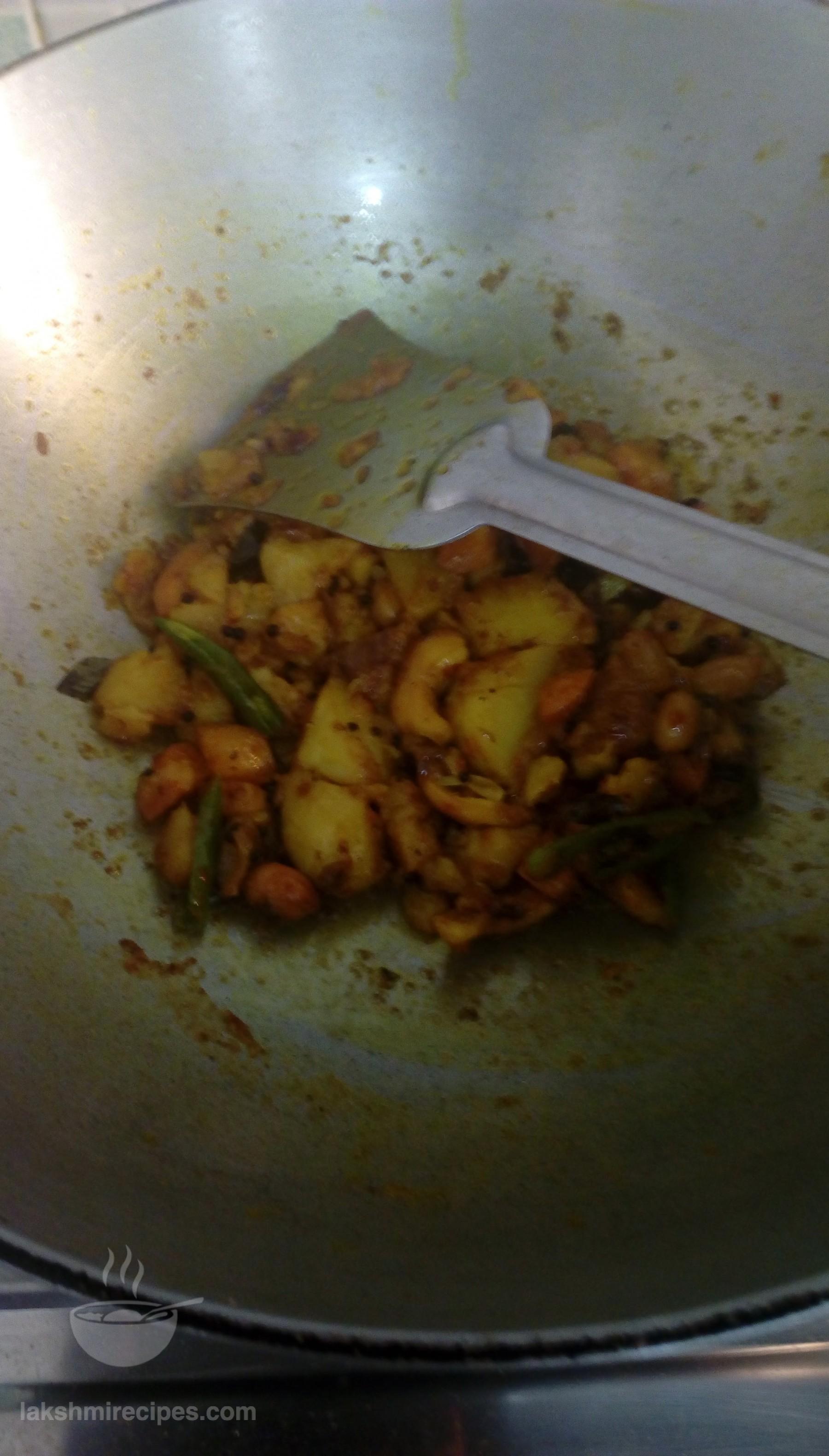 - After some time remove the lid and check if the stuffing is cooked and the moisture has evaporated. Stir and mash the stuffing a little with the spatula. Mix all the ingredients well, turn off the flame and then transfer the ingredients to a seperate vessel.