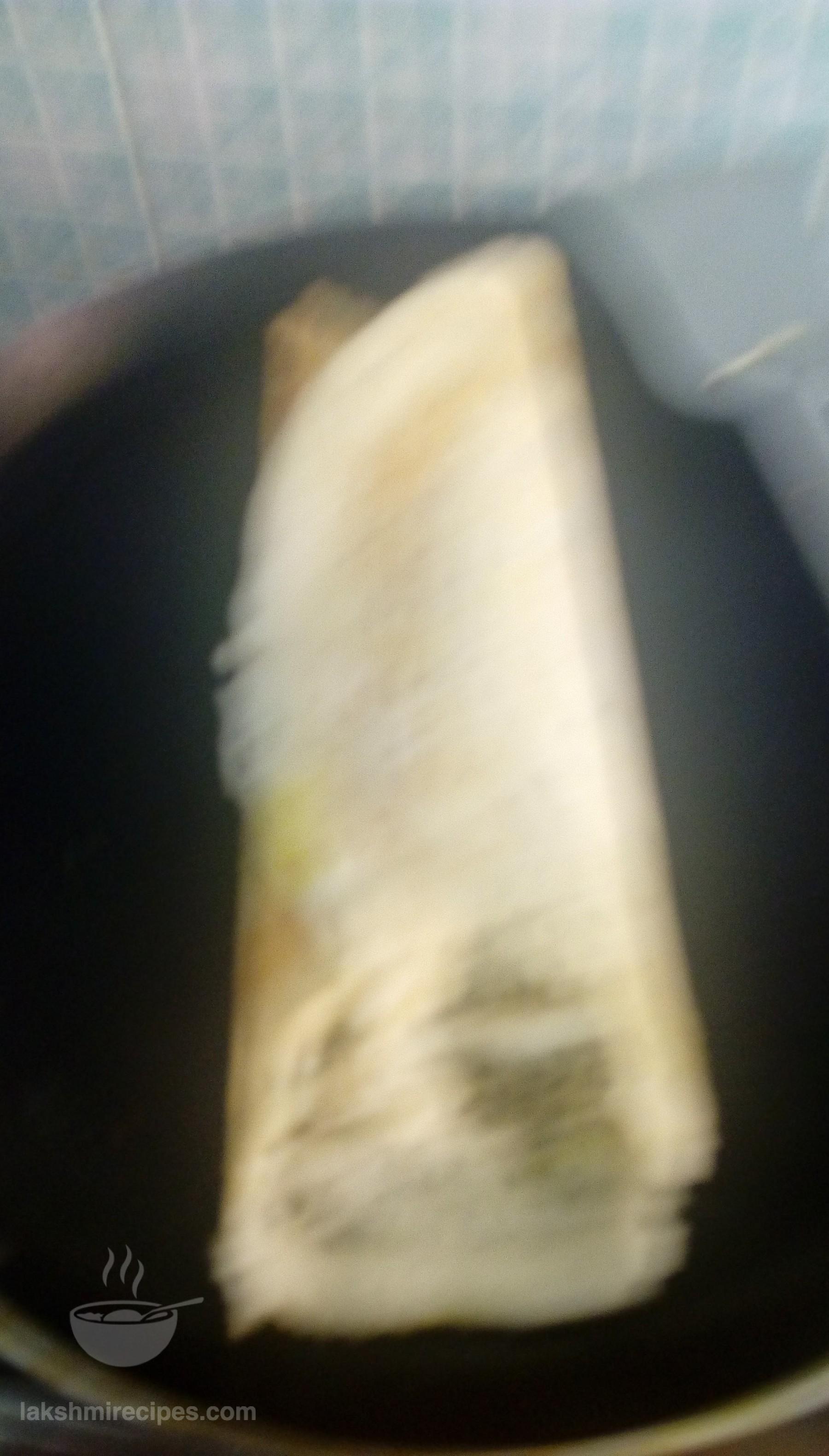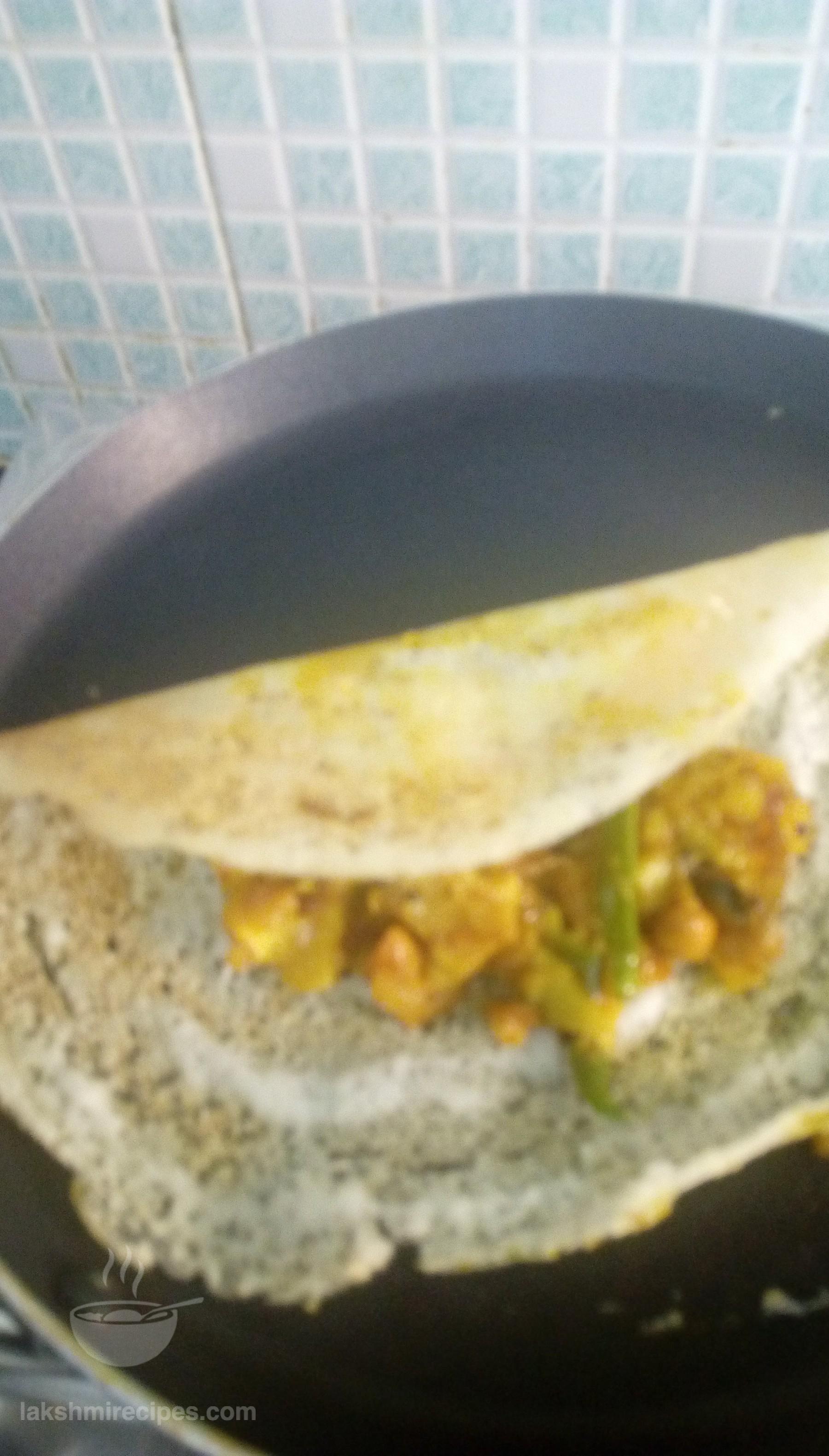 - When the dosa appears red onits base, then put some stuffing in the center and fold the sides (as shown in the image below). Invert and serve it hot in a beautiful dish with coconut chutney (nariyal ki chutney) and sambhar.