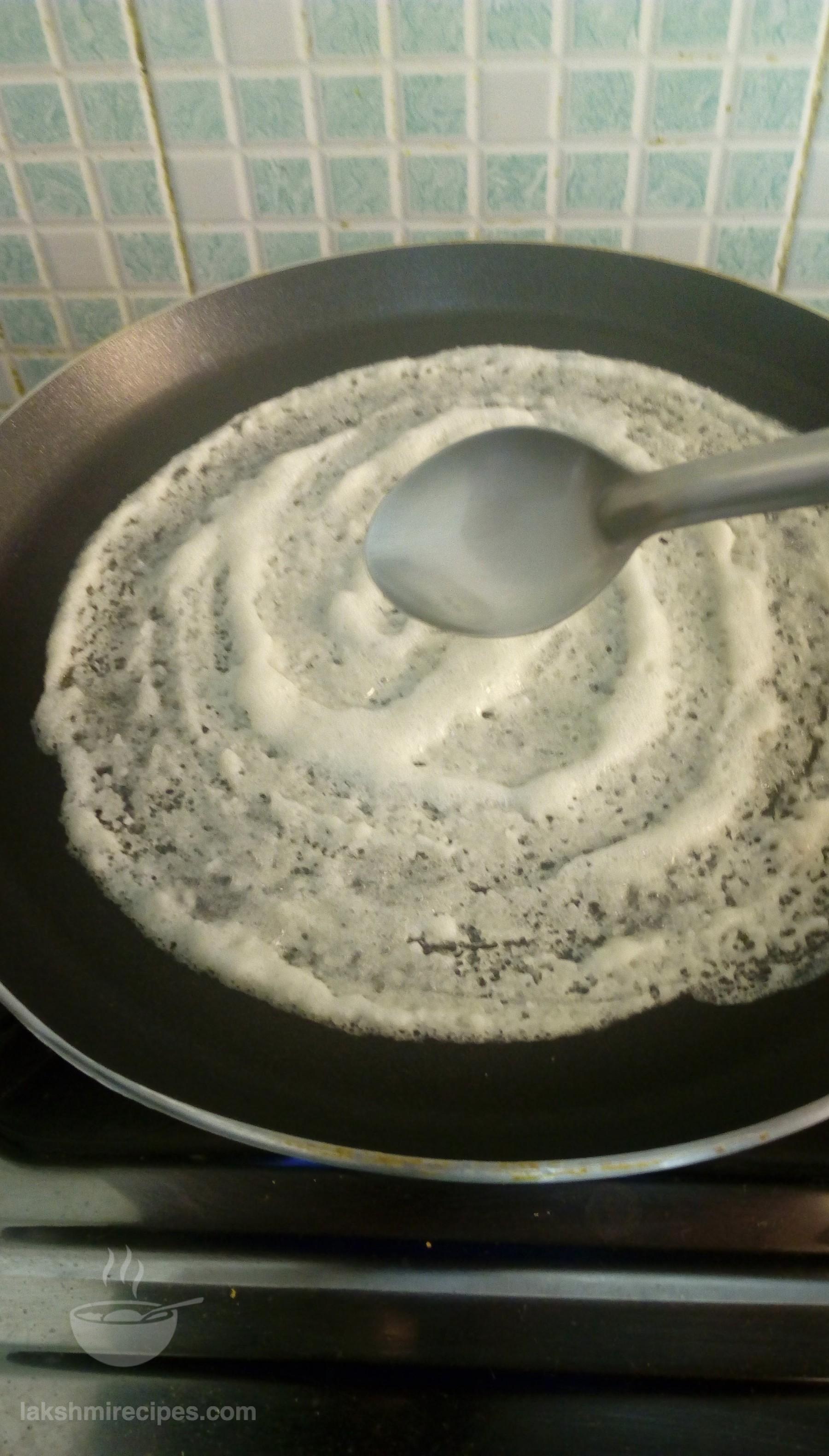 - Pour 1 spoon oil along the sides and allow the dosa to cook on low flame. We do not need to flip the dosa and cook on the other side directly.