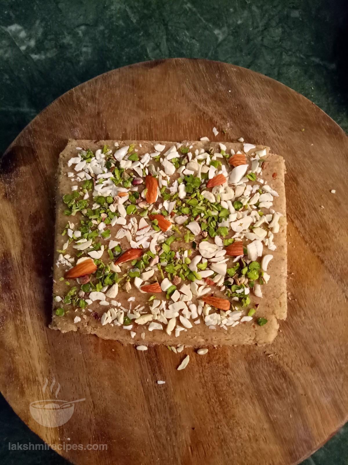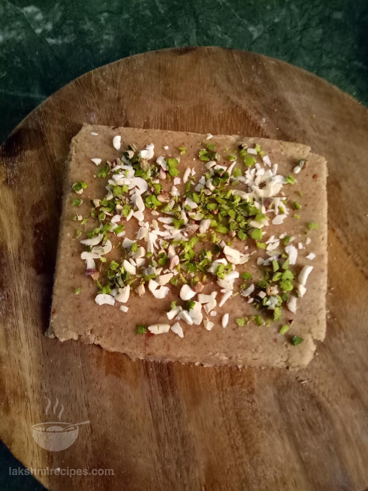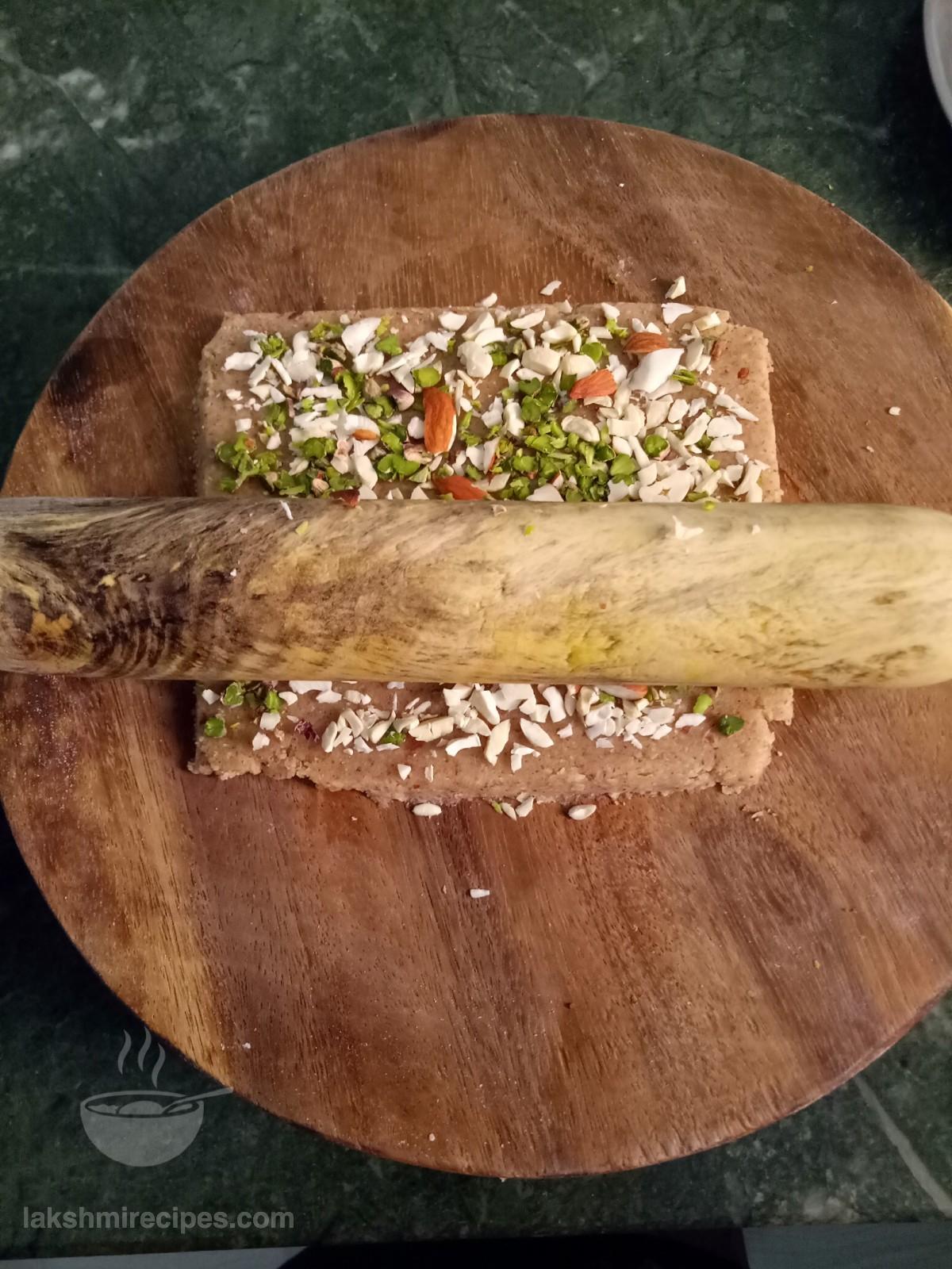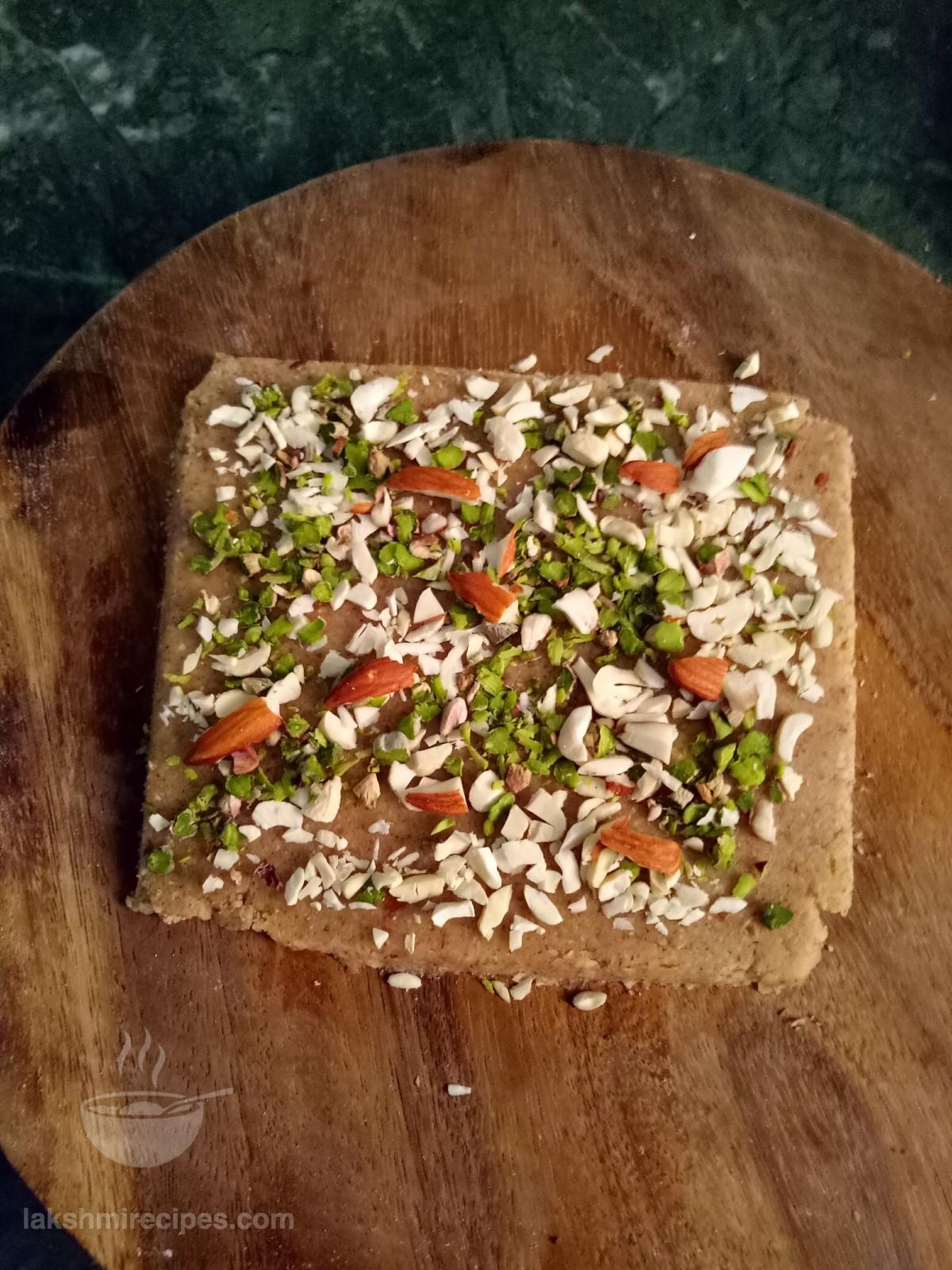 - अब इस पर कटे हुए ड्राई-फ्रूट्स (काजू, बादाम और पिस्ता) को डालें और बेलन की सहायता से हल्के से दबा कर एक समान परत बना लें (जैसा कि नीचे दी गई छवि में दिखाया गया है)।