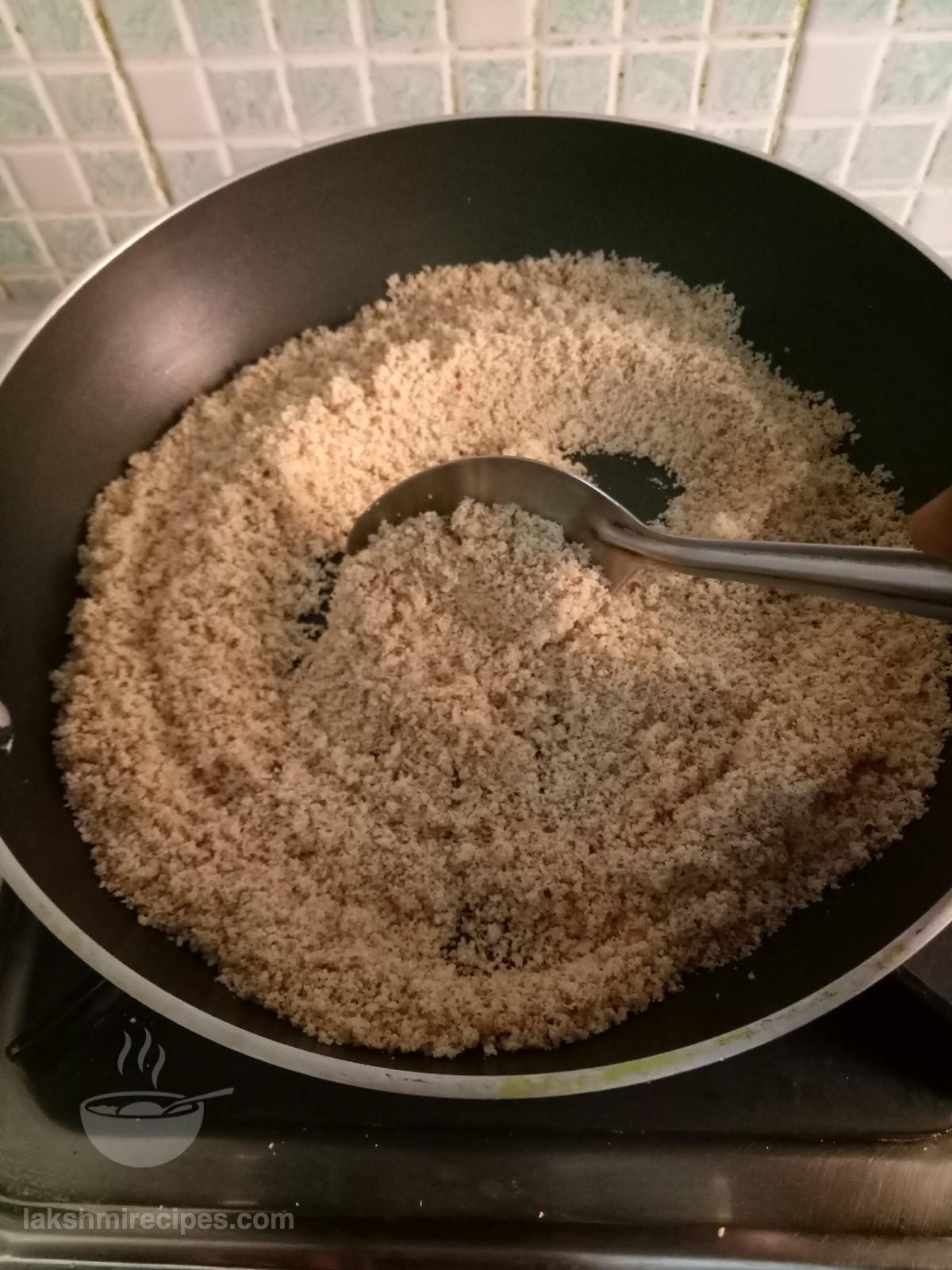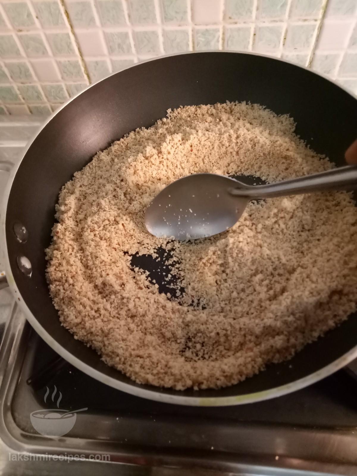 - Heat a non-stick pan and then lower the flame to low level. Transfer the powder of almonds (prepared in previous step) to the non-stick pan. Stir continuously to dry roast the powder of almonds in the non-stick pan for 5 minutes over low flame only.