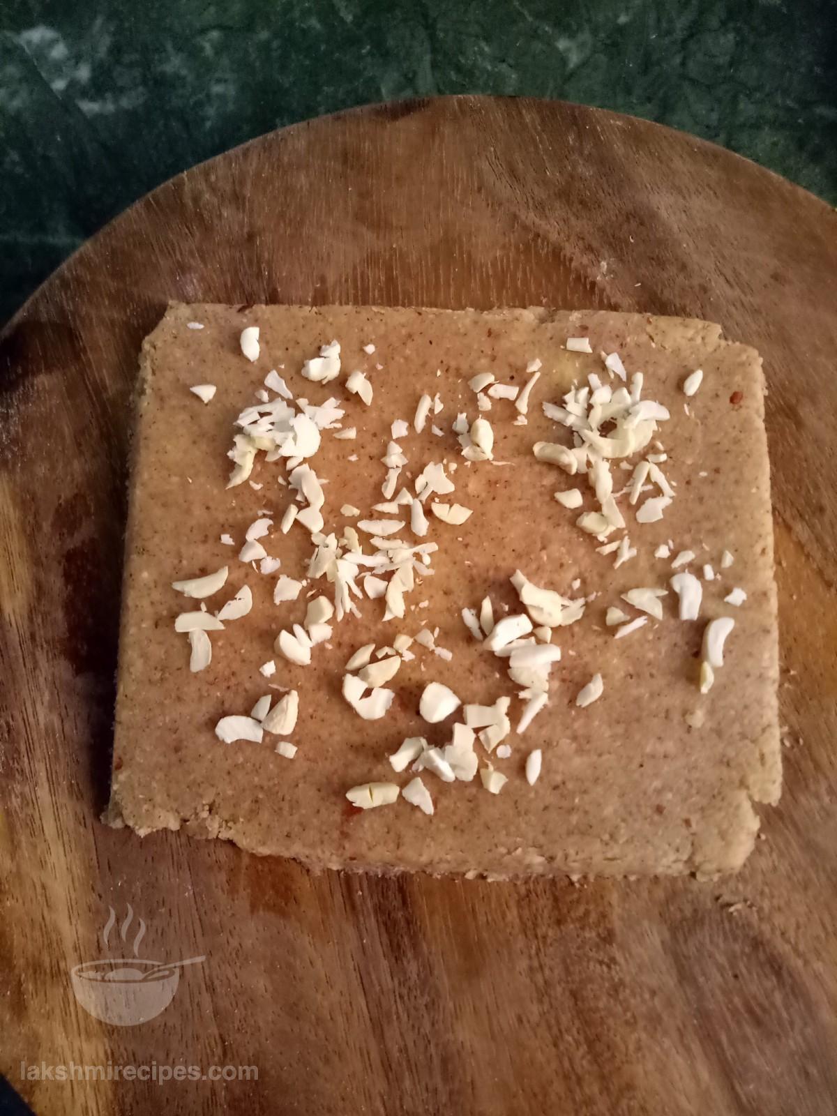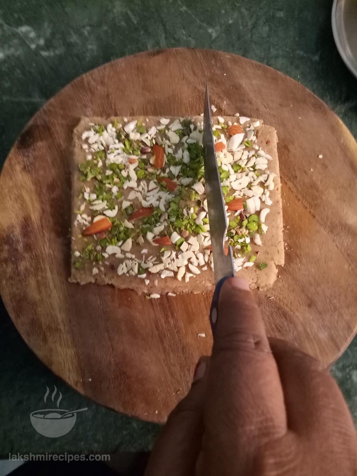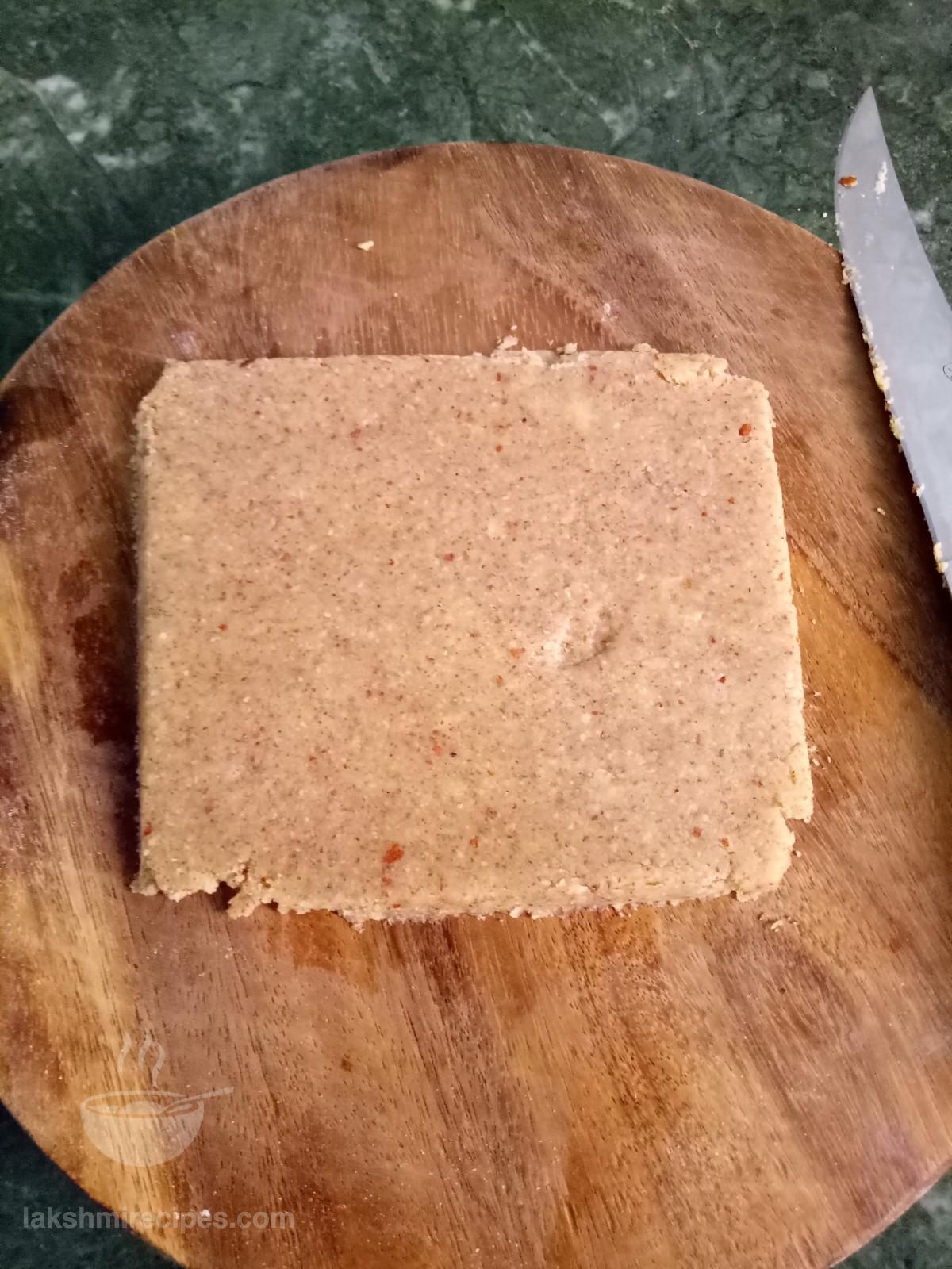 - Now roll this dough flat with a rolling pin to cut out the barfis from it (as shown in the image below). You can alter the thickness of the barfi as per your requirement.