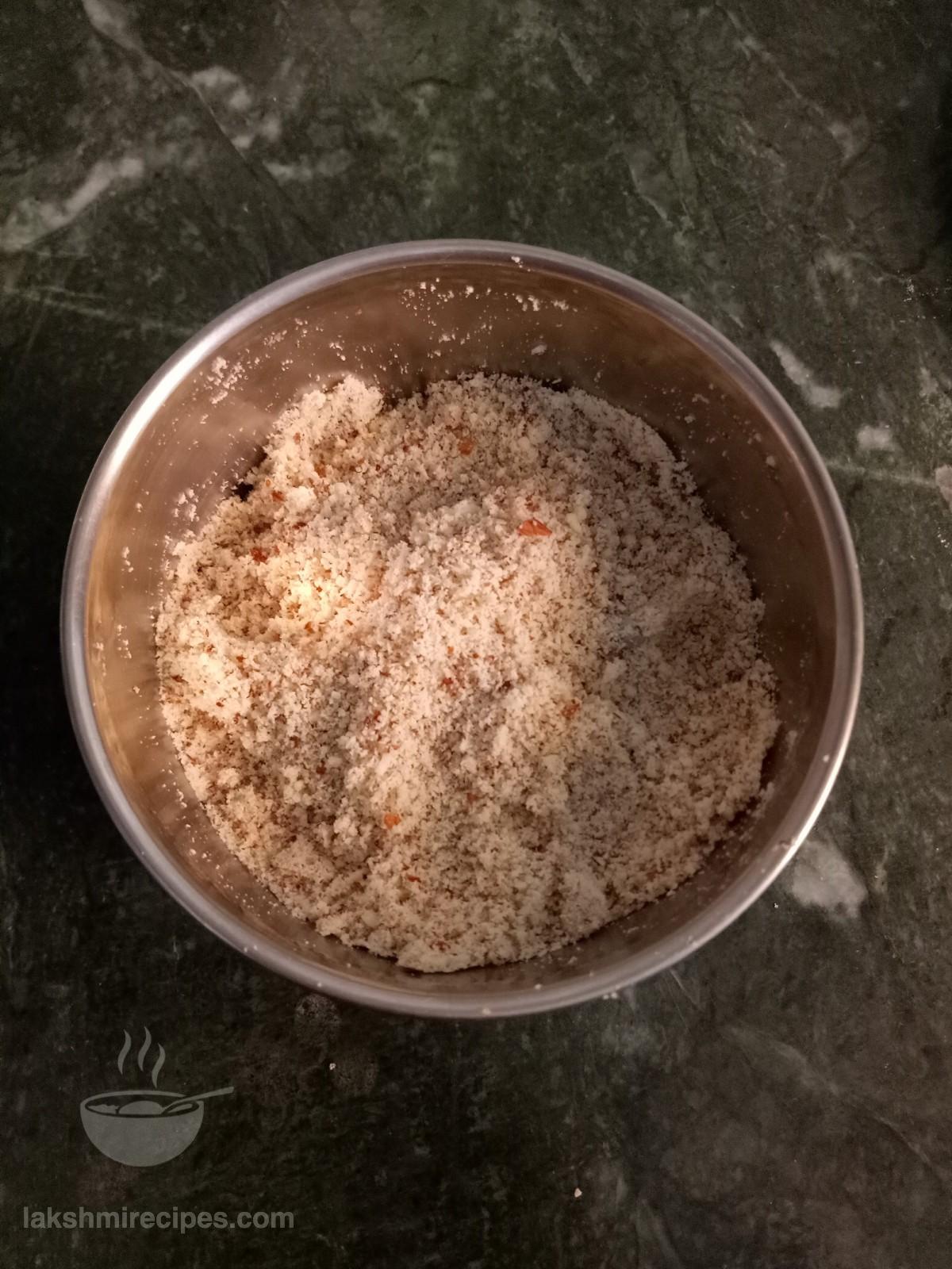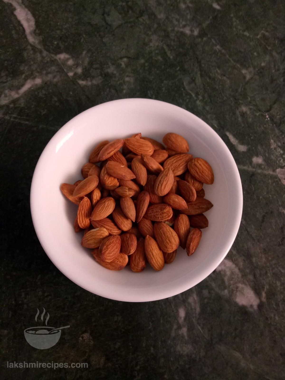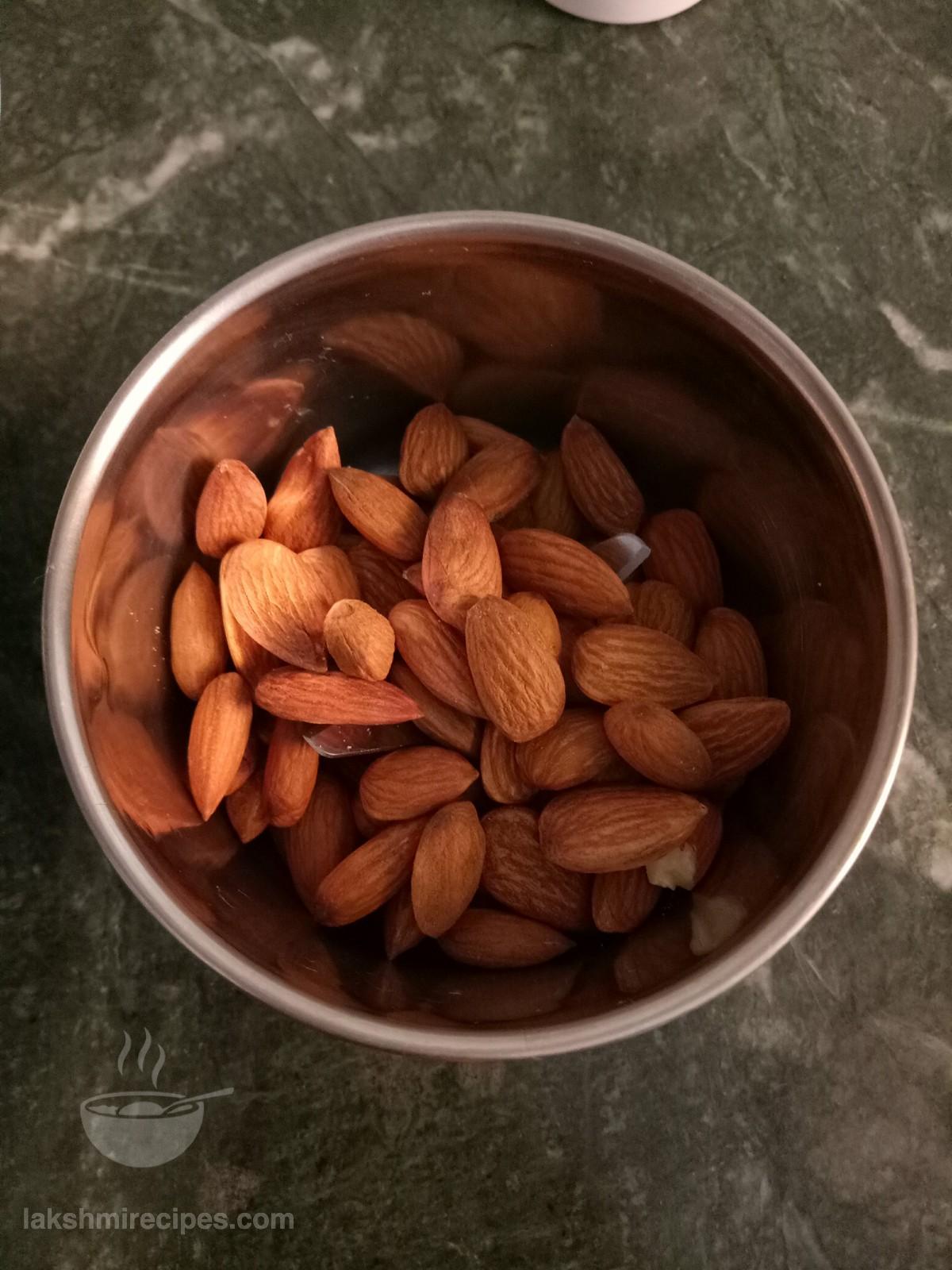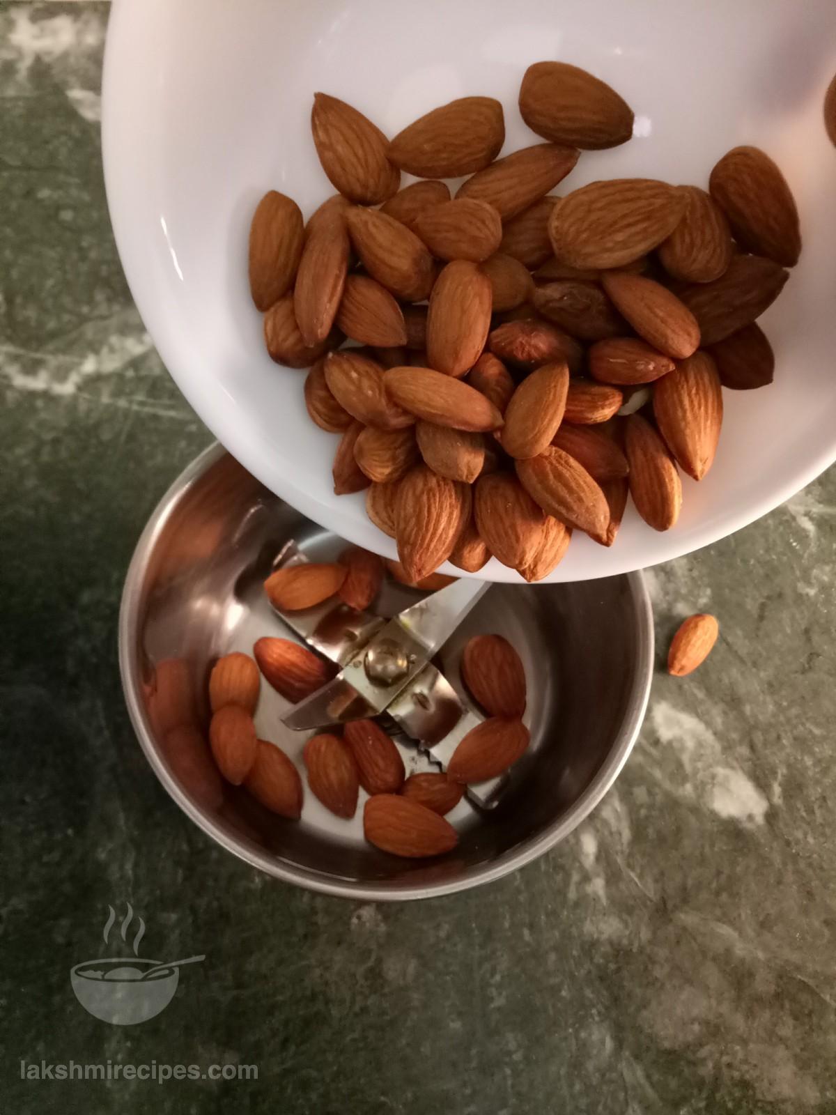 - Meanwhile take the almonds into a mixer jar and grind them to form a fine powder.