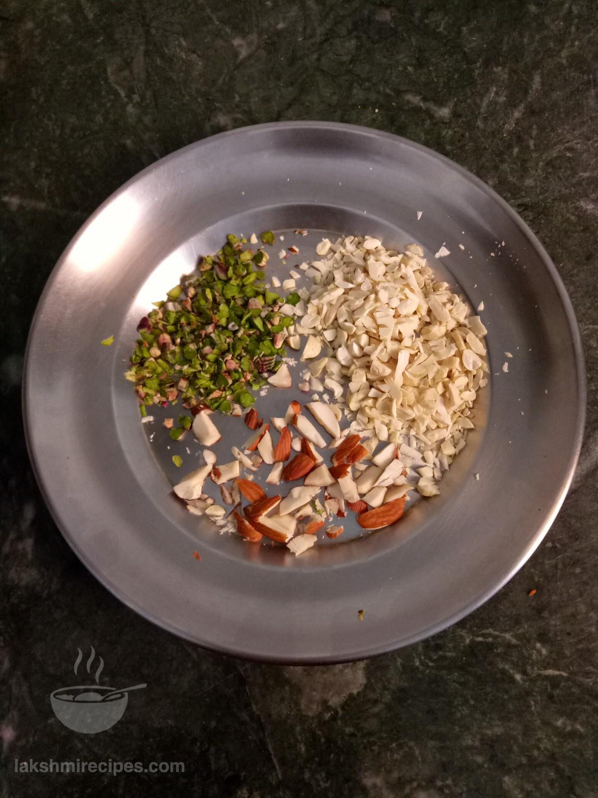 Cooking Time: 25 minutes for making khoya and grinding the almonds + 5 minutes for dry roasting the powder of almonds + 5 minutes for making barfi