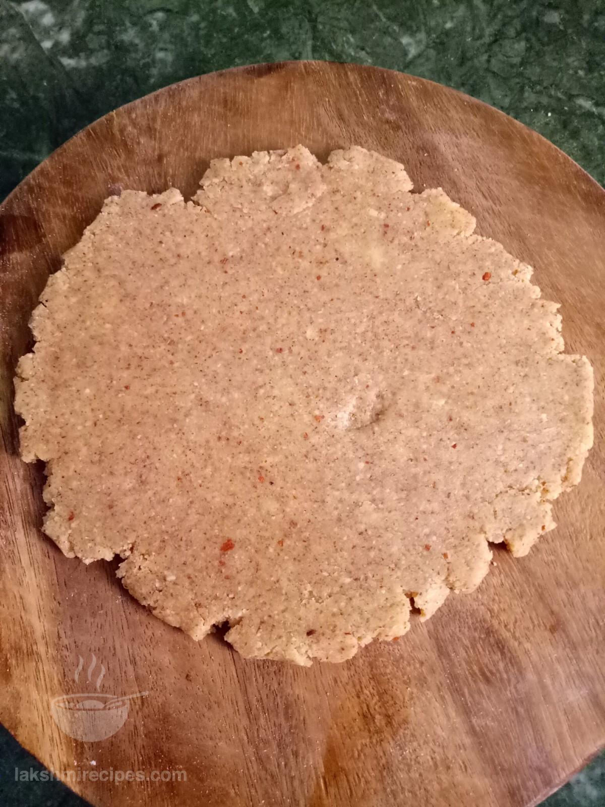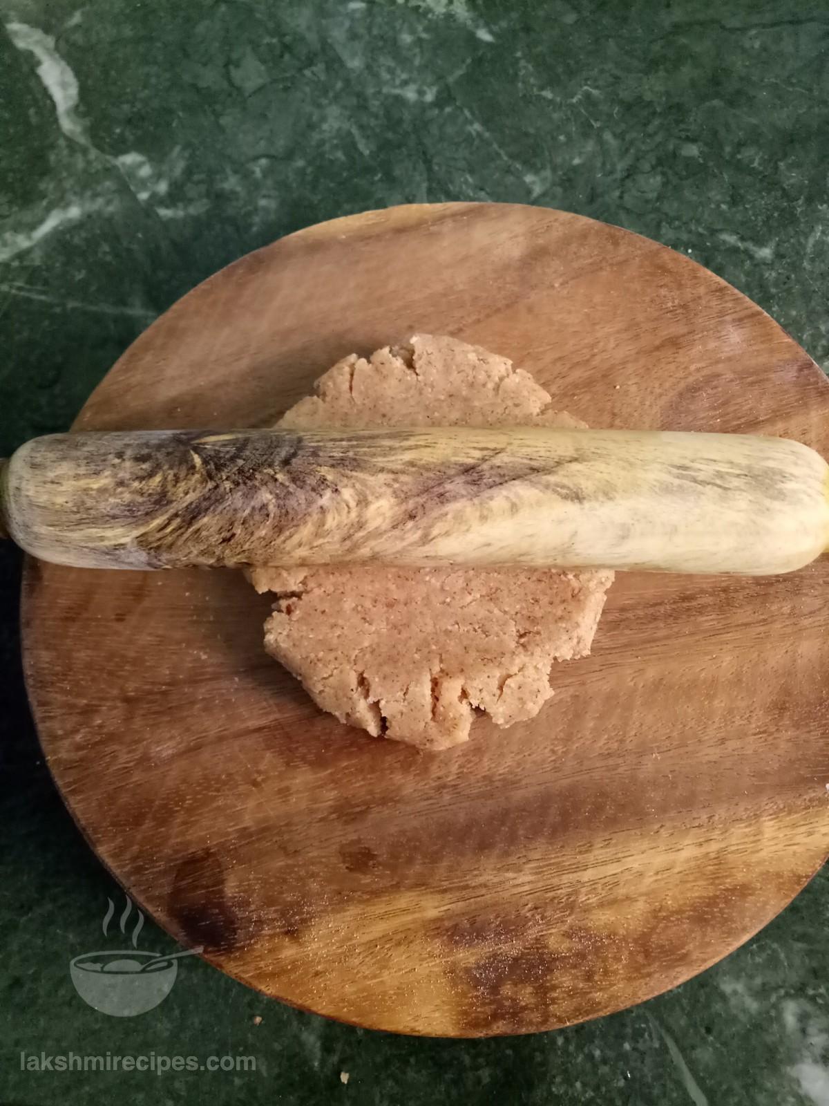- अब इससे बर्फी बनाने केलिए बेलन की सहायता से चपटा बेल लें (जैसा कि नीचे दी गई छवि में दिखाया गया है)। आपको जितनी मोटी बर्फी बनानी हो उतना मोटा बेल लें।