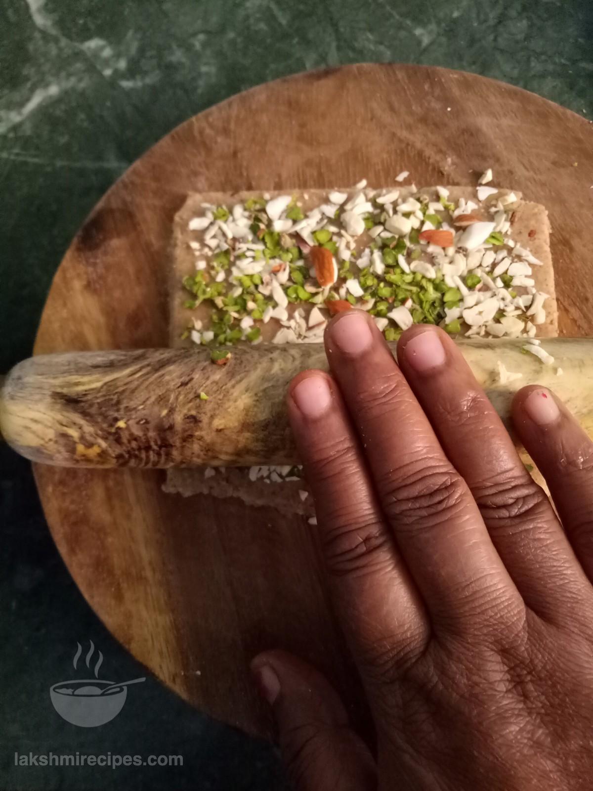 - Now add a layer of chopped dry fruits (cashews, almonds and pistachios) and slightly press them with the help of the rolling pin (as shown in the image below).