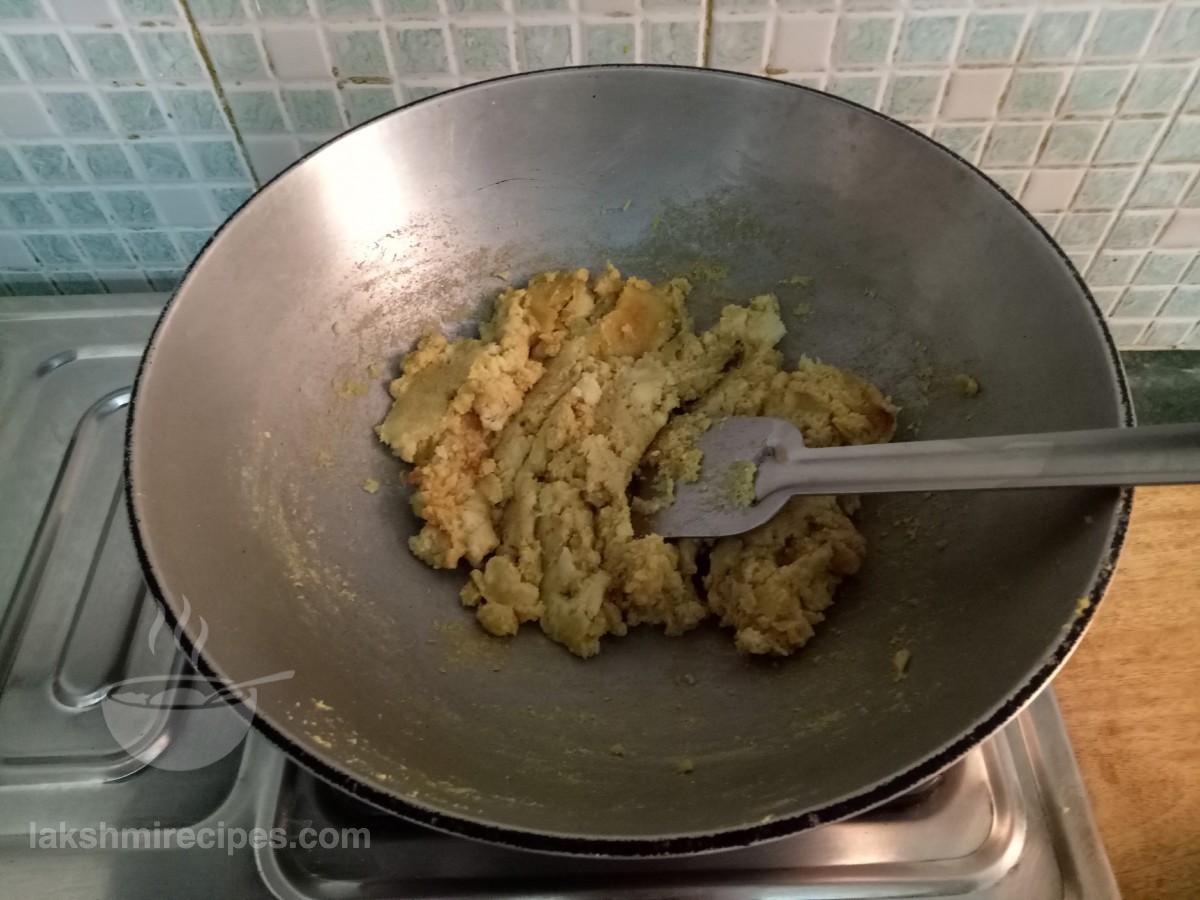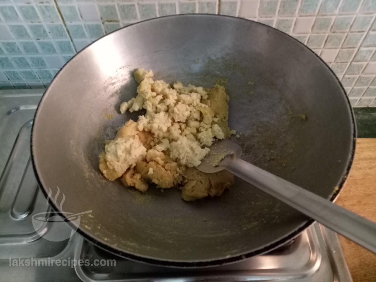 - अब अपने हाथों से खोया या मावा को हल्का सा मसल कर कढ़ाई में डालें। अच्छी तरह से सामग्री मिलाएं और लगातार चलाते हुए मध्यम आँच पर 5 मिनट के लिए सामग्री एक साथ पकाएं।