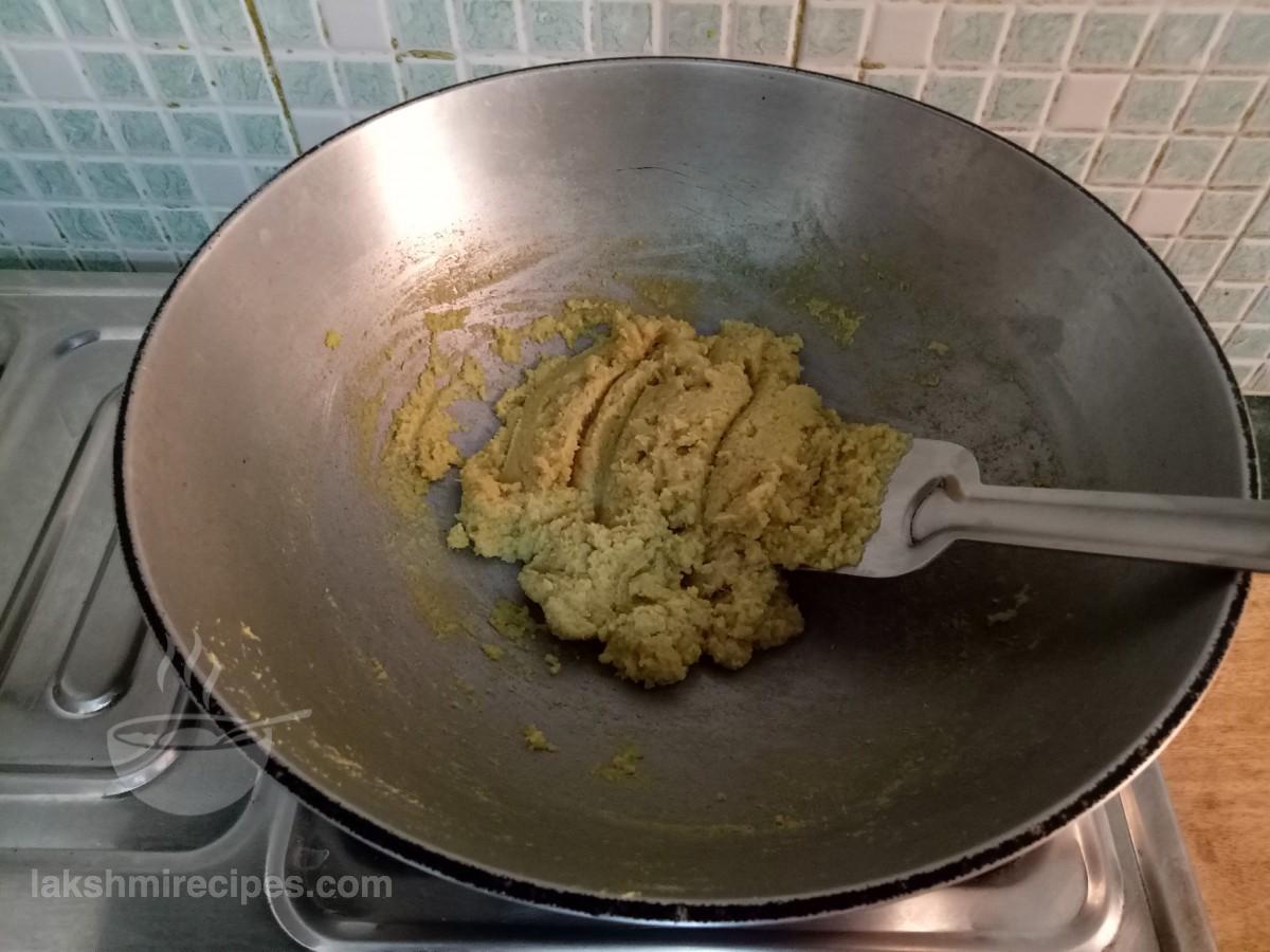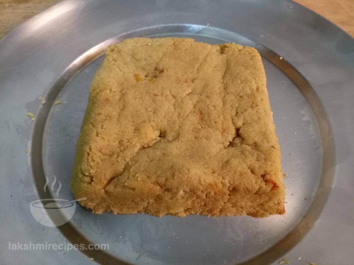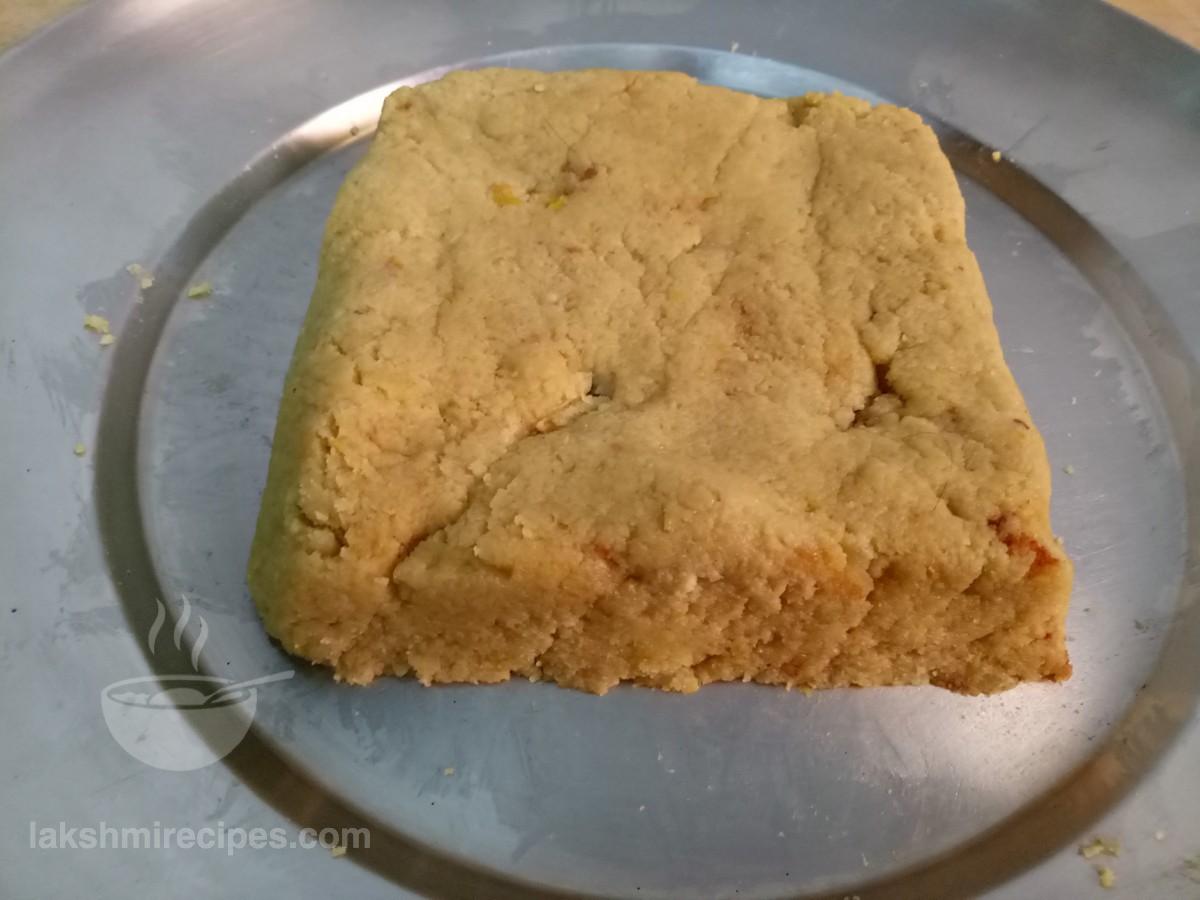 - Transfer the cooked mixture to a plate or tray to cool and set for forming burfis out of it. Allow the hot mixture to cool and set for 1/2 hour.