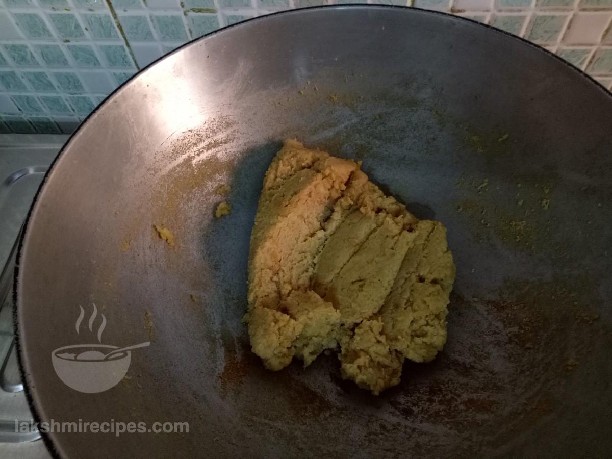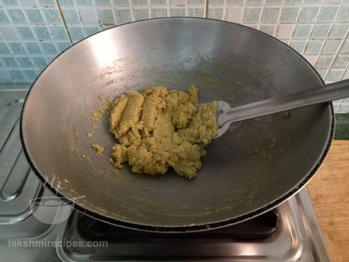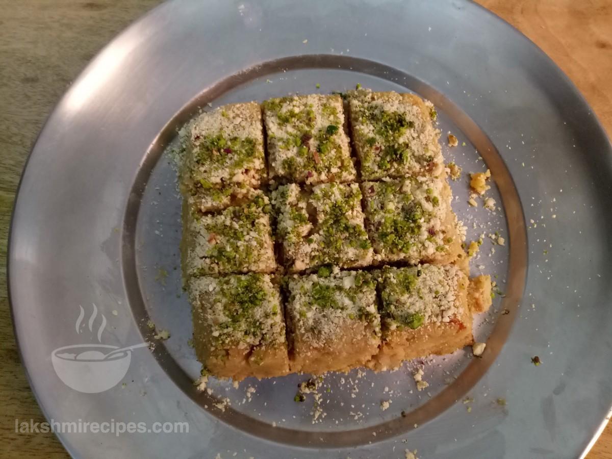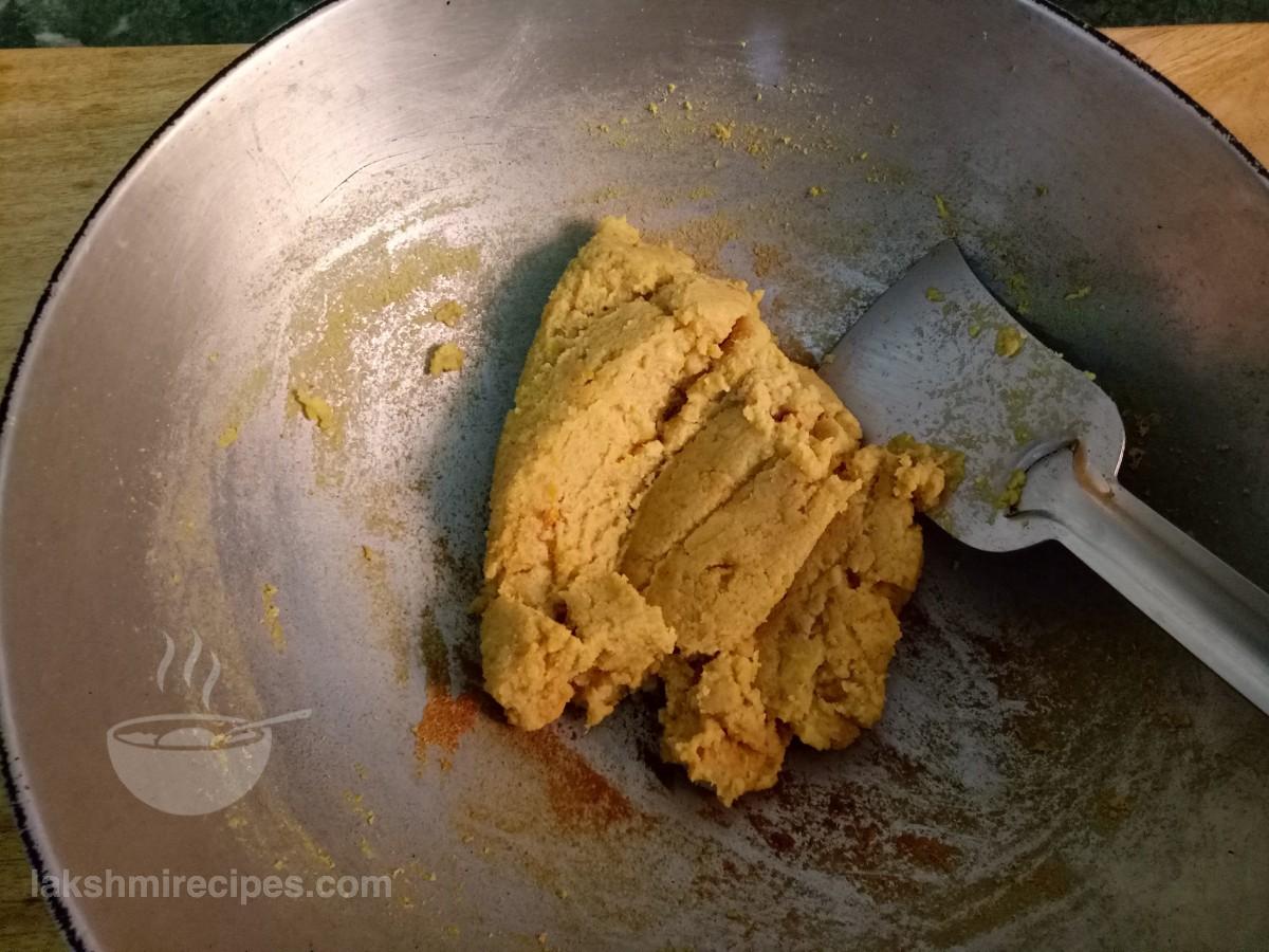 - Transfer the cooked mixture to a plate or tray to cool and set for forming burfis out of it. Allow the hot mixture to cool and set for 1/2 hour.