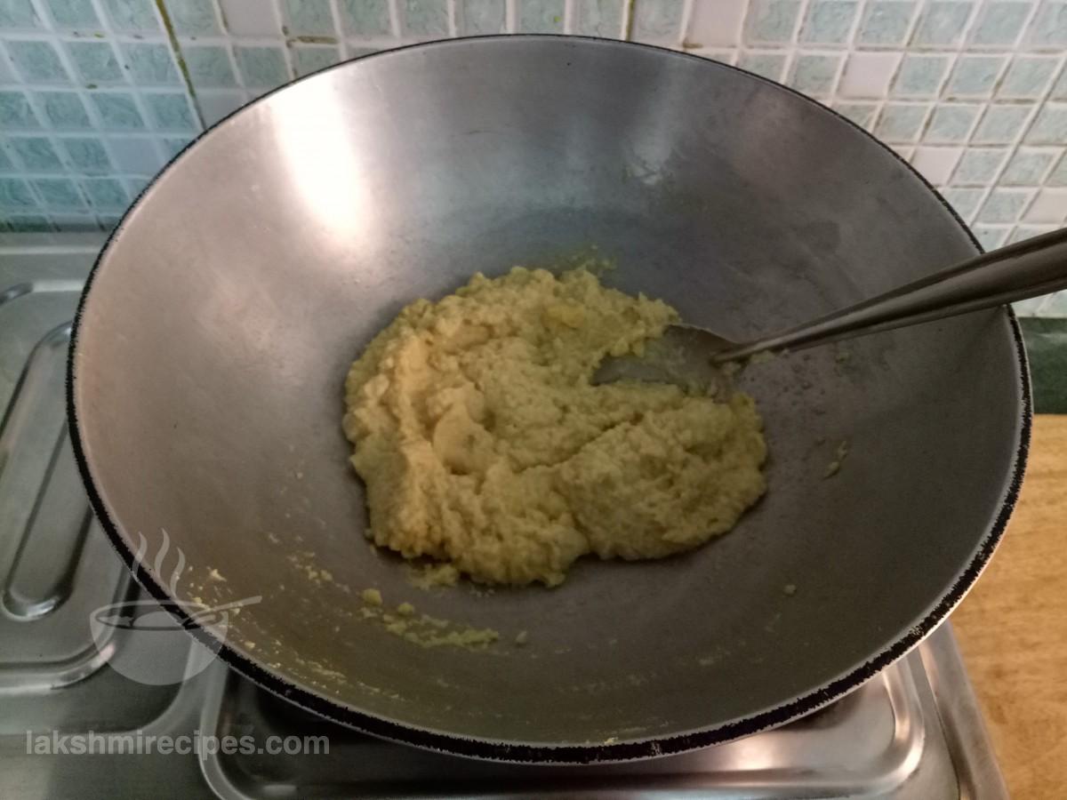 - Add the paste of dry dates or chuhara to the kadhai and lower the flame to medium level. Stir and cook paste for 15 minutes over medium flame only.