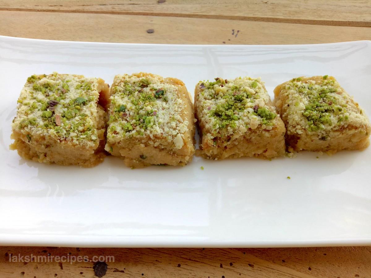 - Press this layer of almonds and pistachios lightly with hands and then cut out burfis of desired shape from the cooled and set mixture. The beautiful and tasty "Chhuhara Ki Burfi" or "Dry Dates Burfi" are ready to be served.