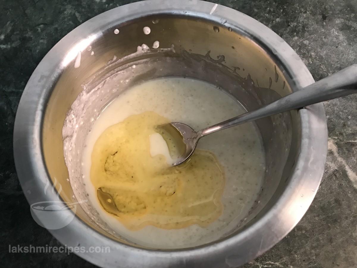 - When the sugar gets completely dissolved then add refined oil to the mixture and mix it well.