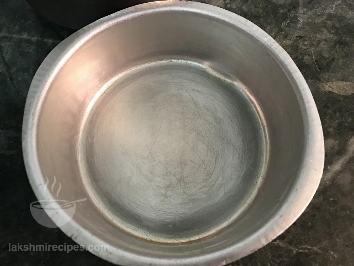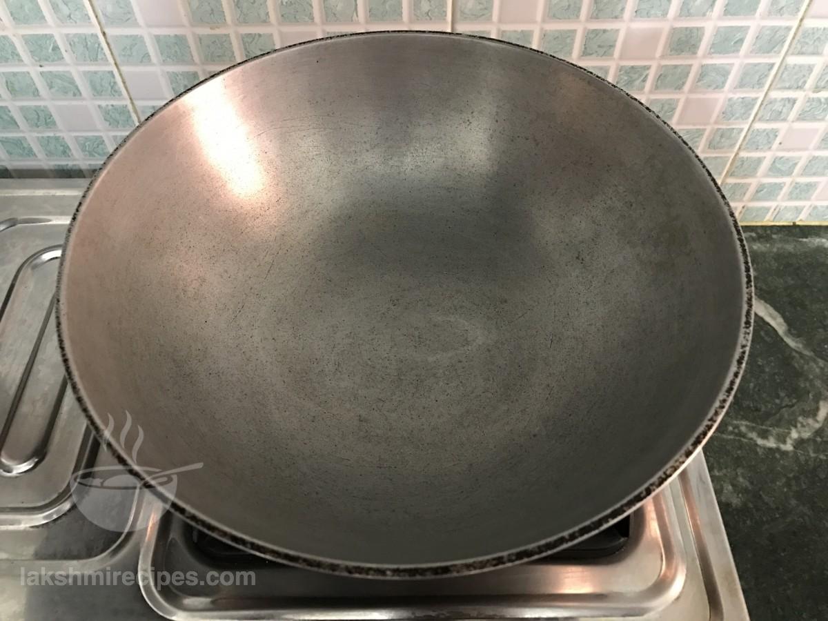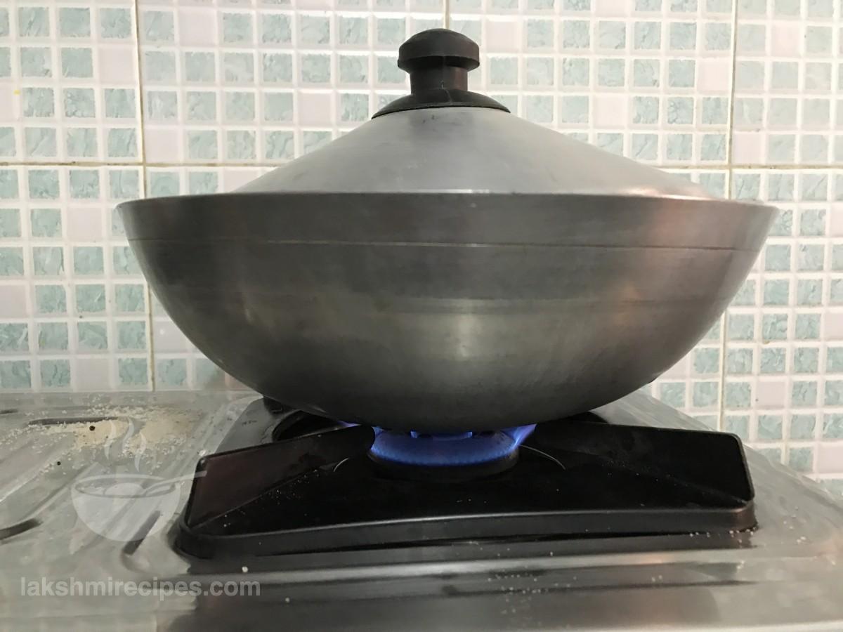 - Now take a thick based kadhai and add 2 cups salt to it. Spread the salt with your hands to make a uniform layer. Place a steel stand over this salt layer (as shown in the image below). This salt will not be wasted and can be used later. Allow the kadhai to be heated for 5 minutes.